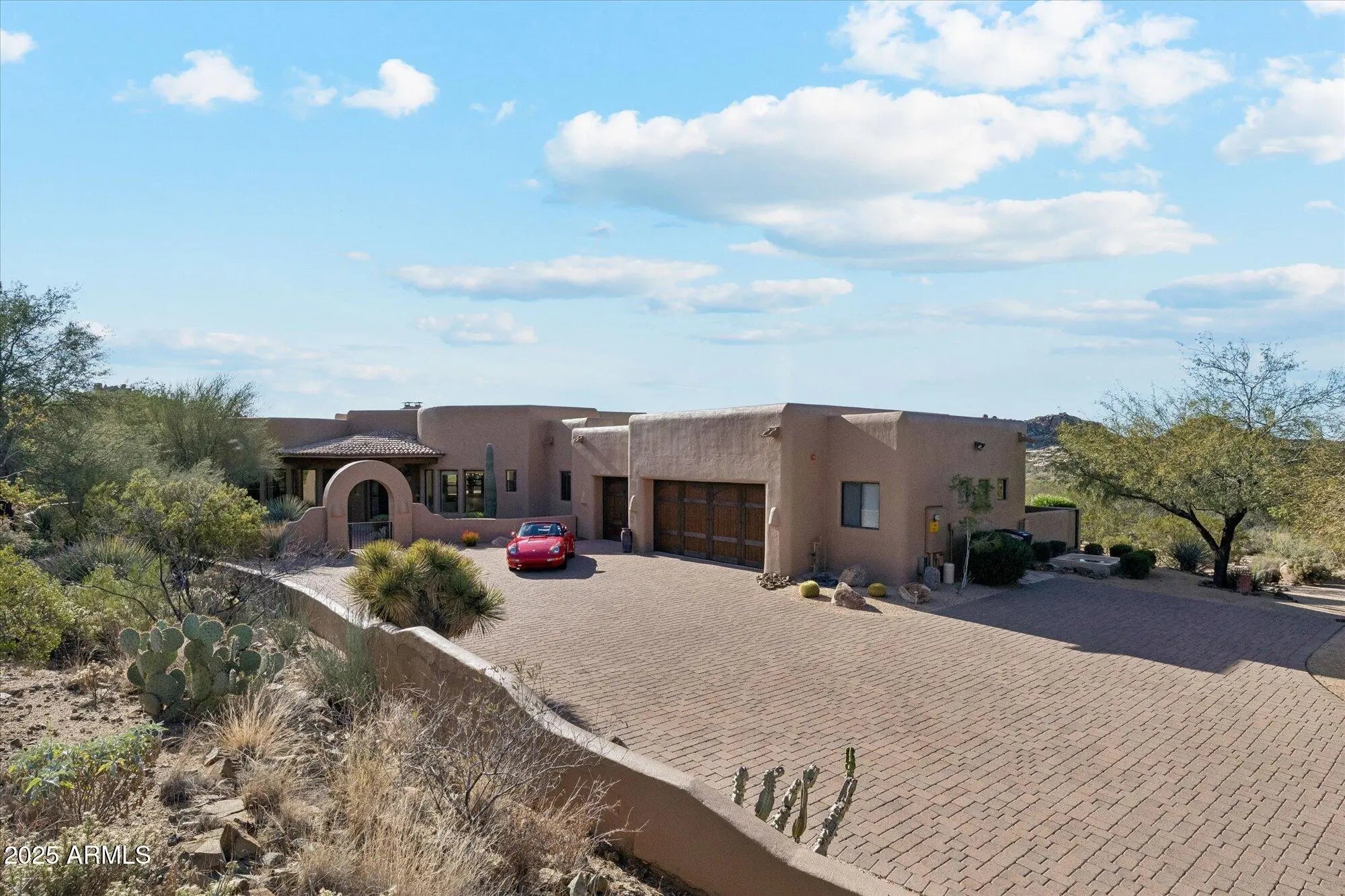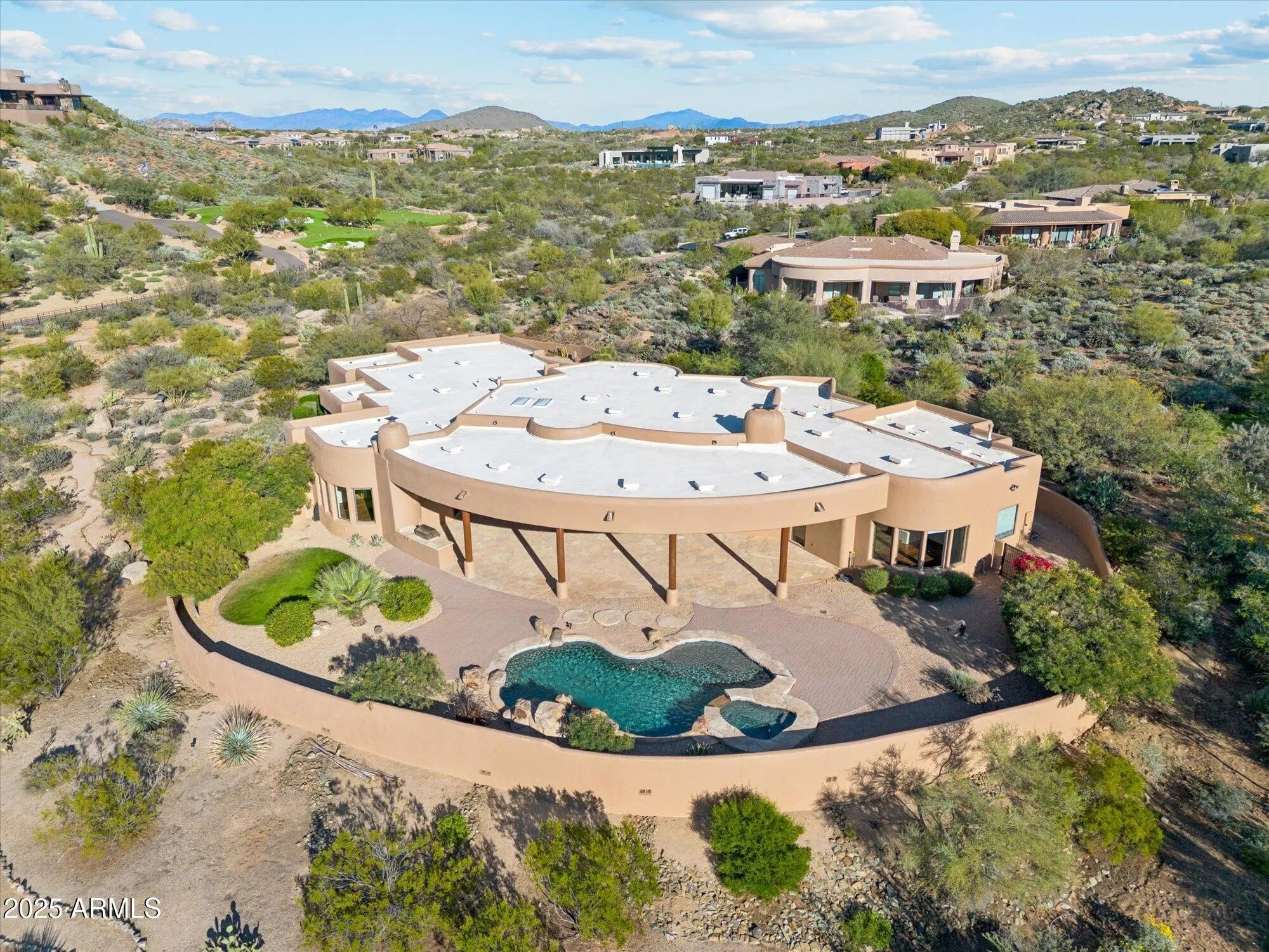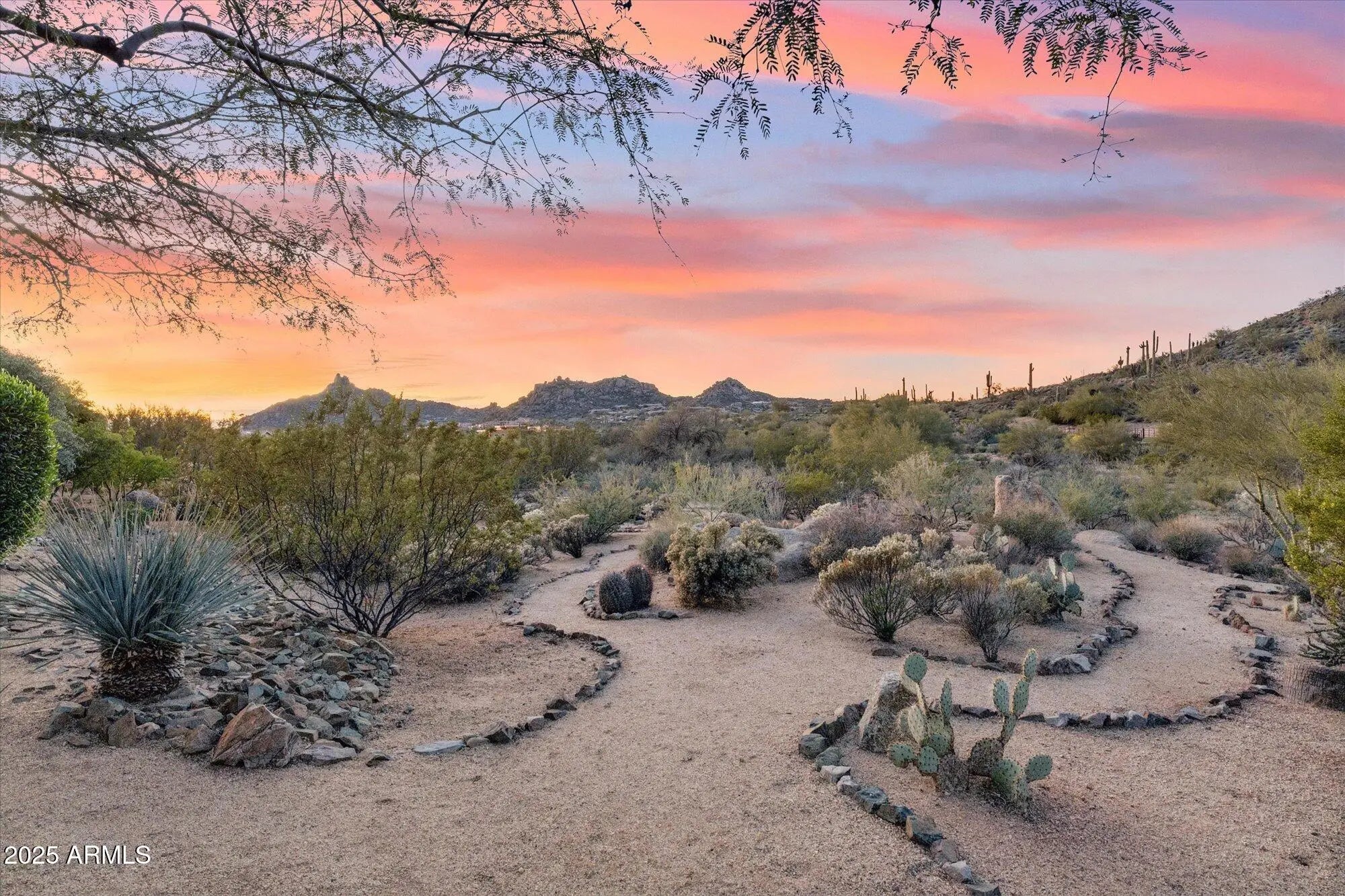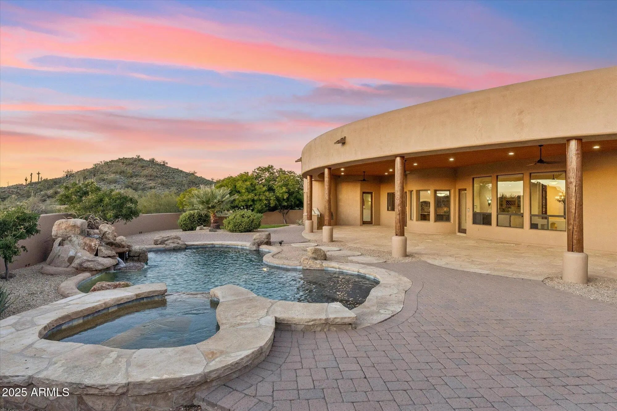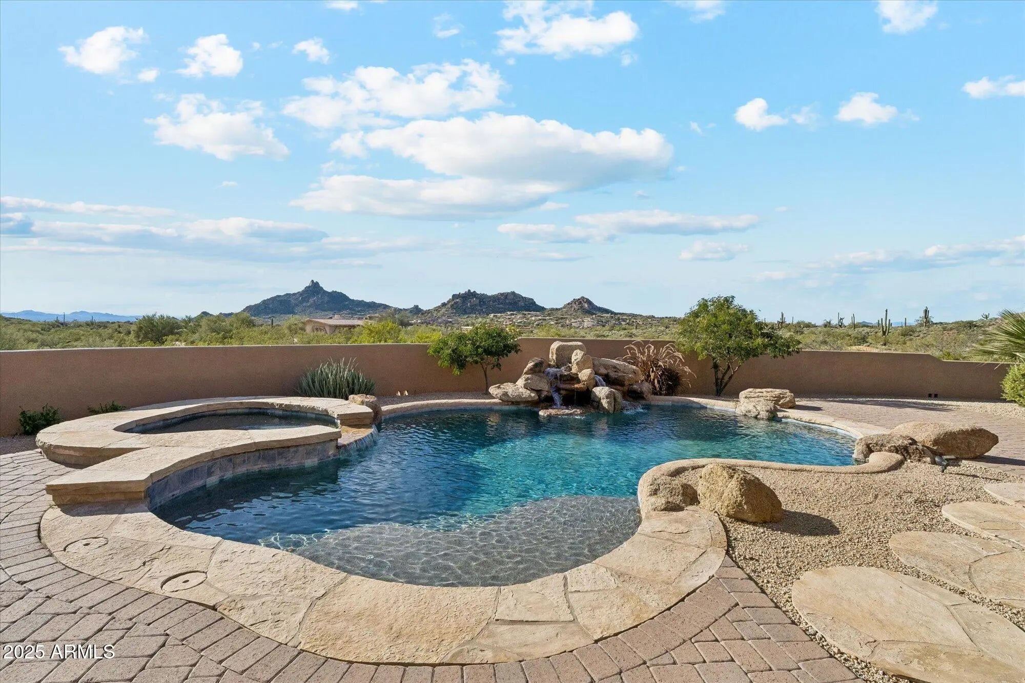 Just updated 5,300+ sq.ft. luxury home in gated community on 2.6 acres! 4 bedroom, 5 bath estate situated in the community of Desert Summit. This exceptional Scottsdale home captures the beauty of the Sonoran Desert with timeless design and effortless indoor/outdoor flow. The spacious great room features high ceilings, custom finishes, and elegant stone and wood details. A gourmet kitchen and private ensuite bedrooms offer comfort and style, while outdoor living areas showcase stunning views of city lights and iconic Pinnacle Peak. Designed for both entertaining and relaxation, this residence combines sophistication, warmth, and a true desert-luxury lifestyle. Additional features include stone lined walking paths on the property, long bricked driveway on a hidden flag style lot. PRIVACY