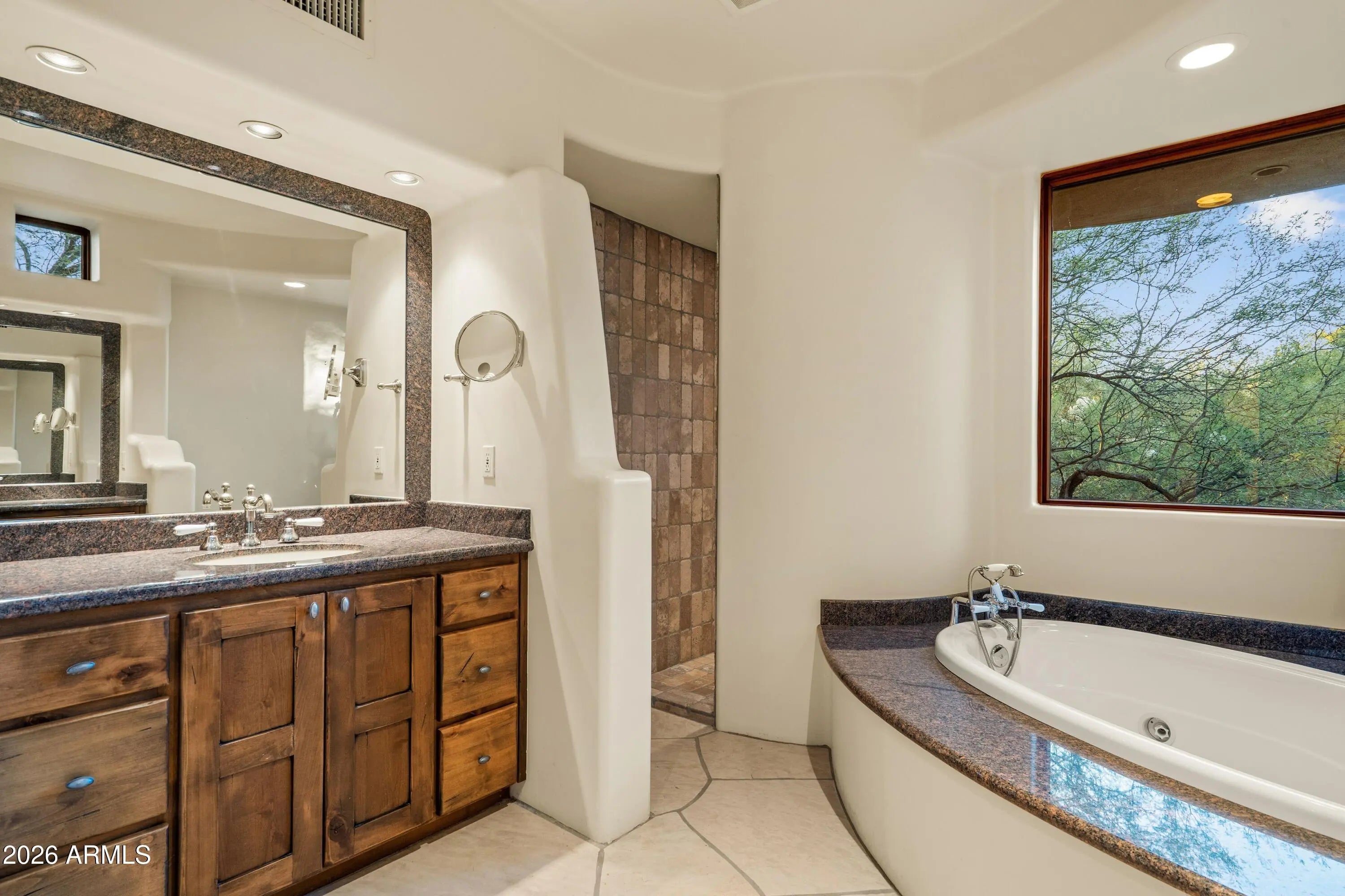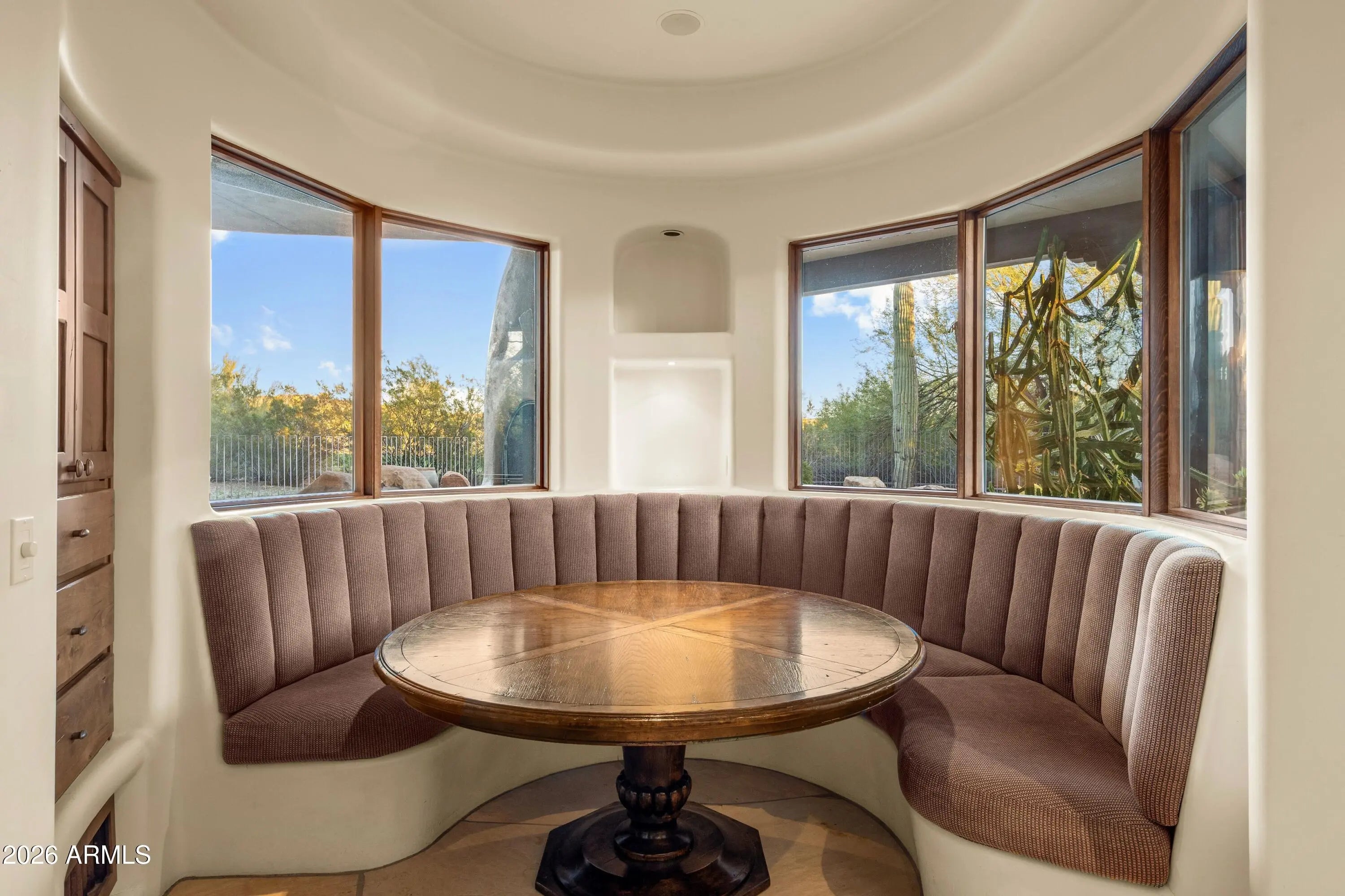 An extraordinary expression of authentic desert design, this residence showcases exceptional creativity and craftsmanship rooted in timeless Southwestern architecture. Thoughtfully designed to accommodate intimate living or larger gatherings, the functional floor plan seamlessly embraces the coveted indoor-outdoor Arizona lifestyle. Privately sited on a tranquil lot surrounded by mature desert vegetation, the home enjoys views of the 12th fairway of The Boulders' renowned golf course. A discreet owner's garage entrance complements a separate, welcoming courtyard entry for guests, setting the tone for privacy and elegance from the moment of arrival. The home opens into a magnificent great room with soaring ceilings highlighted by a dramatic circular skylight featuring a striking viga sunburst detail. A prominent fireplace anchors the space, while a wall of windows invites the natural beauty of the Sonoran Desert indoors. Designed for culinary enjoyment and effortless entertaining, the generous open kitchen features a central island, casual dining area, artistic ceiling skylight and viga details, and expansive windows. A charming Dutch door provides direct access to the outdoor patio, enhancing the home's fluid connection to its surroundings. The main-level Primary Suite offers a peaceful retreat with exceptional privacy, a spa-inspired bath, and a private outdoor patio. Two additional guest ensuites ensure comfort and seclusion, each thoughtfully positioned to capture stunning desert vistas. A graceful curved staircase leads to an upper-level guest ensuite opening to balcony patio and a dedicated office. From this elevated vantage point, enjoy a unique perspective of the home's architectural artistry and the captivating desert setting. The outdoor living spaces are truly exceptional, featuring covered areas for both lounging and dining, a Kiva fireplace, and a built-in barbecueideal for entertaining against a backdrop of natural desert beauty. A raised spa spills into a lagoon-style pool framed by dramatic boulder outcroppings and majestic saguaro cacti, creating a luxurious, resort-like oasis. Throughout the home, exquisite handcrafted finishes abound, including carved wood cabinetry and built-ins, flagstone and hardwood flooring, metal fixtures, and intricate ironwork details, all reflecting the home's authentic Southwestern character. Located within The Boulders community, positioned along the border of North Scottsdale and Carefree, this historic enclave is one of the area's first planned communities. Set among preserved rock outcroppings and pristine open desert, it protects and celebrates the authenticity of the Sonoran Desert. Members enjoy access to a world-class golf club featuring two championship 18-hole courses, as well as an on-site resort, spa, and multiple dining destinations. Relish the peacefulness of open desert living while maintaining convenient access to shopping, dining, and travel. Make this remarkable Arizona retreat your home and savor breathtaking sunsets as each day comes to a closetrue desert paradise awaits.
