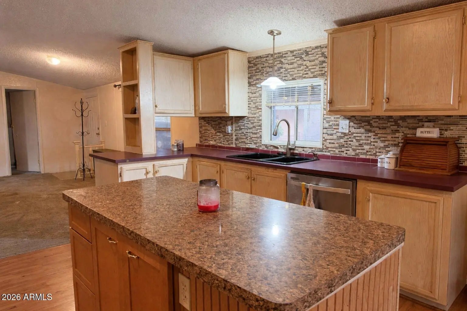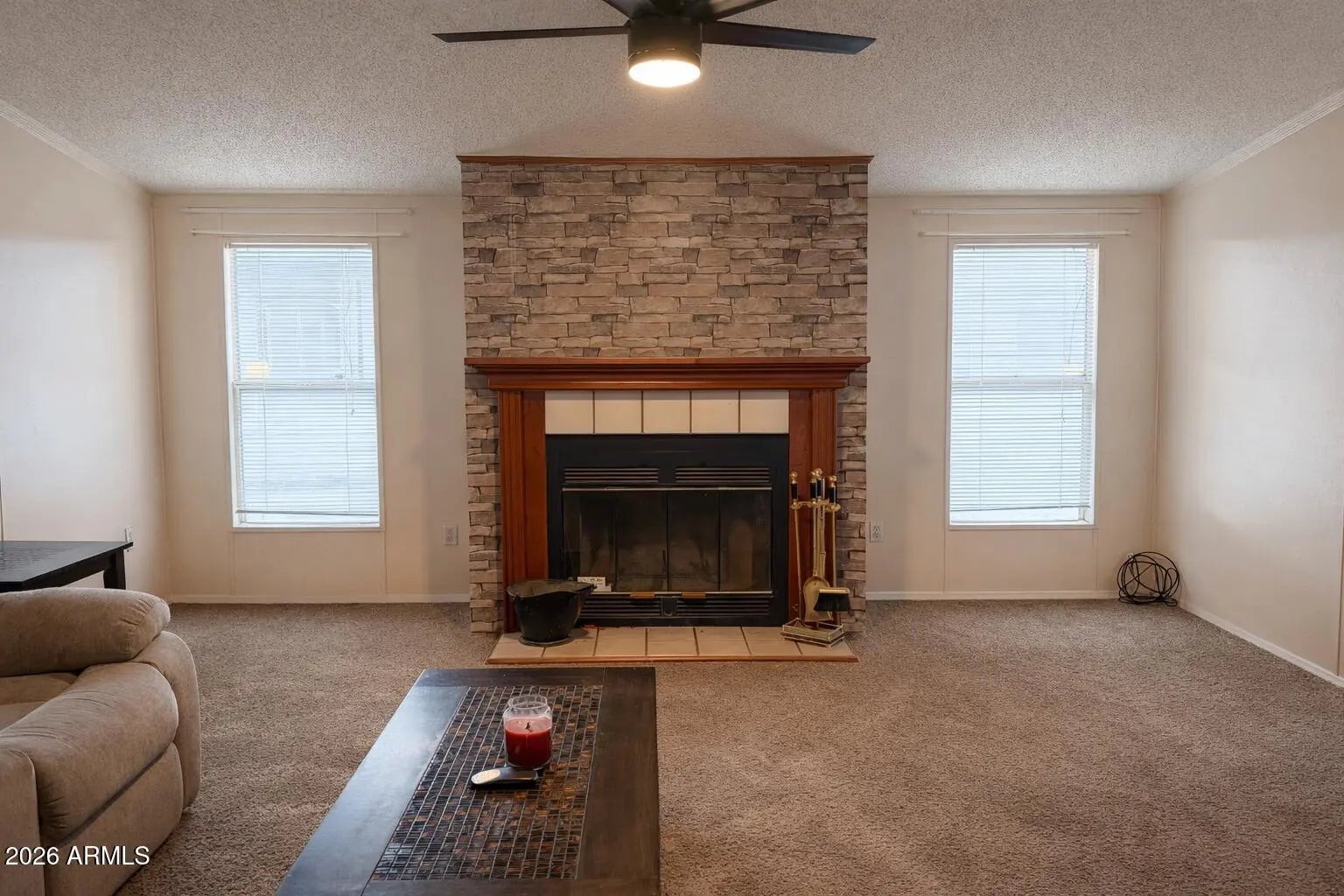 Spacious manufactured home in a gated, professionally managed Apache Junction 55+ community. Located on a large lot with a two-stall carport, attached storage shed, and low-maintenance turf backyard. Inside, the home is bright and open with a flexible layout. The kitchen features stainless steel appliances and a large island, offering excellent prep space and storage while remaining open to the main living areas. The living room includes a cozy fireplace. The split floor plan offers three bedrooms and two bathrooms. The primary suite features an en-suite bath with soaking tub, separate shower, and walk-in closet. Secondary bedrooms are generously sized with ample closet space.