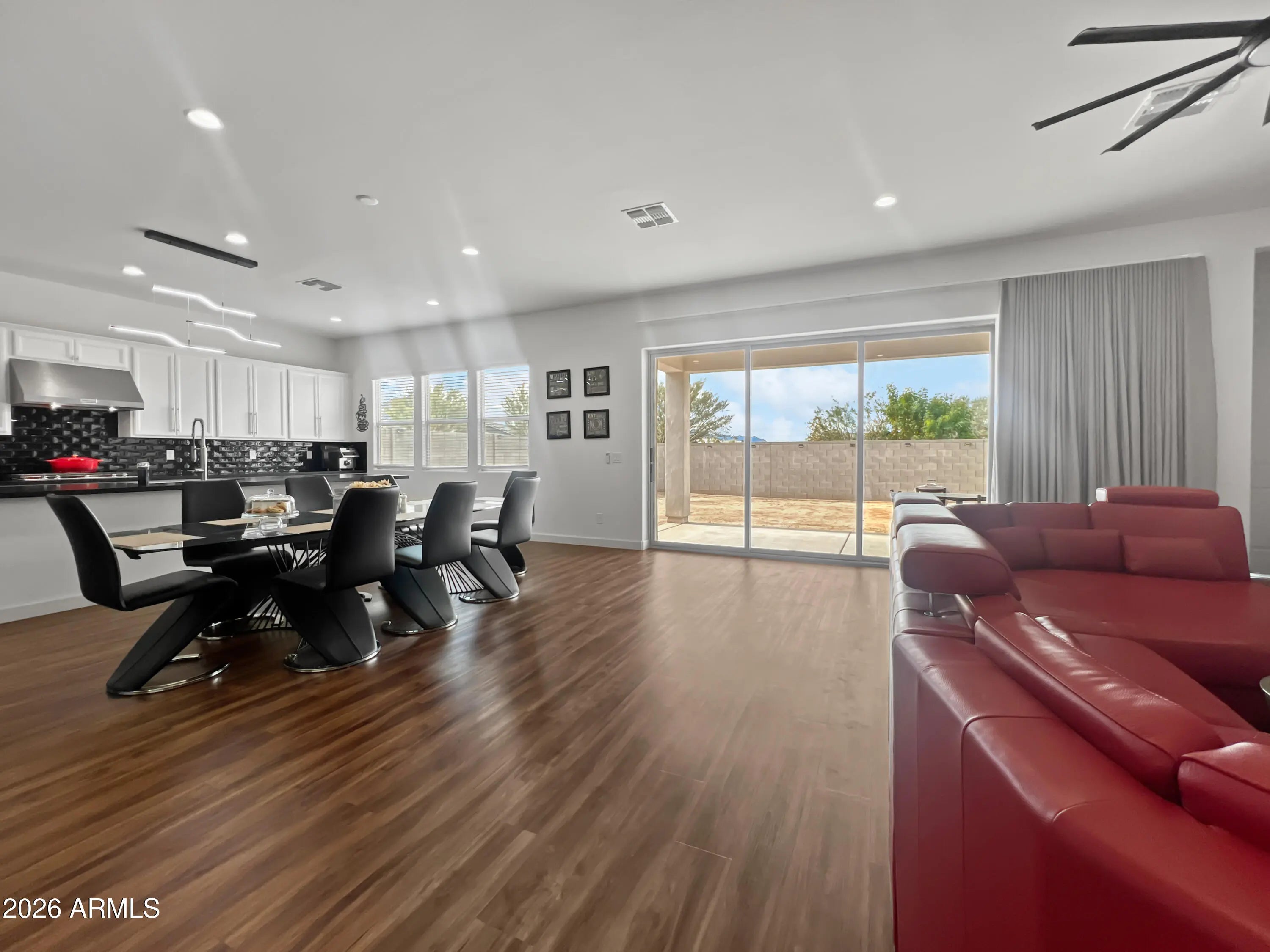 Beautifully maintained and superbly designed for modern living, this upgraded home offers a welcoming covered porch, stunning foyer, and an expansive great room that flows into the casual dining area and large covered patio. The well appointed kitchen features a generous center island, ample cabinetry, a walk in pantry, and a modern backsplash ideal for everyday living and entertaining. A flexible bonus space provides options for a home office or media room. The private primary suite is complemented by a spa inspired bath and oversized walk in closet. Thoughtful upgrades include new flooring and baseboards, complete window coverings, upgraded hardware, wood countertops in drop zones, ceiling fans, and bidet toilets professionally installed with reinforced plumbing and dedicated electrical Additional highlights include a water softener with RO system, motorized patio curtain, solar backyard lighting, no homes behind with mountain views, and a rare four car tandem garage with exterior access.