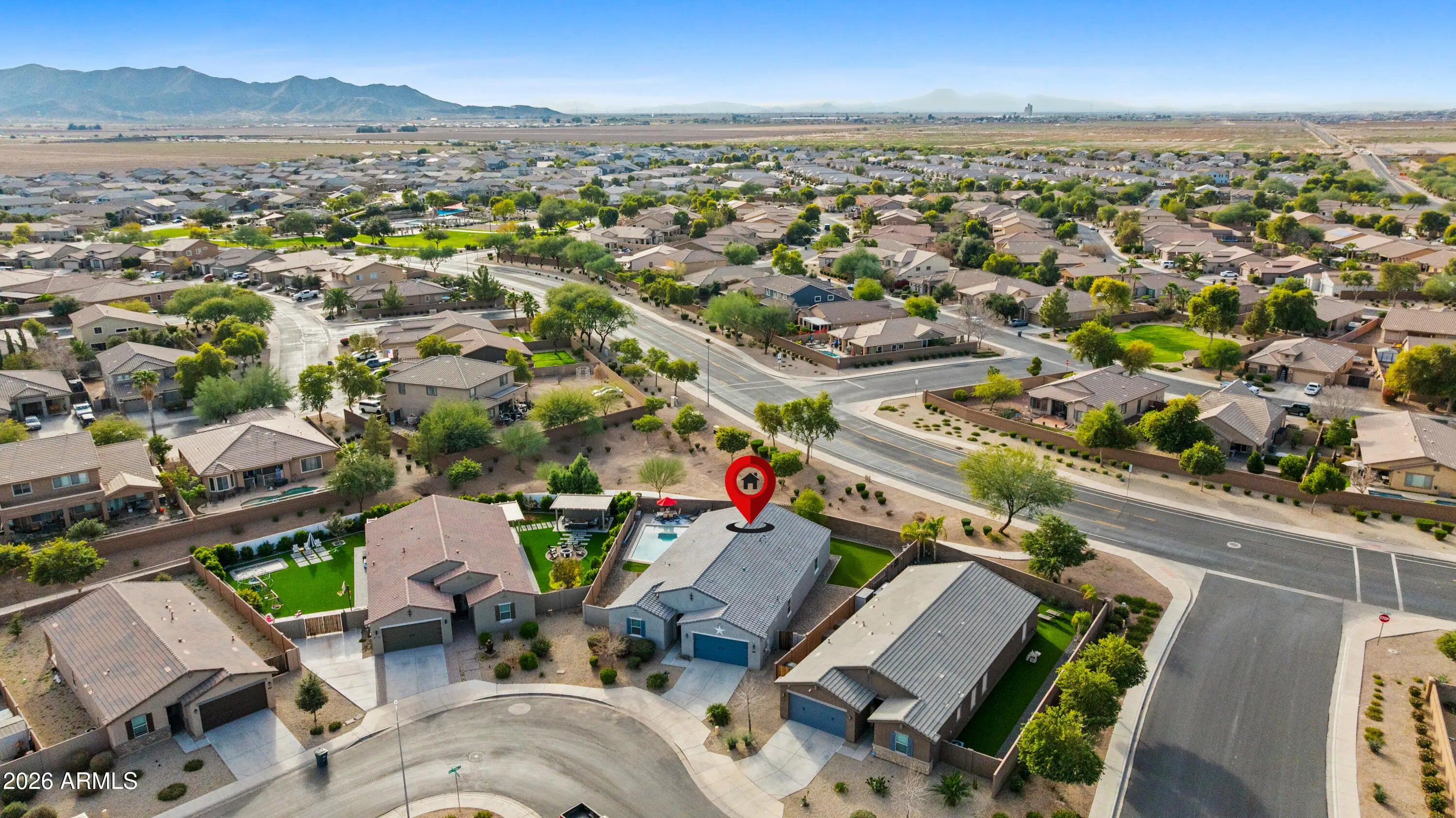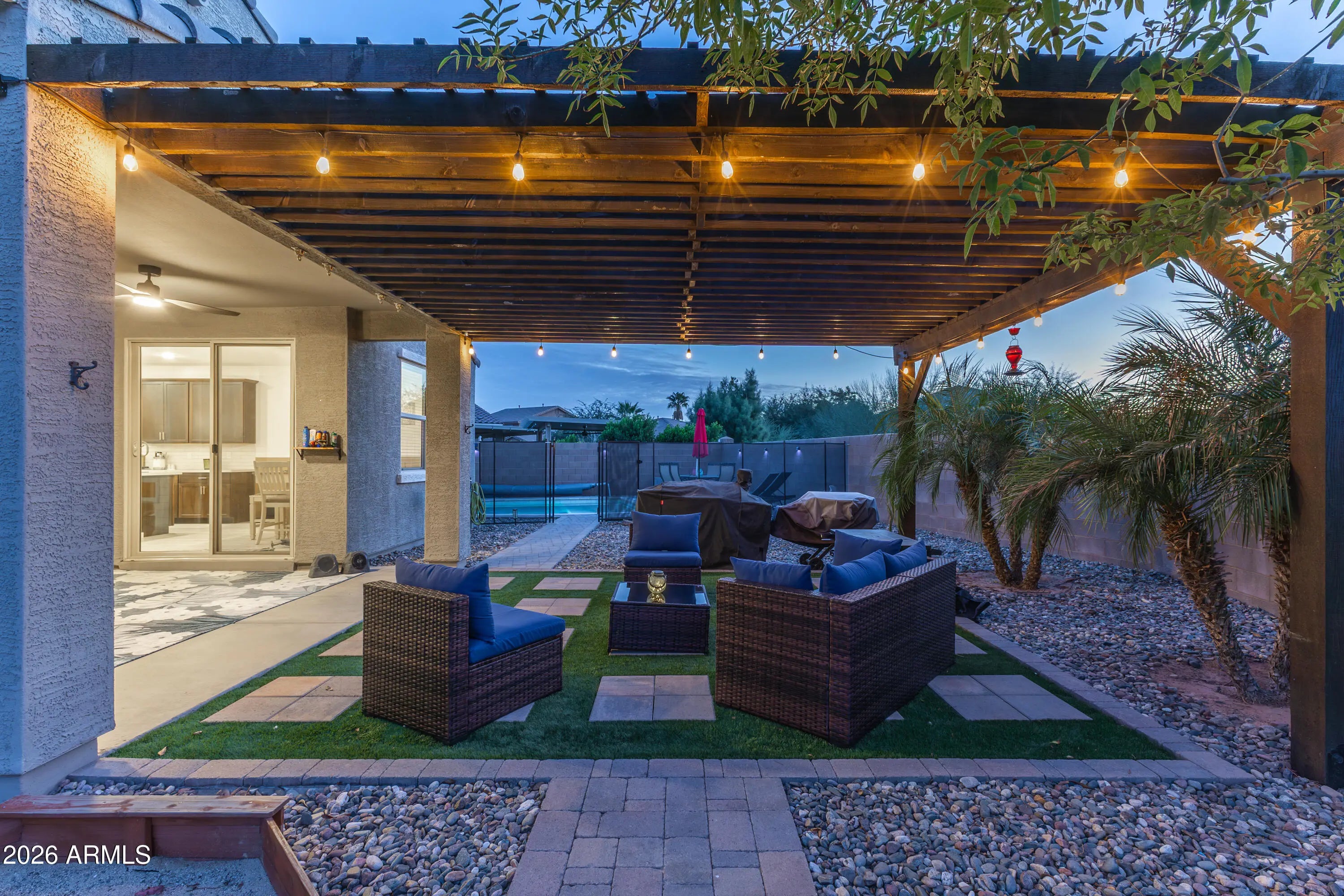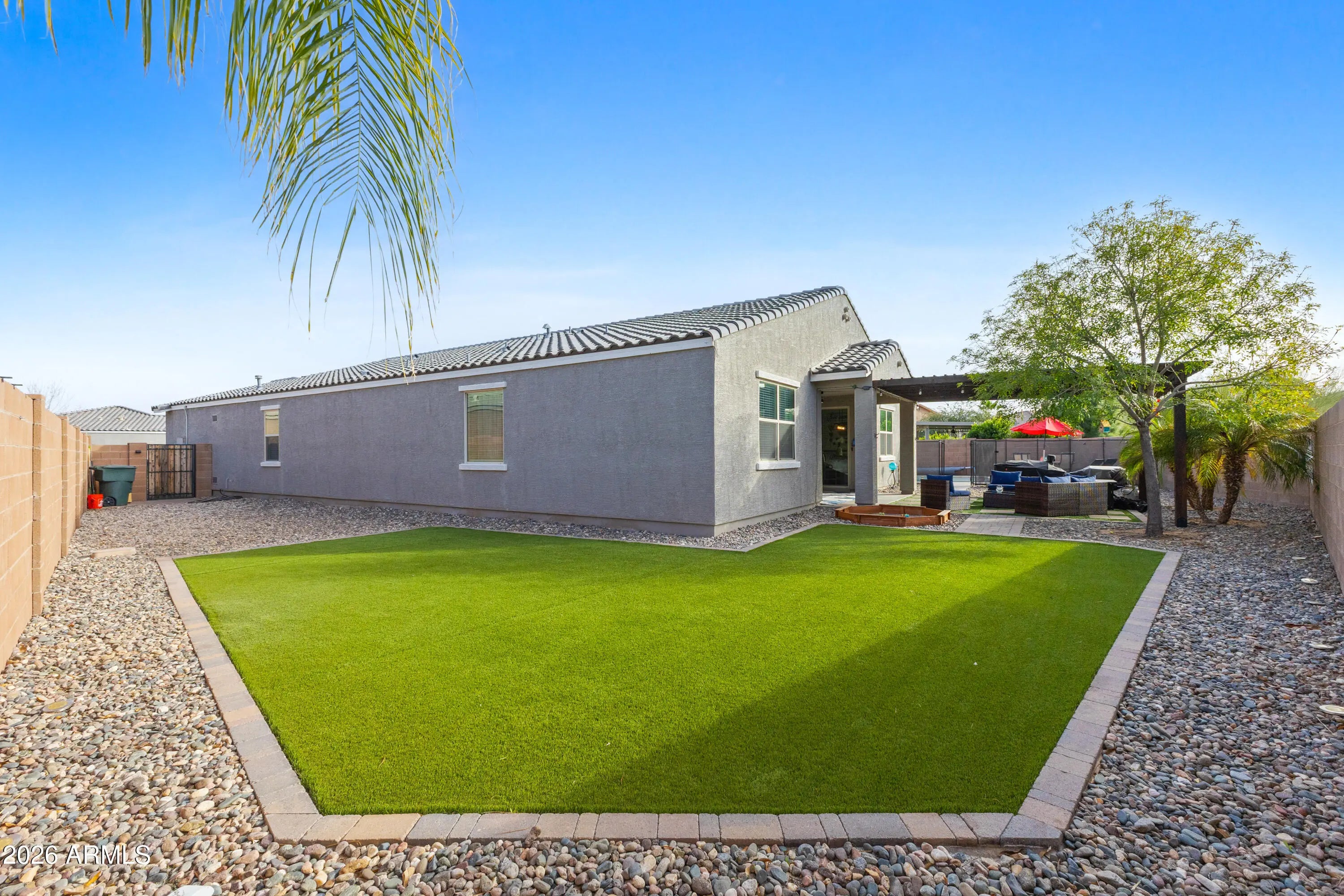 Welcome to your Casa Grande oasis! This 2020 single-story home is move-in ready with 5 bedrooms, 3 baths, and a 3-car tandem garage. The open layout makes entertaining easy, with a spacious kitchen featuring rich cabinetry, a large island, and stainless appliances. Relax in your private primary suite with a soaking tub and walk-in shower. Step outside to your backyard retreat — a heated, fenced pool, pergola-covered patio, and low-maintenance turf yard perfect for Arizona living. Located close to parks, shopping, and dining, this home truly has it all.