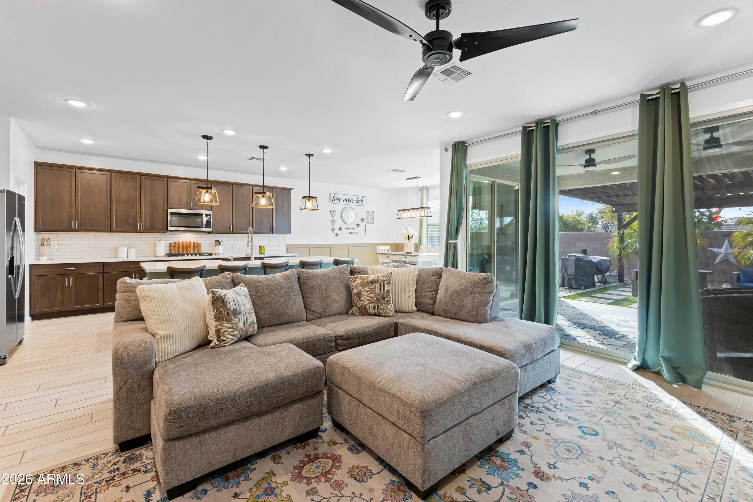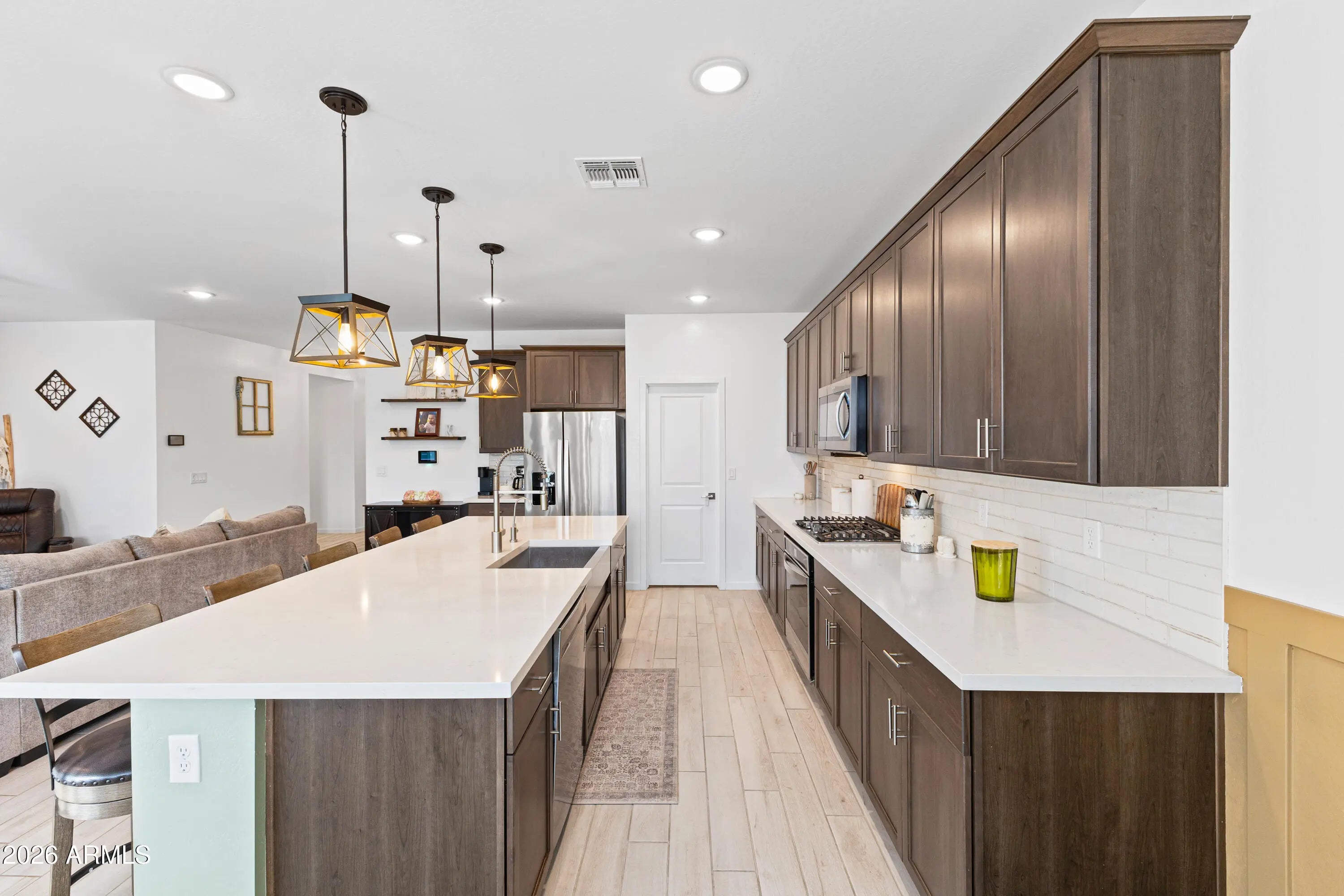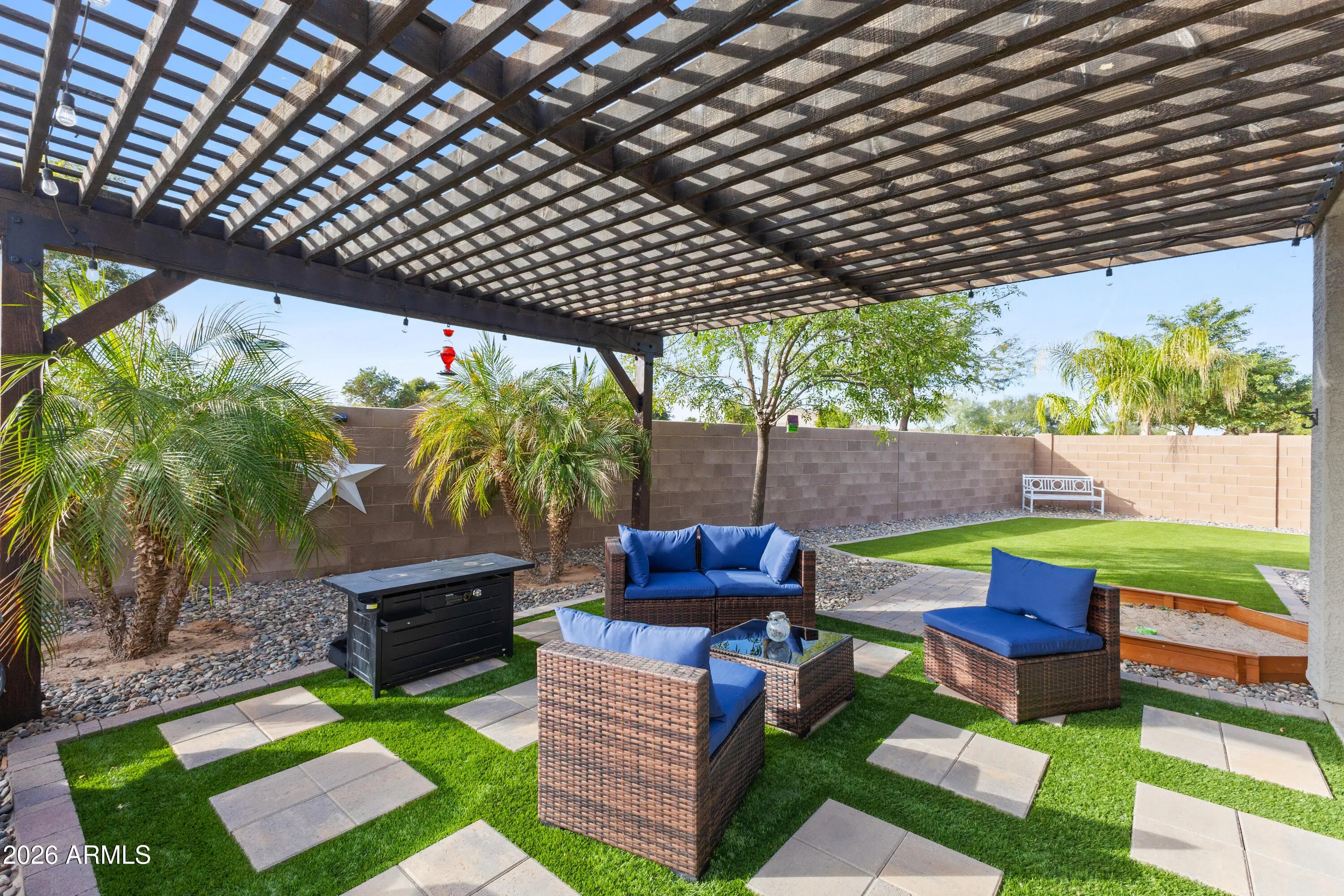 Welcome to your Casa Grande oasis! This 2020 single-story home is move-in ready with 5 bedrooms, 3 baths, and a 3-car tandem garage. The open layout makes entertaining easy, with a spacious kitchen featuring rich cabinetry, a large island, and stainless appliances. Relax in your private primary suite with a soaking tub and walk-in shower. Step outside to your backyard retreat — a heated, fenced pool, pergola-covered patio, and low-maintenance turf yard perfect for Arizona living. Located close to parks, shopping, and dining, this home truly has it all.