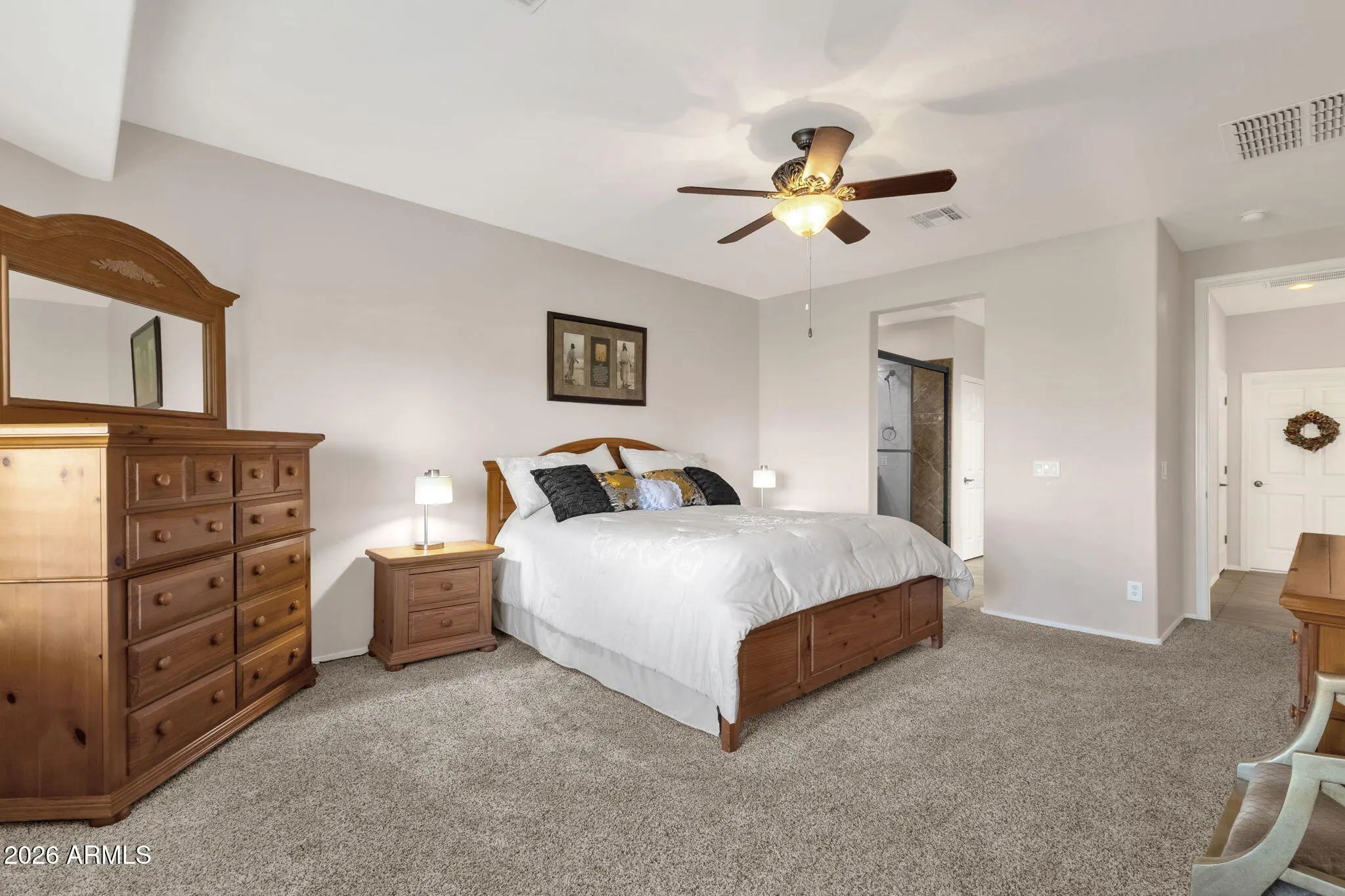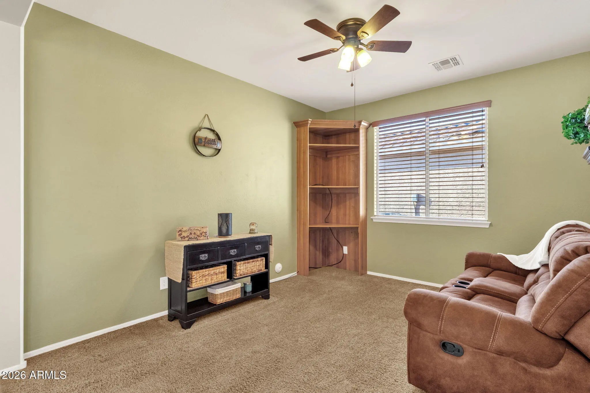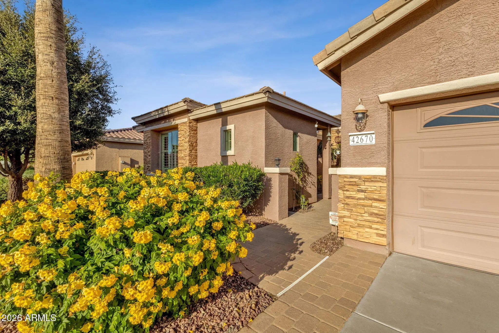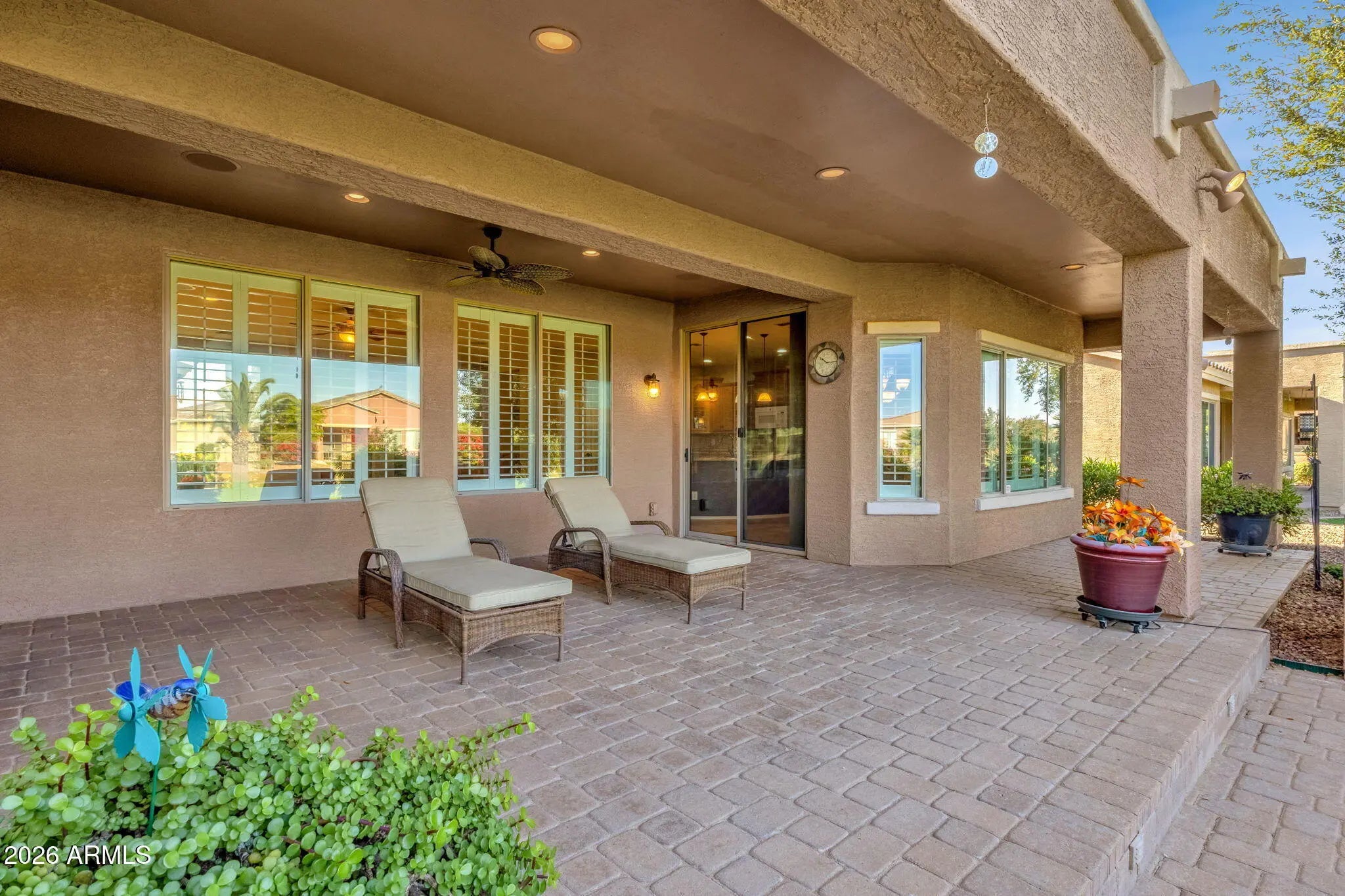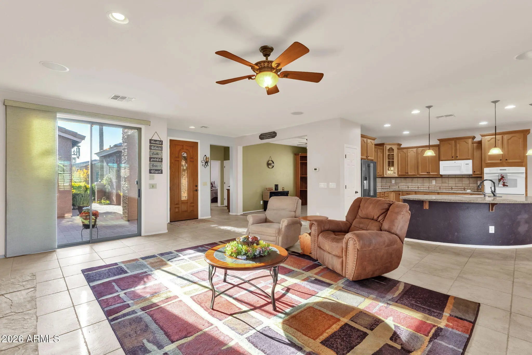 ASSUMABLE LOAN w/ Interest Rate UNDER 2.5% for qualified buyer! This Violet floor plan offers over 2,200 sq ft with 2 Bed/2 Bath/Den plus a separate guest CASITA featuring 1 Bed/1 Bath, built-in cabinets, tile, shutters with private front door leading to front courtyard. Situated on a PREMIUM north/south facing lot backing to a GREENBELT. Enjoy peaceful mornings on the extended covered patio with views of open grass, brick pavers, and pre-plumbed GAS grill. Expansive great room with stacked stone GAS fireplace, shutters, recessed lighting, and built-in speakers. Beautiful kitchen with staggered cabinets, pendant lighting, and large granite island. HUGE primary bedroom with patio access, luxury bath, walk-in shower, dual sinks, and walk-in closet. Dream laundry with cabinets and sink. EXTERIOR & LOCATION - PREMIUM Lot Overlooking Grass Greenbelt w/Walking Path - North/South Facing Lot - Located within the Center of the Community - Extended Covered Paver Patio- Pre-plumbed for GAS Grill - Mature Landscaping - Retainer Wall w/Gate for Storing Garbage Cans on Side of Home - Front Courtyard w/Pavers - Custom Security Iron Screen Doors on Front Door and Primary Bedroom Door - Sunscreens for Windows INTERIOR - Plantation Shutters on Front and Back Windows, Wood Blinds on Side Windows - Recessed Lighting Throughout - Stacked Stone Entertainment Wall - Ceiling Fans in Living Room & Bedrooms - Surround Sound System Inside and Outside Patio - GAS Fireplace - Split Floor Plan - Primary Bedroom Located Opposite Side of Home From Guest Bedroom & Den - Den Can Be Converted to Extra Bedroom - Room for Closet - KITCHEN: Large Center Island with Granite Counters, 42" Staggered Cabinets, Under Cabinet Lighting, Decorative Backsplash, Pull Out Drawers, Large Food Pantry, Pendant Lighting over Center Island, Kitchen Dining Area has Bump-out for Extra Space - PRIMARY BEDROOM: Very Large, Has Bump-out for Extra Space, Separate Door leading to Back Patio, Plantation Shutters, Carpet - PRIMARY BATH: Walk-in Shower, Dual Sinks, Large Mirror with 2 Medicine Cabinets, Spacious Walk-in Closet - GARAGE: Epoxy Coated Garage Floors, Built-in Storage Cabinets, Extended Garage Length - LAUNDRY: Large Laundry Room w/ Upper & Lower Cabinets, Wash Sink & Windows for Natural Light - Water Filtration System (Owned) - Reverse Osmosis System - GAS Water Heater and House Heating - Electric Stovetop and Dryer - INCLUDES Refrigerator, Washer and Dryer CASITA - Private Entrance off Front Courtyard - Full Bathroom - Built-in Cabinets/Desk Area - Separate AC Unit - Plantation Shutters & Tile Flooring