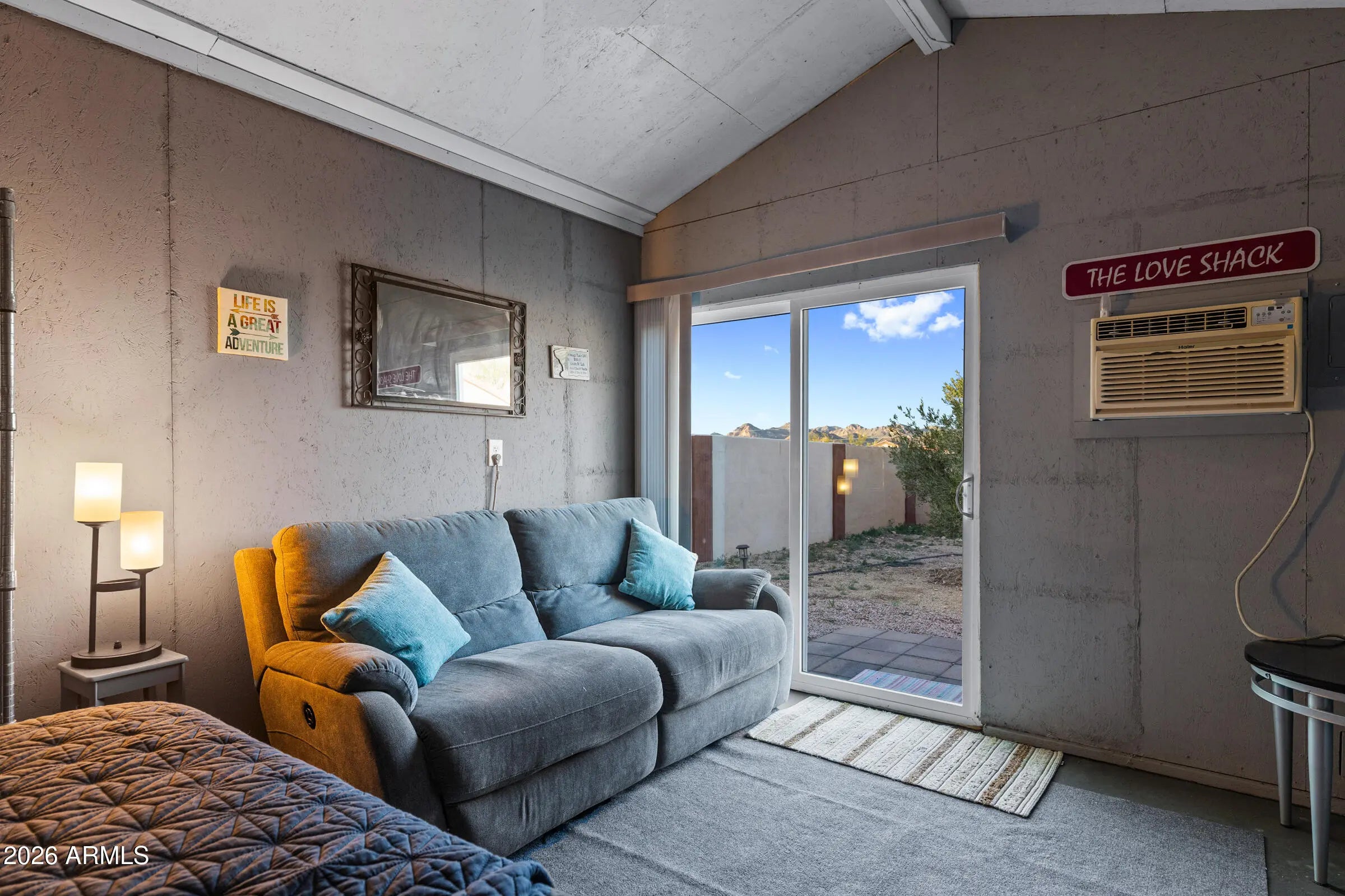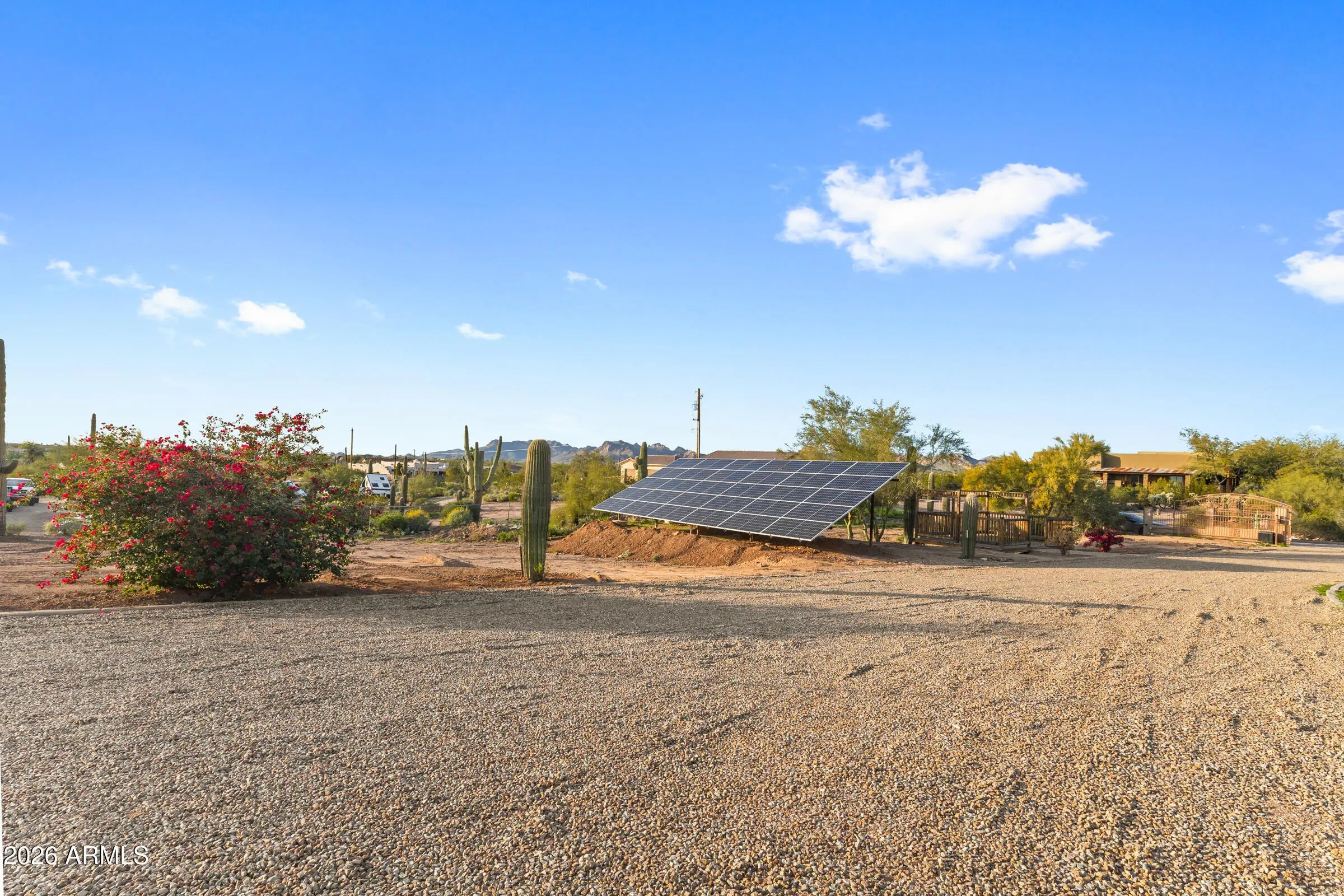 BREATHTAKING panoramic views and exceptional privacy define this truly ONE-OF-A-KIND retreat. Set against WIDE OPEN landscapes and SWEEPING MOUNTAIN VIEWS, this property offers the rare combination of serene seclusion and comforts. The single-level main residence features three bedrooms and two bathrooms, perfectly suited for everyday living and entertaining. A detached 600 square foot SHOP provides endless flexibility for hobbies, projects, or storage, while a CASITA-STYLE shed offers additional space ideal for guests, a studio, or creative use. Outdoor living takes center stage with a full-length covered patio wrapping three sides of the home. Designed for year-round enjoyment, the space is anchored by a FULLY EQUIPPED OUTDOOR KITCHEN, complete with a fireplace, grill, and cooktop, creating the ultimate setting for gatherings. The RESORT-STYLE backyard is nothing short of SPECTACULAR, showcasing a MASSIVE rock GROTTO with WATERFALL and SLIDE, a heated and cooled swimming pool, an above-ground spa, and a convenient half bathroom accessible from the patio. Situated behind the gates of a fully fenced 1.25-acre lot, the property offers abundant parking, a two-car garage, and unparalleled outdoor space. Additional highlights include NO HOA, an OWNED detached SOLAR PANEL array that significantly reduces electric costs, along with a NEWER ROOF and WINDOWS installed in 2019. Quiet, private, and exceptionally rare, this extraordinary property stands in a LEAGUE OF ITS OWN, offering an unforgettable desert escape where views, space, and lifestyle come together seamlessly.