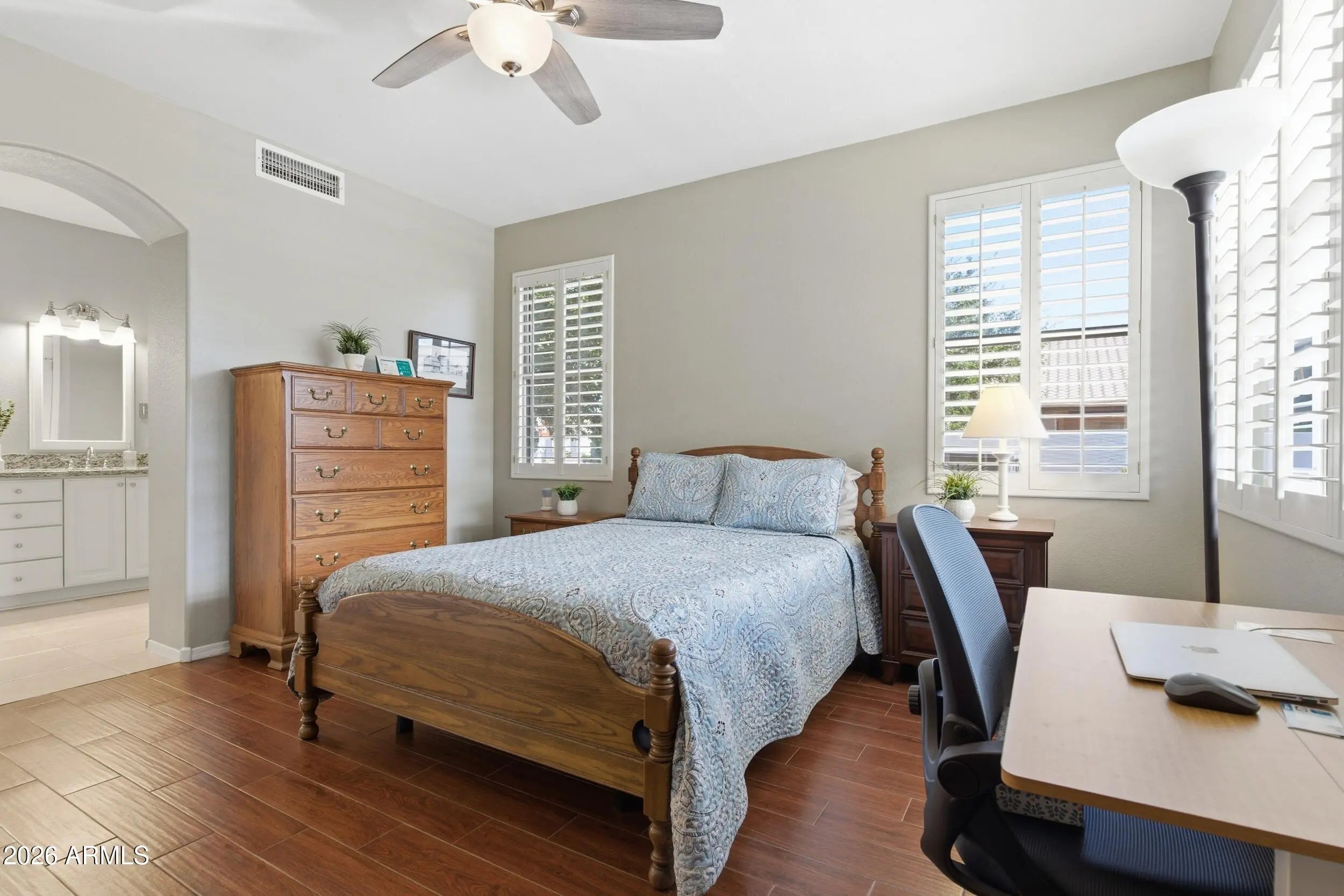 ARIZONA TRADITIONS - 55+ GATED ACTIVE ADULT GOLF COURSE COMMUNITY - BEAUTIFULLY UPDATED- 2 BEDROOM/2 BATH + DEN on a CORNER LOT WITH IDEAL N/S EXPOSURE Features include a bright eat-in kitchen with bay window, white cabinets, quartz counters, tiled backsplash, stainless appliances and island. Formal dining and family room, custom white shutters, neutral finishes, 18'' tile in main living areas, and wood-plank tile in bedrooms. Updated baths with white vanities, granite counters, and modern lighting. New south-facing windows. Enjoy the private backyard with oversized covered patio (Cooldeck) & misting system, built-in BBQ, rock waterfall, and low-maintenance desert landscaping—perfect for relaxed Arizona living. Arizona Traditions is an active 55+ gated golf course community offering walking trails, 18-hole golf course, softball, pickleball, Community Center, sports bar, three pools, bocce ball and a variety of activities, clubs, and social groups. Conveniently located to 303 Fwy, amenities including world-class sports facilities, numerous parks, plus a growing dining and shopping with local breweries and restaurants, alongside cultural spots like art galleries and nearby attractions like the White Tank Mountains and Wildlife World Zoo.