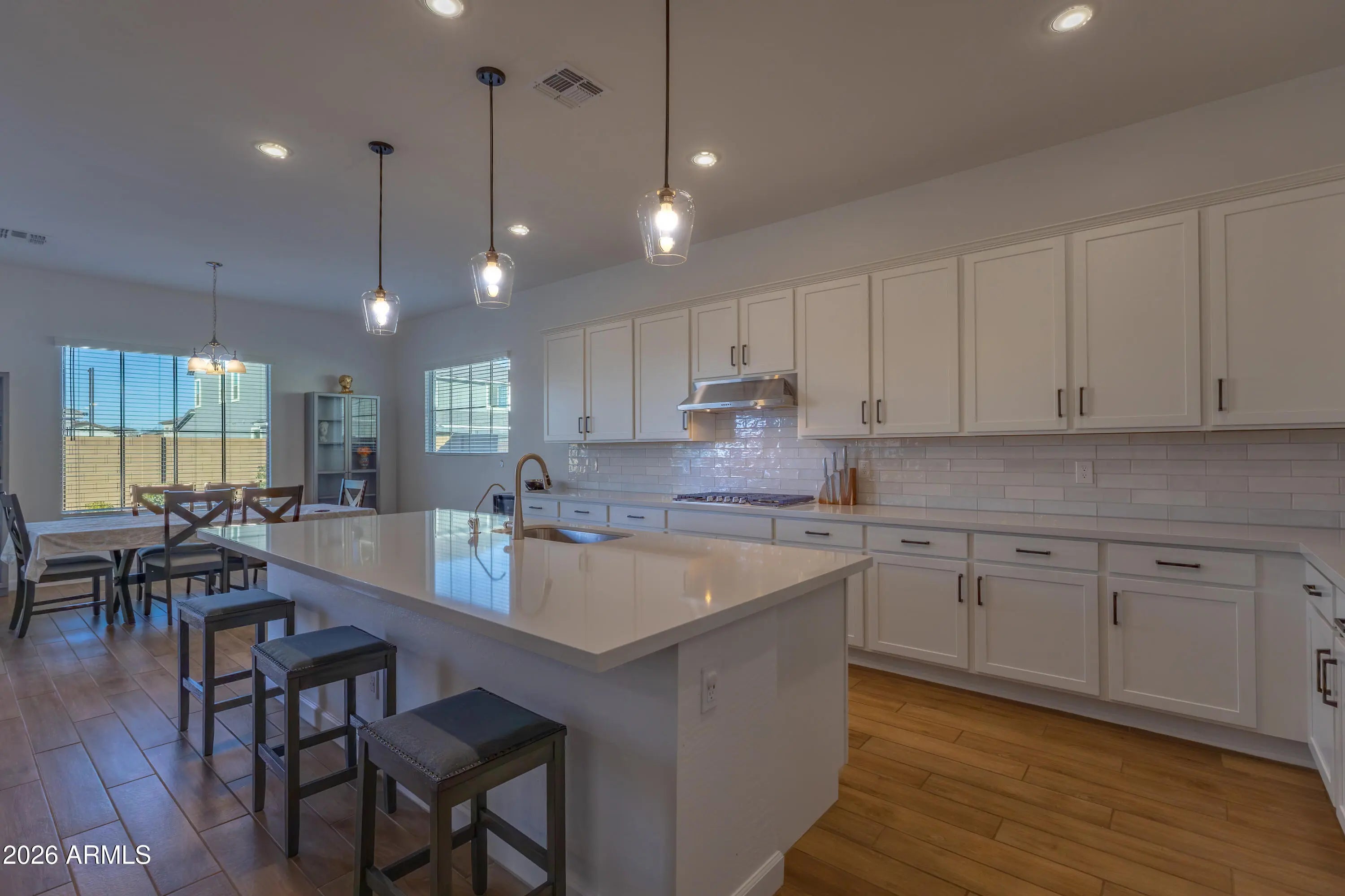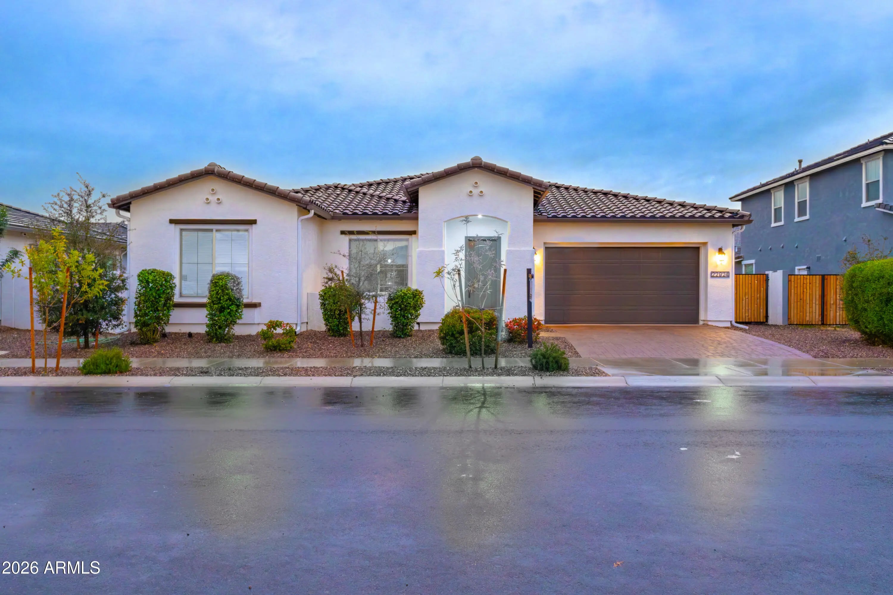 Welcome to Madera, Queen Creek's newest community offering quiet living with convenient access to the 24 Freeway and nearby shopping. Enjoy resort-style amenities including a community pool, pickleball and bocce ball courts, playgrounds, BBQ areas, and shaded ramadas. This beautifully designed home features wood-plank tile flooring in the main living areas, plush carpeted bedrooms, white shaker cabinets, and quartz kitchen countertops. Highlights include 10' ceilings, 8' interior doors, pendant pre-wires over the island, ceiling fan pre-wires in all bedrooms and the great room, and designer tile in the primary bath with upgraded plumbing and lighting. Finished with the Rockwell Essential Designer Palette for a clean, modern look.