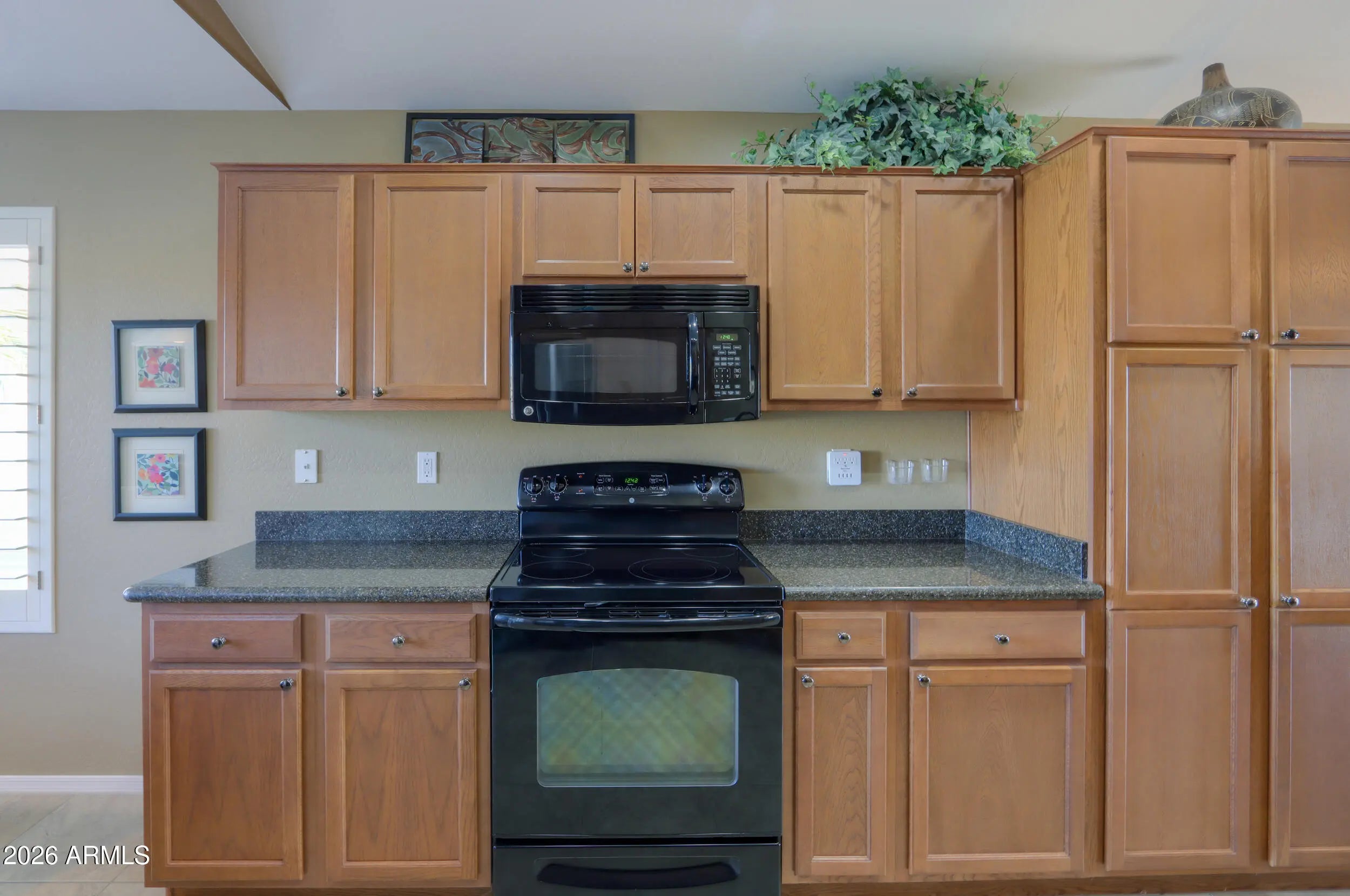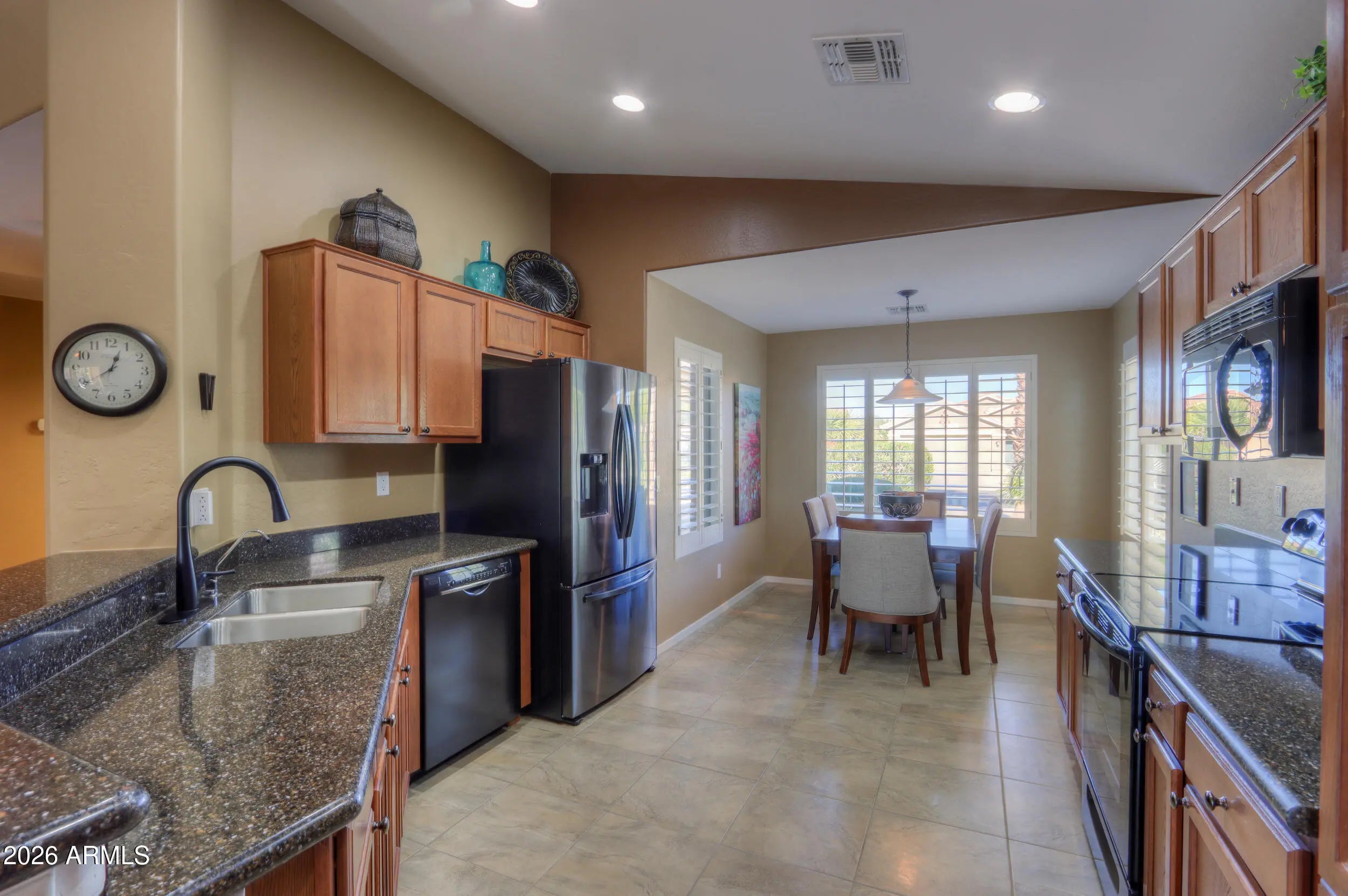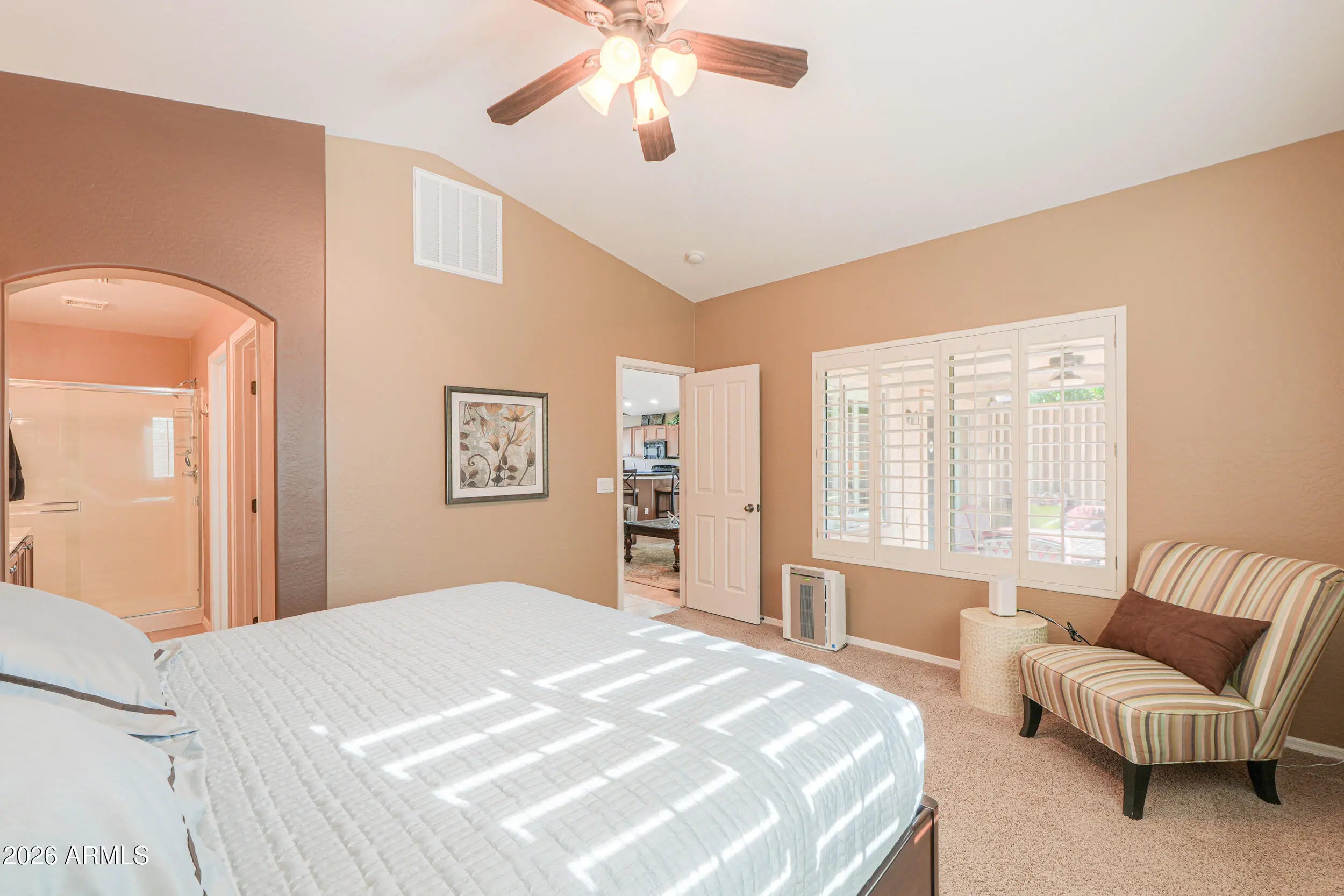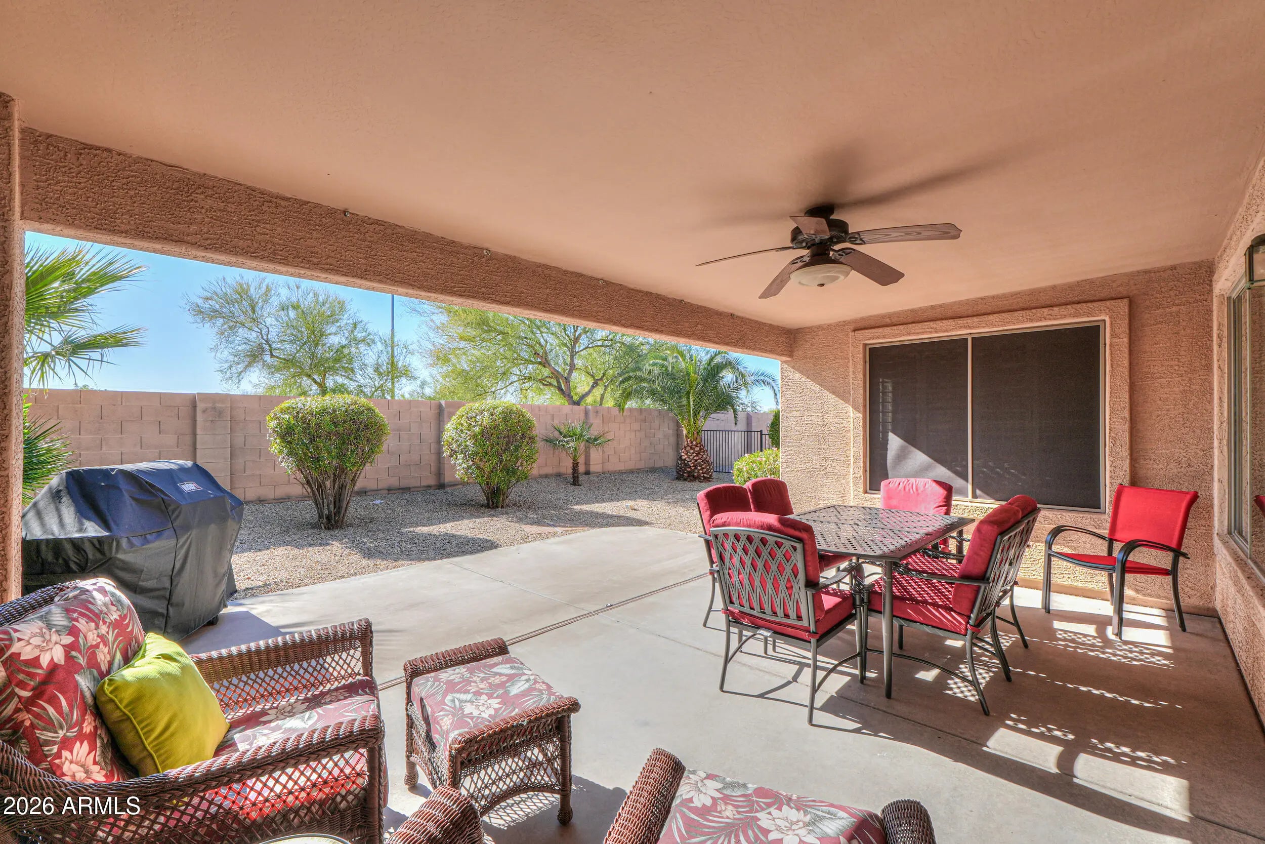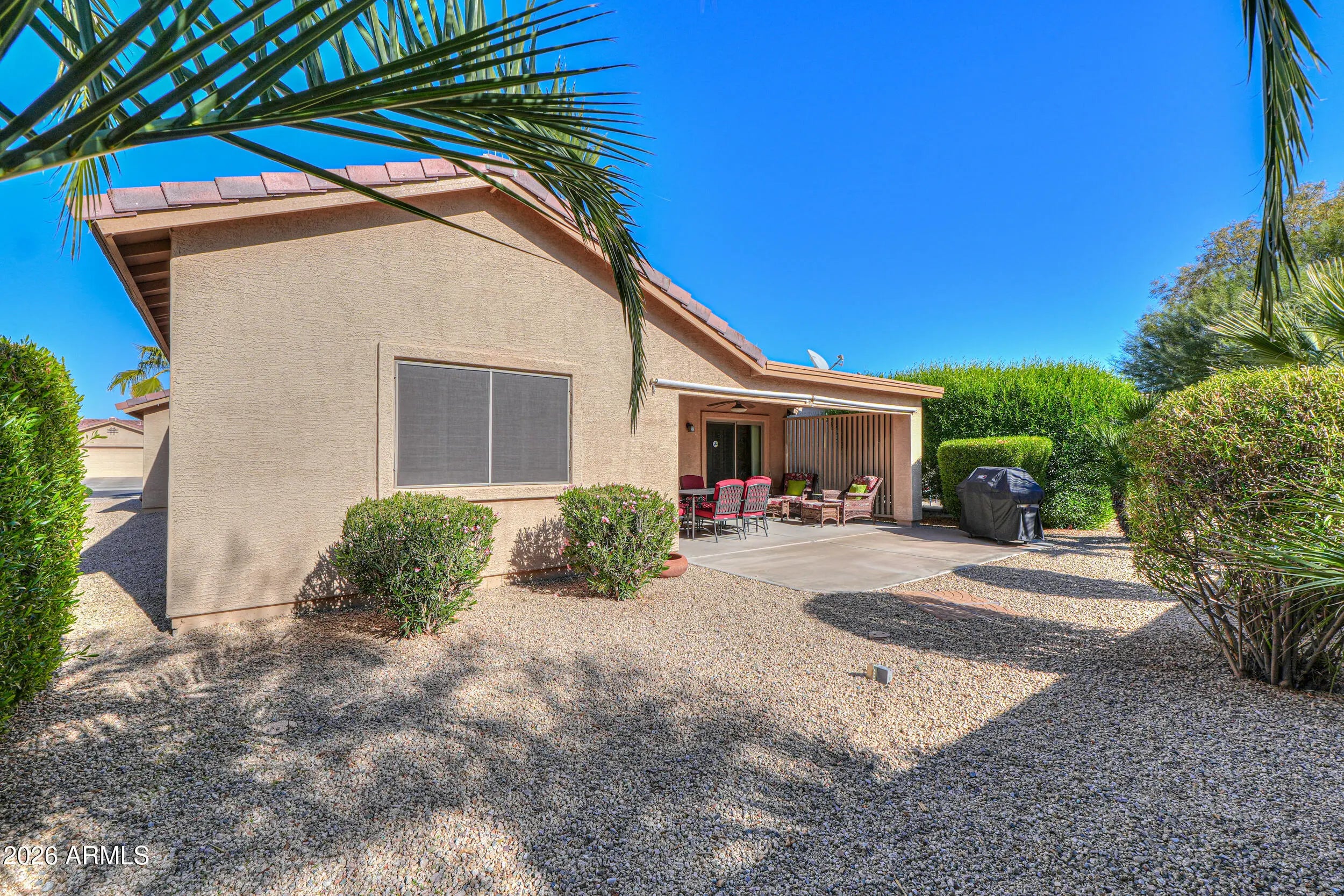Welcome home to this beautifully maintained 2 bed 2 bath residence, offered fully furnished & perfectly positioned with desirable north/south exposure. Step inside to find vaulted ceilings, two-toned paint, ceiling fans, plantation shutters & sun screens, creating a bright yet comfortable living space throughout. The eat in kitchen is both stylish & functional, featuring quartz countertops, sleek black appliances, including a Bosch dishwasher, recessed lighting & ample cabinetry, ideal for everyday living or entertaining. The spacious primary suite with vaulted ceilings, an oversized walk-in closet, dual-sink vanity & walk-in shower is designed for comfort & ease. You will enjoy outdoor living in the fully fenced, private backyard with mature landscaping, a covered patio, extended patio space, ceiling fan & pull-down shades, perfect for relaxing or hosting guests year-round. Additional highlights include a garage with built-in cabinets, water softener & reverse osmosis system. All of this is located in the highly sought-after Mission Royale Active Adult Community, offering resort-style amenities such as a golf course, clubhouse, recreation center, pickleball courts, community pool & so much more. This home offers comfort, convenience & an exceptional lifestyle, move-in ready & waiting for you!