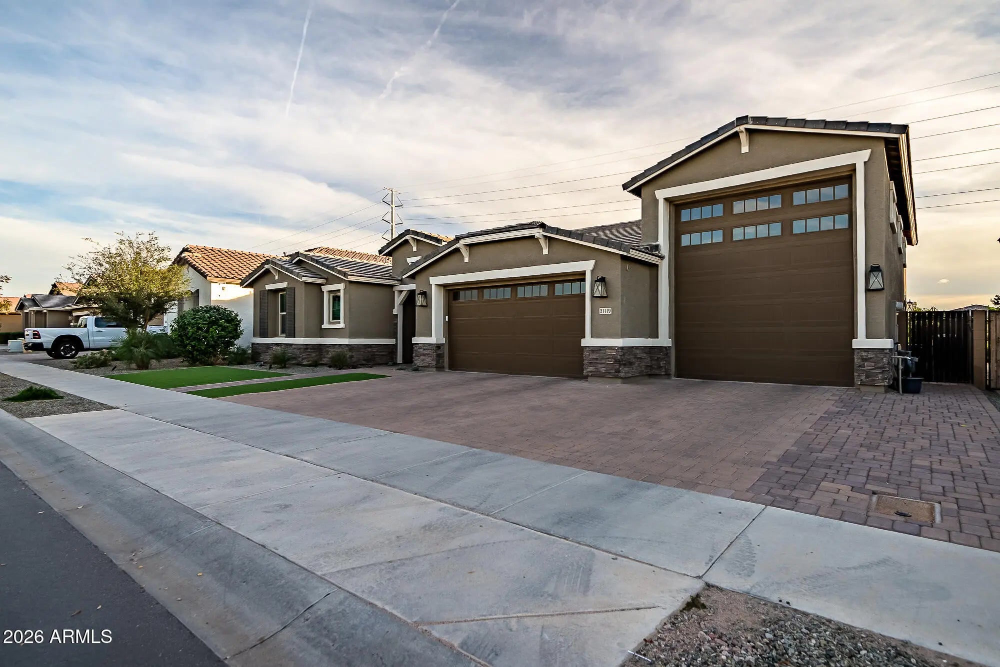Exceptional Queen Creek home with striking curb appeal, paver driveway, four-car drive space, pull-through RV garage, and rare five-car tandem garage. Extensively upgraded—ask your agent for the full list in documents. Interior features wood-plank tile flooring, soaring ceilings, and a chef's kitchen with generous island, quartz countertops, and walk-in pantry. Spa-inspired bathrooms showcase elegant marble finishes. A dramatic 8-ft multi-slide door opens to a resort-style backyard with custom Caribbean pool, fire wok bowls, extended steps, in-floor cleaning, travertine decking, and lush landscaping. The laundry/mud room offers abundant cabinetry, sink, and counter space. Versatile front bonus room/den includes a kitchenette, ideal for a game room, theater, office, or fitness space. Seller to provide up to a $3,000 credit at closing toward carpet replacement, subject to acceptable offer and lender approval. A truly must-see home.