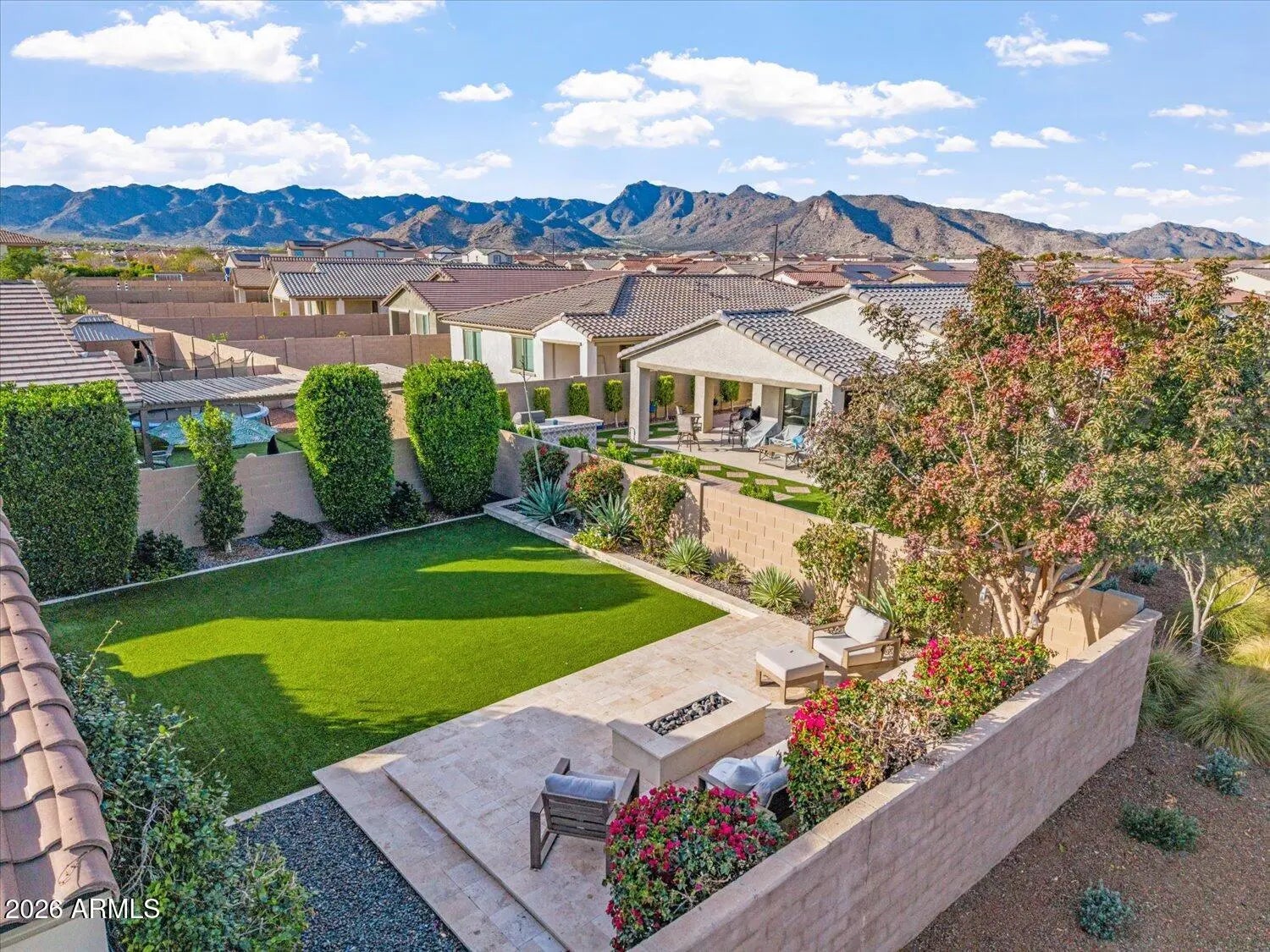 Stunning Verrado home ideally located next to green space with no neighbor on one side! Step inside to a wide entryway with 24x24 tile flooring and tray ceilings. Discover a true chef's kitchen featuring shaker cabinetry with crown molding, quartz countertops, and a large island accented by pendant lighting. The kitchen is equipped with a wall oven and microwave, oversized range with pull-out drawers, deep stainless steel sink, farm-style faucet, and a walk-in pantry—perfect for entertaining and everyday living. Enjoy seamless indoor-outdoor living with both triple and double sliding doors leading to a beautifully designed backyard with extended travertine, turf, gas firepit, hardwired low-voltage lighting, pavers to the side gate and a gas stub ready for a future BBQ. The primary suite offers a spa-like retreat with a walk-in super shower, dual upgraded-height quartz vanities, Moen faucets, and a spacious walk-in closet with custom shelves and drawers, conveniently connected to the laundry room and bedroom. Secondary bedrooms feature laminate plank flooring, custom Murphy bed in one room and a built in desk in the other. Each Room connects to a Jack-and-Jill bath with upgraded square sinks, quartz counters, and shaker cabinetry. Additional highlights include custom curtains and rods throughout, Cat 6 and surround-sound prewire, loop ready for a soft water system and laundry room plumbing for a sink. Located close to Verrado High School and nestled in the highly sought-after Verrado community, residents enjoy resort-style pools, shopping, dining, community events, hiking, and scenic trails. This exceptional home offers luxury, functionality, and an unbeatable location!