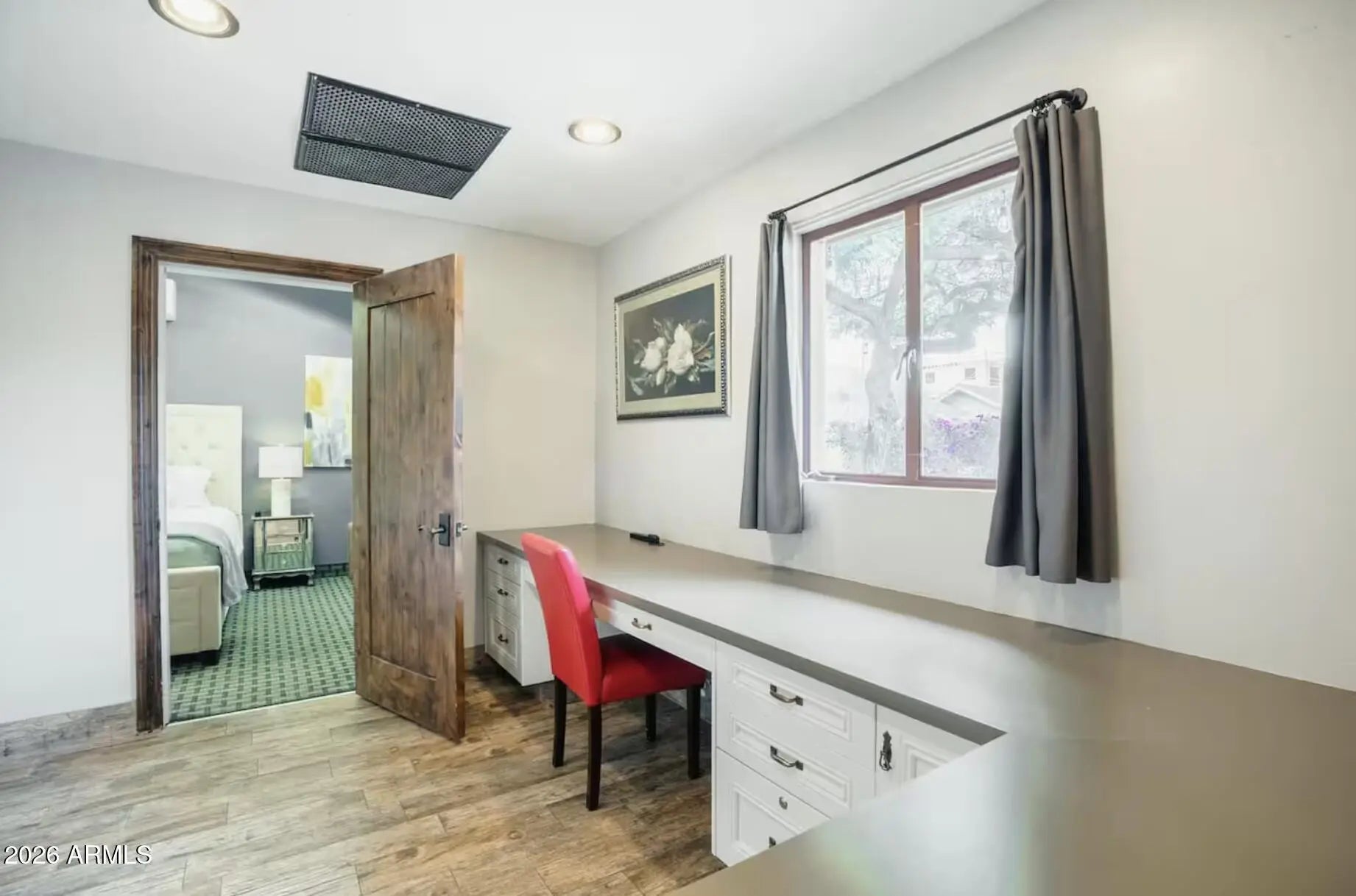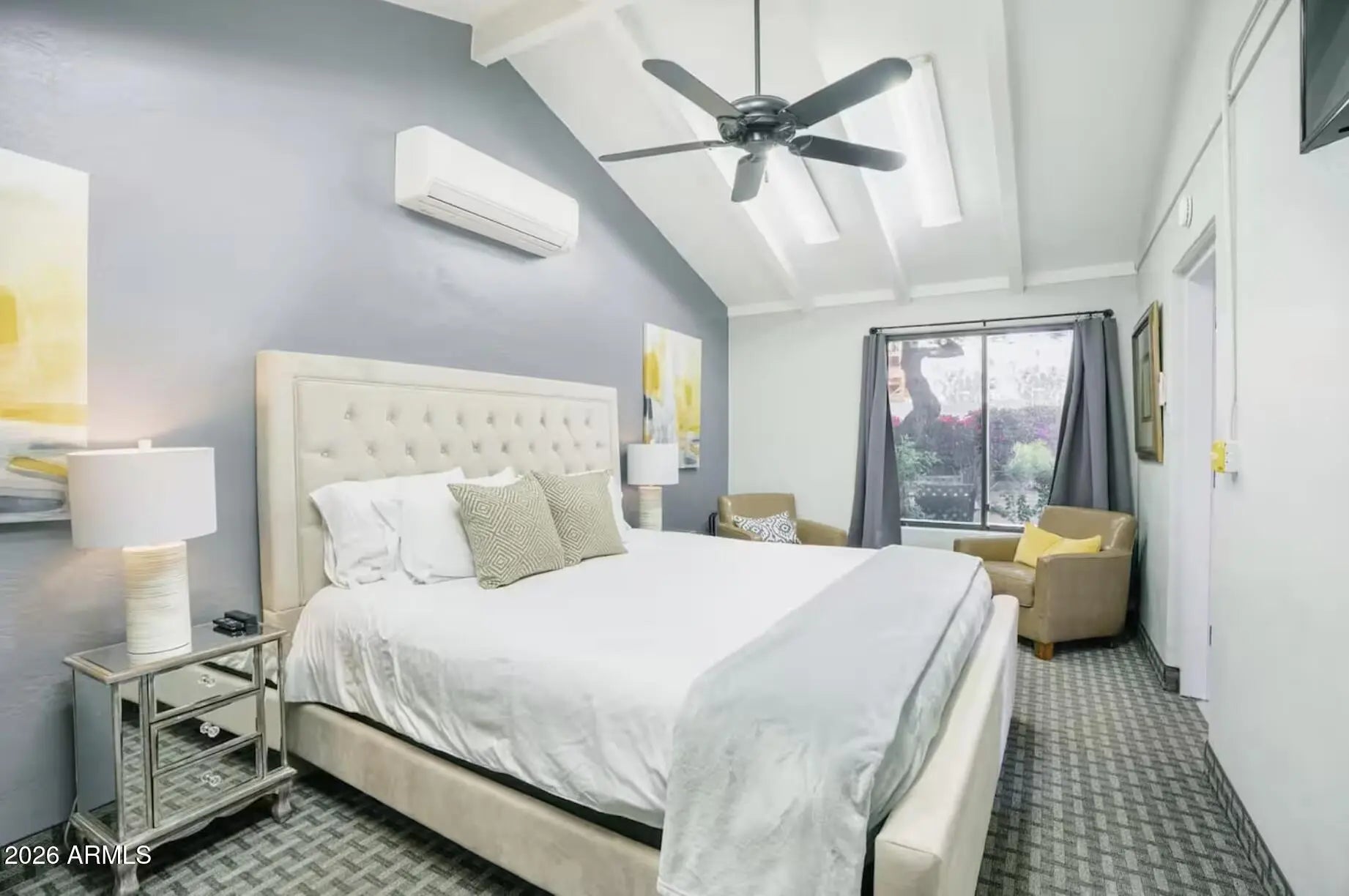 This Old Town Scottsdale estate features beautifully restored vintage homes with multiple suites, located on the corner of 1st Street and Goldwater in the heart of the Old Town Arts District. Enjoy a highly walkable location just steps from art galleries, shops, restaurants, wineries, breweries, Alo Café, Cornish Pasty, and the seasonal Farmers Market. Downtown Main Street is one block north, with access to the free Scottsdale Trolley and easy connection to Scottsdale Fashion Square. This spacious suite offers a private entrance with a landscaped north-facing patio, modern Southwest décor, and 1,109 sq. ft. of private interior living space. Sleeps up to 6 with a king bedroom, queen bedroom, attached office, galley kitchen with appliances, large family room, and ¾ bath. On-site parking.