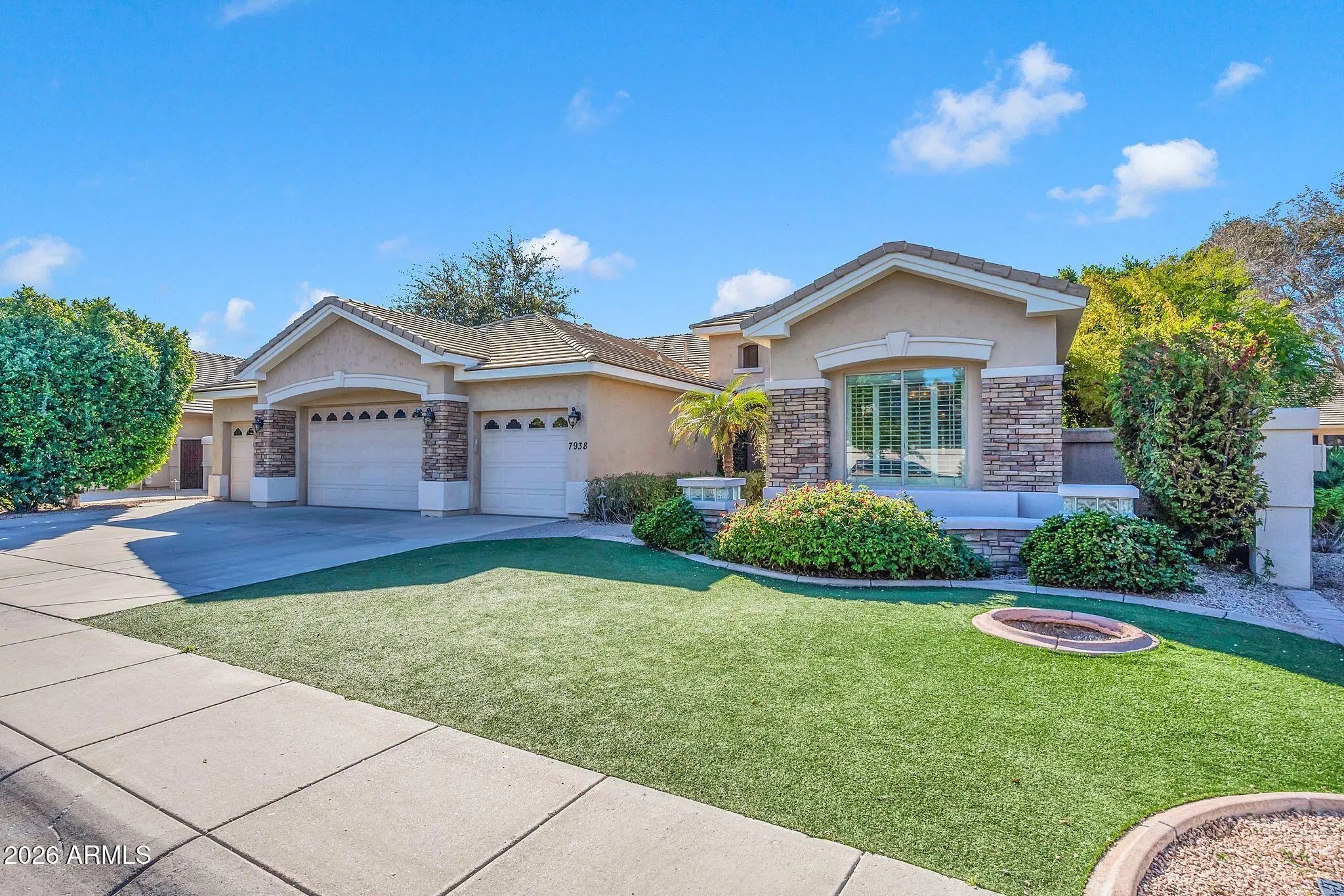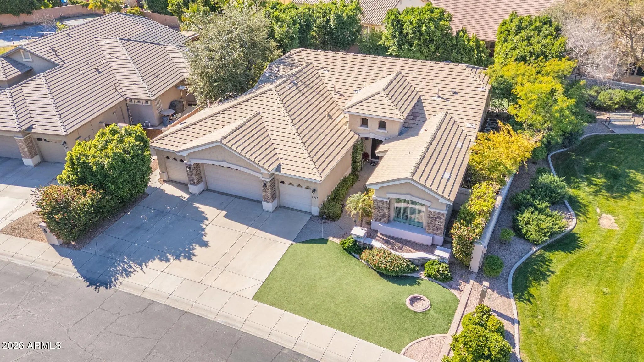 Rare basement home located in the gated Alisanos community, ideally positioned on a greenbelt lot on a quiet cul-de-sac near canal paths. The property offers a rare four-car garage, RV gate, stone veneer exterior accents, and well-lush front and backyard landscaping with low maintenance turf. Inside, the home features high ceilings and a functional, well-designed layout. The chef's kitchen includes an expansive island and opens directly to the family room, creating a seamless connection for everyday living and entertaining. The home offers 4 bedrooms and 3.5 bathrooms, plus office and game room including a spacious primary suite with a custom closet, and spa-style bath. Finished in a timeless neutral palette and thoughtfully designed throughout, this home combines comfort, functionality, and location within one of the area's most desirable gated communities. Thoughtful upgrades include LED lighting and fixtures, energy efficient features, built in media walls, and shutters throughout. The resort style backyard is an entertainer's dream with a sparkling pool and spa, water feature, exterior fireplace, and built in BBQ with sit up bar.