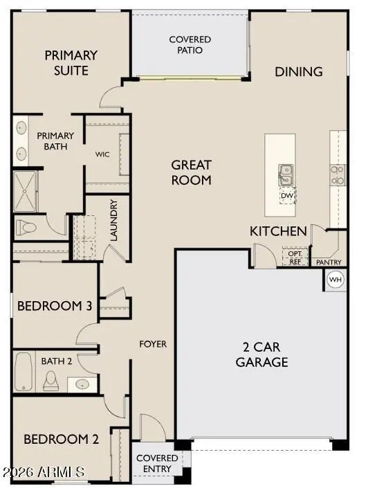 Discover the Violet Plan — a beautifully designed single-story home offering 1,567 sq. ft. of stylish, functional living space. This quick move-in residence features a Spanish exterior elevation with 3 spacious bedrooms, 2 bathrooms, and a 2-car garage. At the heart of the home, the kitchen shines with white 42'' upper cabinets, quartz countertops, a white backsplash, and a large island perfect for gathering. As part of the Timeless Collection, it comes complete with stainless steel appliances— electric range, microwave, dishwasher, and refrigerator—and prewiring for pendant lights. Wood-look plank tile flows through the main living areas, leading to an open great room that connects effortlessly to a covered patio through a 4-panel sliding glass door, ideal for indoor-outdoor living. Additional highlights include 8-foot interior doors, 2-inch faux wood blinds, a washer and dryer, and elegantly finished bathrooms with quartz countertops and oval sinks. With its thoughtful layout, modern finishes, and welcoming design, the Violet Plan is a home you'll love to live in every day.