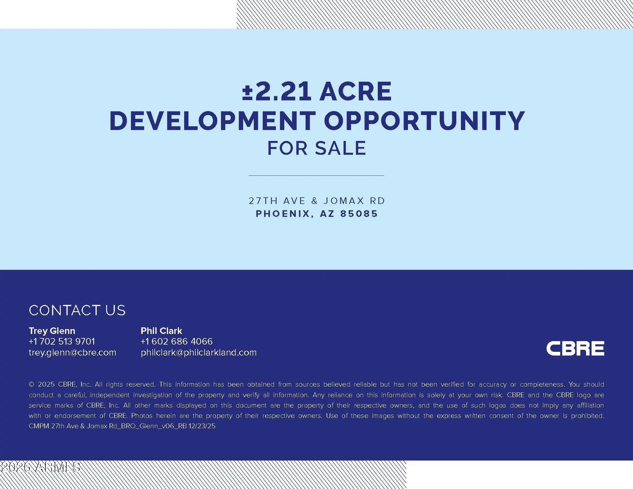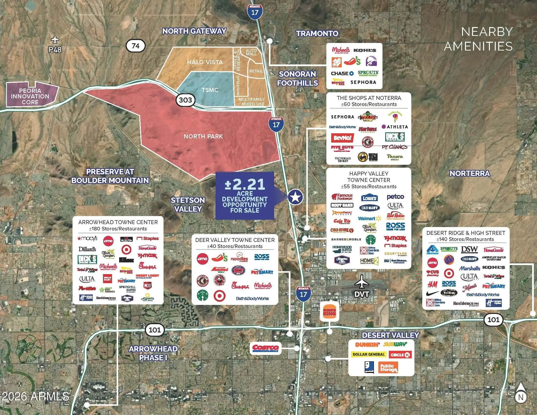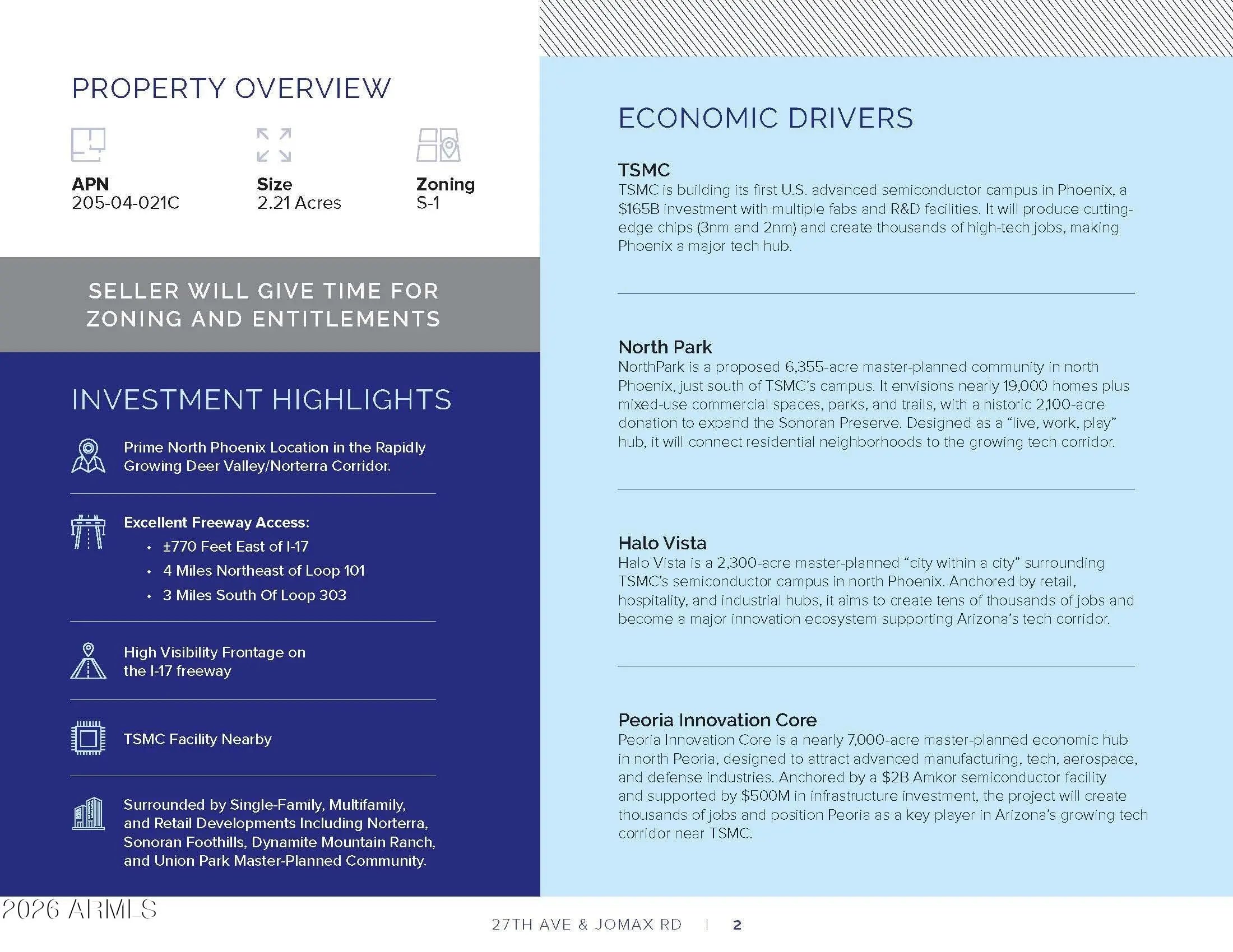This exceptional ±2.2-acre parcel just North of the intersection of 27th Avenue and Jomax Road is strategically positioned in the heart of the North Phoenix growth corridor, one of the Valley's most dynamic and rapidly expanding areas. Surrounded by ongoing residential and commercial development, the site offers potential freeway visibility, great accessibility, and long-term upside. The property benefits from close proximity to major regional employers and economic drivers, including TSMC, USAA, W.L. Gore, and the Deer Valley Air Park, making it ideally suited for a variety of commercial or residential uses. With strong population growth, expanding infrastructure, and increasing demand driven by nearby high-tech and aerospace investment, this location presents a compelling opportunity for investors and developers seeking to capitalize on North Phoenix's continued momentum.
