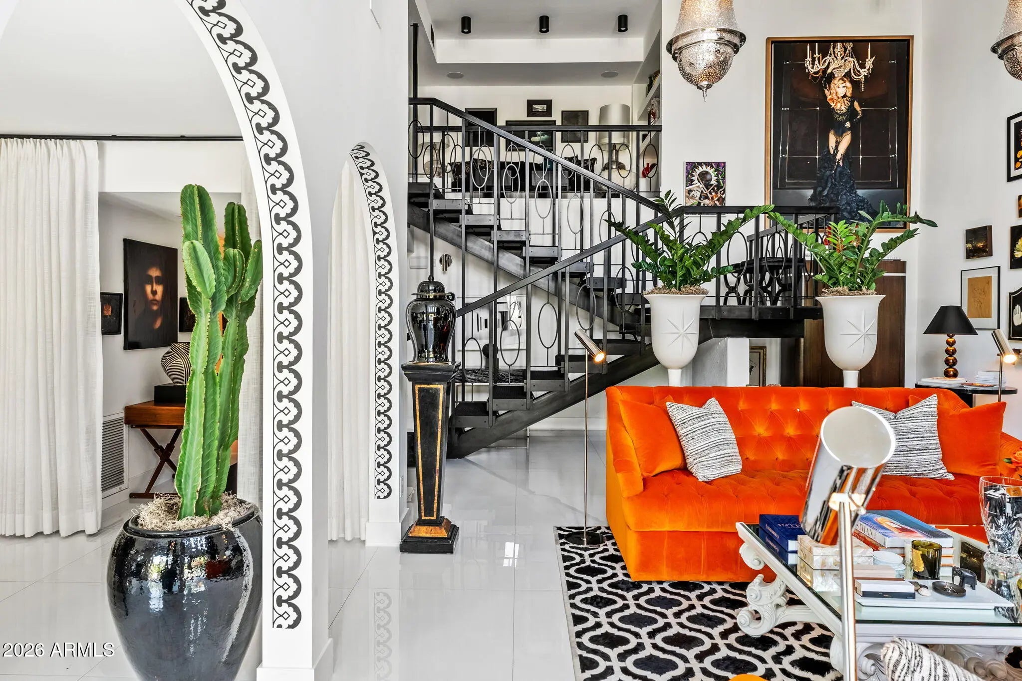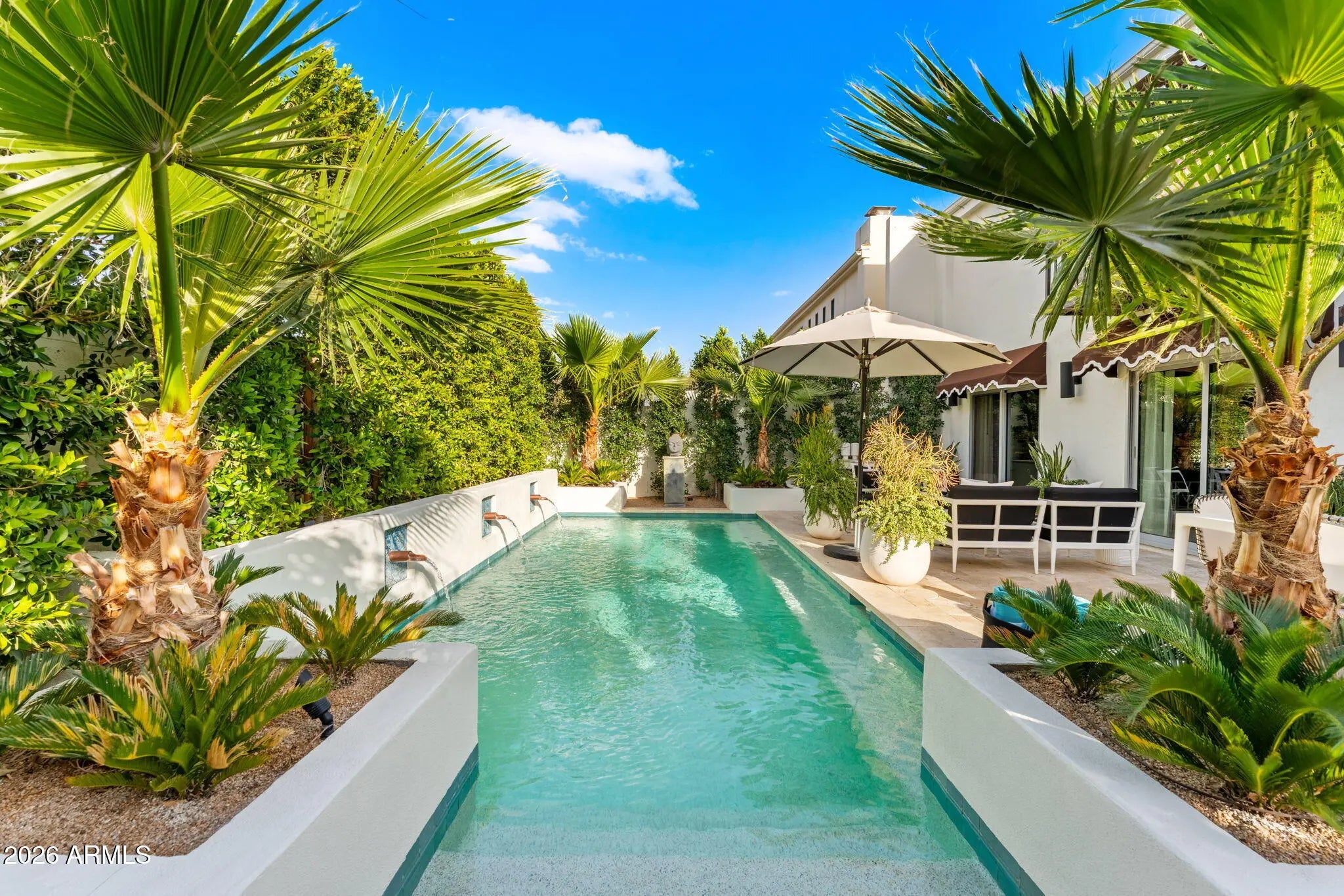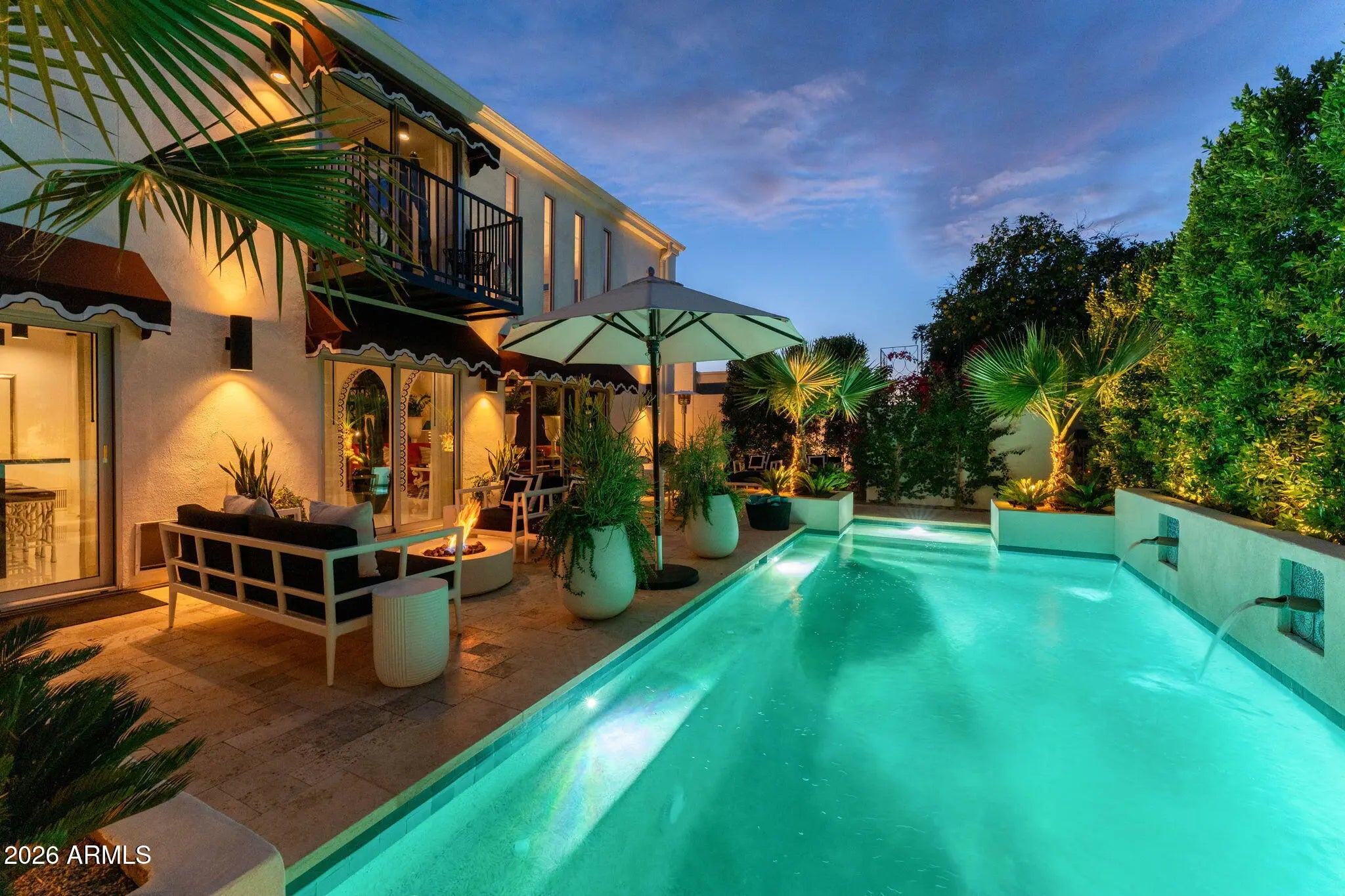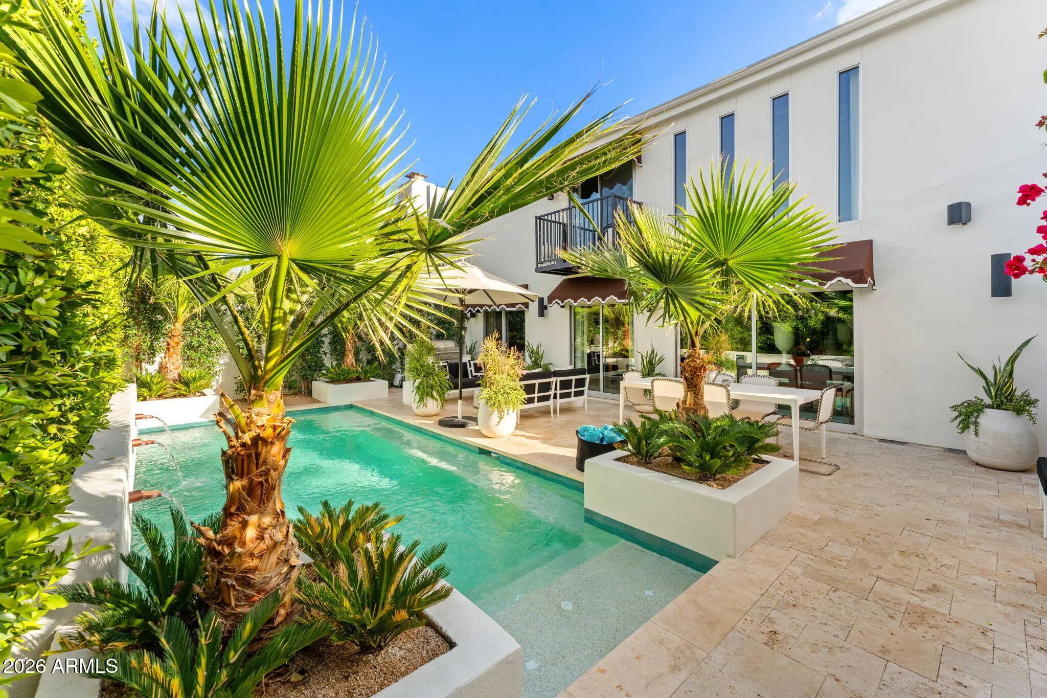 Introducing a newly rebuilt creative oasis, where historic charm meets post modern flair. This private residence of renowned Interior Designer James McIntyre, has been featured on the cover of Phoenix Home & Garden magazine as well as the Phoenix Home & Garden tour 2024. Completely reimagined, this jewel box invites you in with the arched front courtyard retreat lined in gorgeous drapery, lush landscaping and charming awnings. The fabulous great room features 17' ceilings, with custom molding, and floor to ceiling drapes with a quartet of suspended Moroccan lanterns. Arches beckon you into the elegant eating area and chef's kitchen featuring ebonized quarter-cut custom oak cabinetry, sleek marble countertops, Sub Zero refrigerator, and wine refrigerator, 2 beverage drawers, wolf oven, induction cooktop and cove dishwasher. With a nod toward 1970's Hollywood glam, breeze block was added, providing an element of mystery from the main dining room and family room. This masterpiece features 4 bedrooms with ensuites, with 1 bedroom on the main level and 3 bedrooms on the 2nd level. The back yard has an intimate Beverly Hills hotel flair, with new pool, water features, lush landscaping, privacy hedge, fire feature and built in grill. Perfectly situated across from the new Ritz Carlton hotel and backing a huge park, this townhome is walkable to many restaurants and shopping.