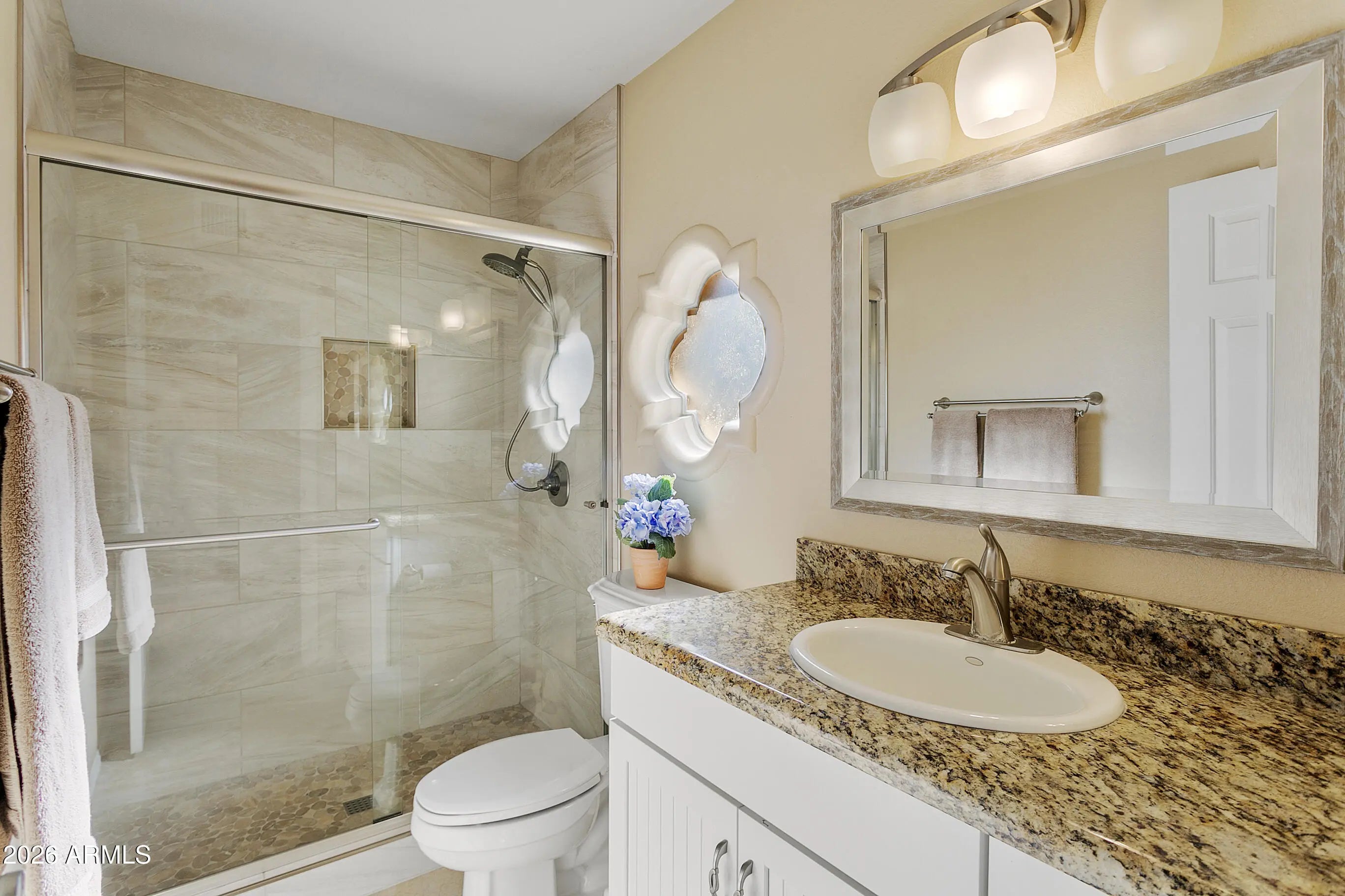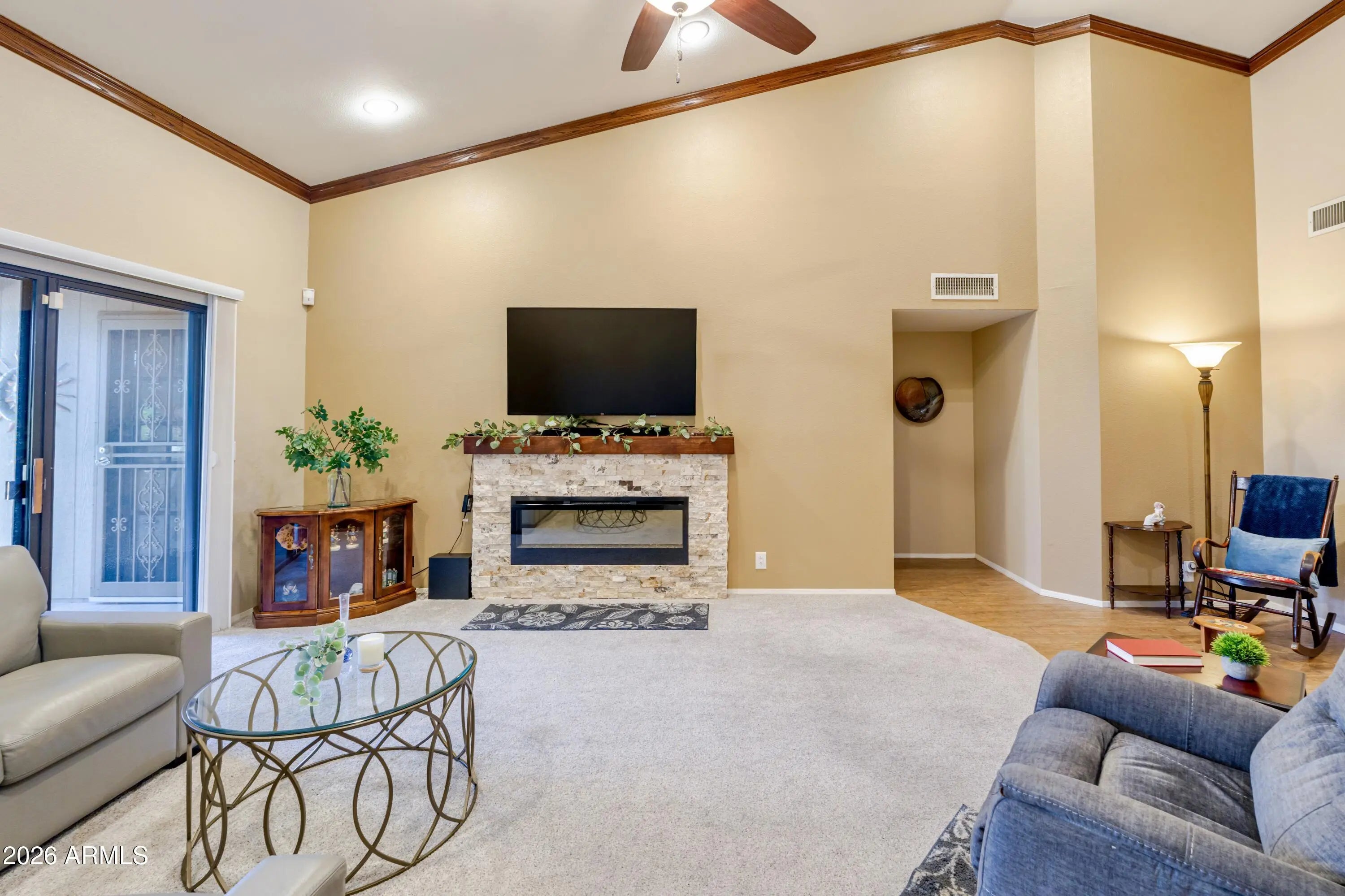 Welcome to this beautifully remodeled three-bedroom, 2.5-bathroom residence located in the vibrant 55+ community of Westbrook. This lovingly maintained home offers abundant space for both indoor and outdoor entertaining while providing a cozy, peaceful atmosphere. As you approach the property, you'll be greeted by low-maintenance landscaping that leads you to an inviting porch. The double doors, complete with security screens, open wide to let in the cool Arizona breeze. The spacious entryway welcomes guests into the formal living area, with an electric fireplace that adds charm, warmth, and ambience for delightful gatherings or quiet evenings at home. The spacious kitchen, featuring a center island and breakfast nook, is ideal for culinary enthusiasts to showcase their talents. Adjacent to the kitchen, the attached den serves as a perfect space for game nights or simply unwinding after a long day. Designed with comfort in mind, the split floor plan places the primary suite on one end of the home. It boasts a lovely seating area and a private exit to the backyardyour personal oasis. The primary bathroom has been tastefully remodeled, featuring a step-in shower, double sinks, and a generous walk-in closet. The two roomy guest bedrooms share a well-appointed, remodeled, full bathroom. Step outside to the inviting backyard, which is perfect for outdoor enjoyment. The space features travertine tile and a grassy area, all bordered by a retaining fence and tall trees that enhance your privacy and tranquility. This is more than just a home; it's a lifestyleone that fosters community and relaxation in a beautiful setting. Please see the Special Feature list in documents as upgrades are too numerous to list here.