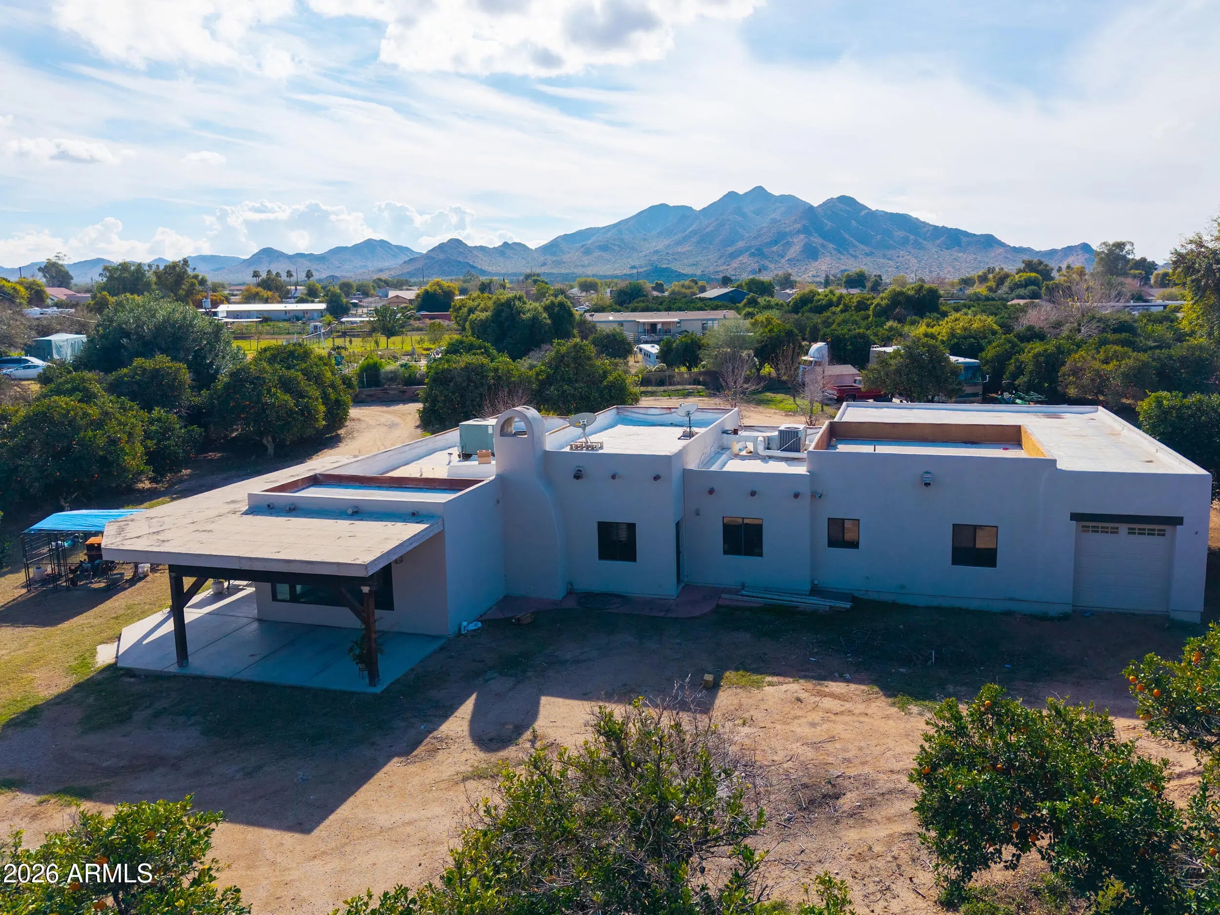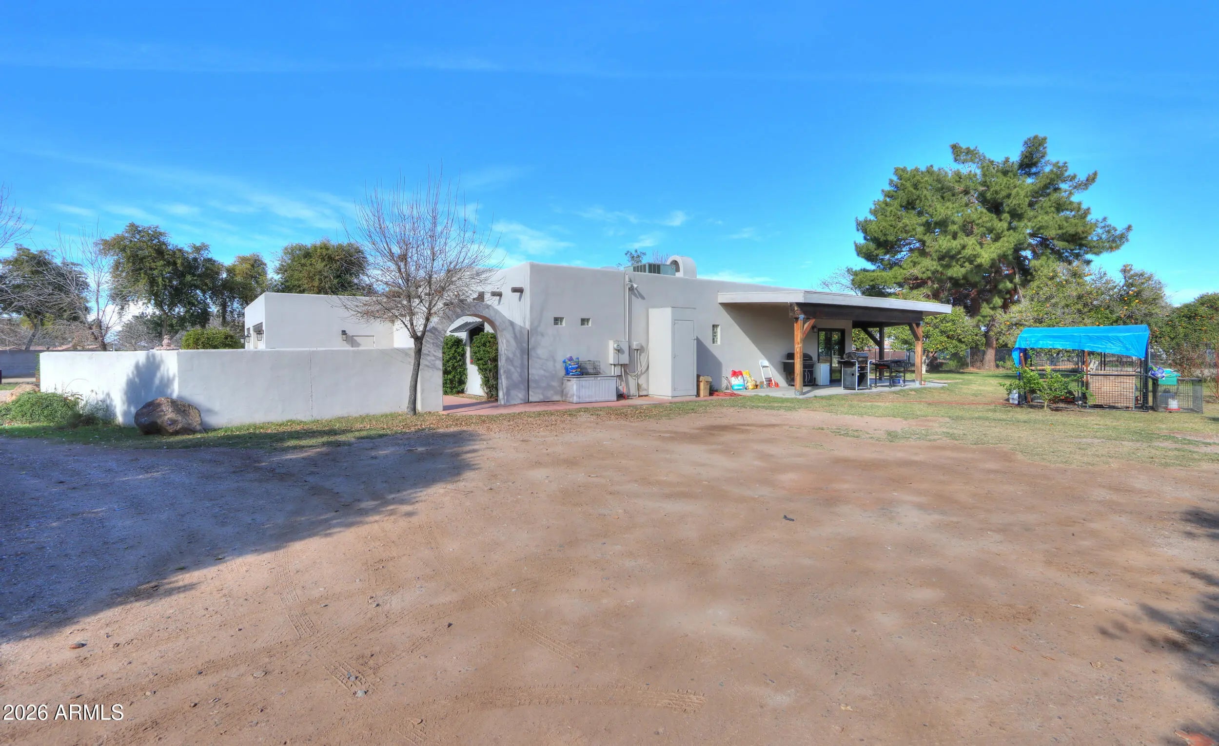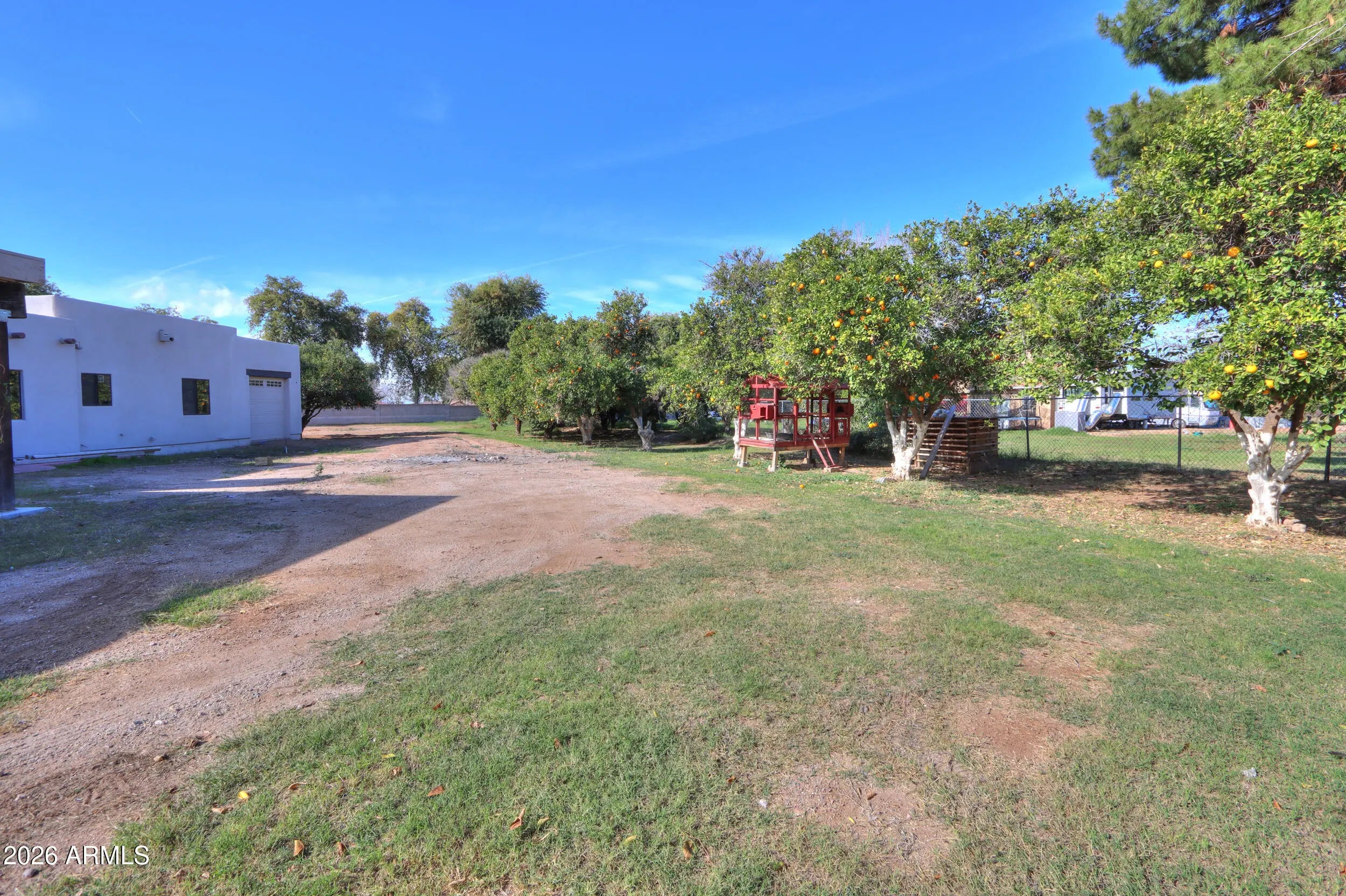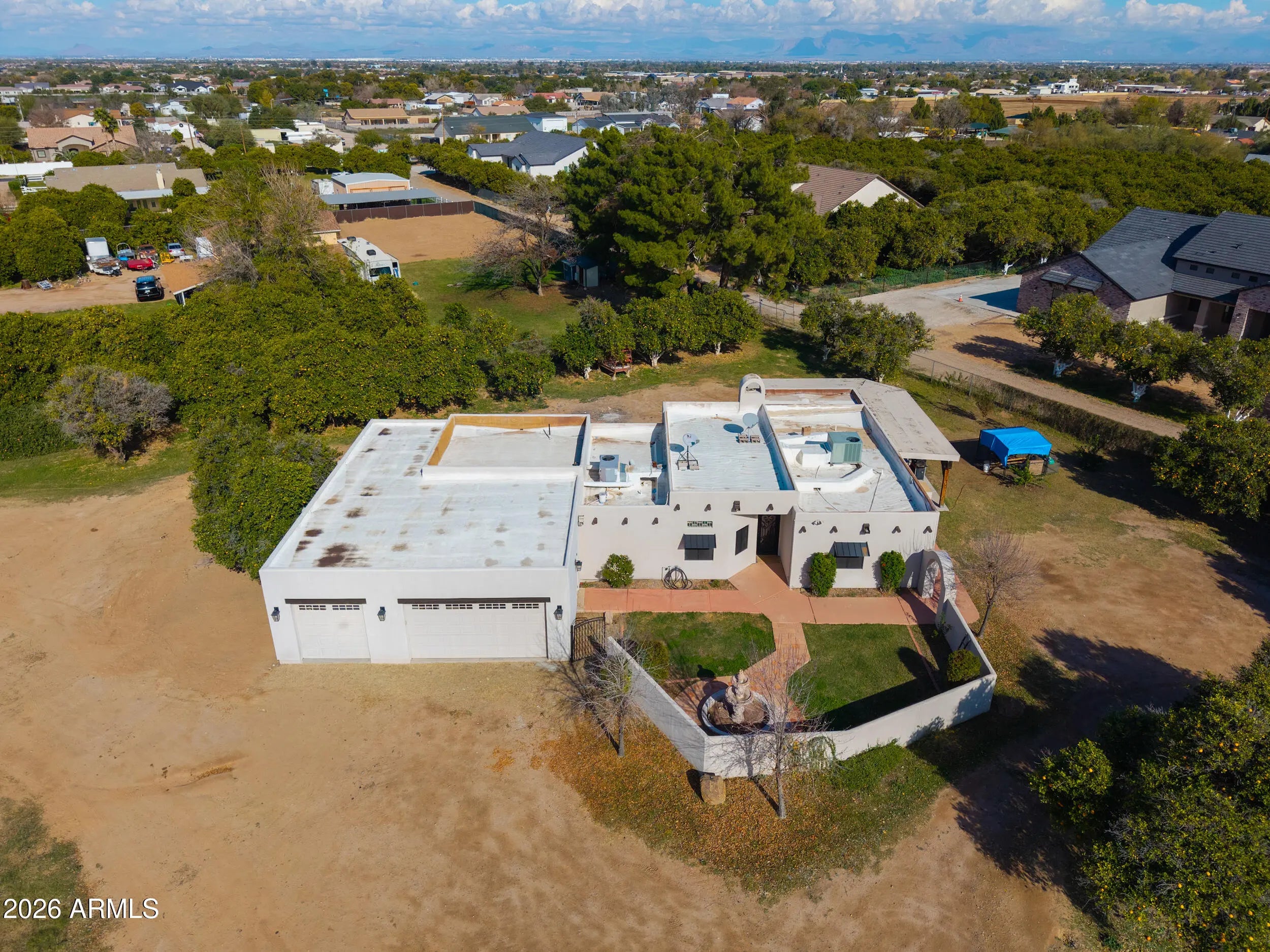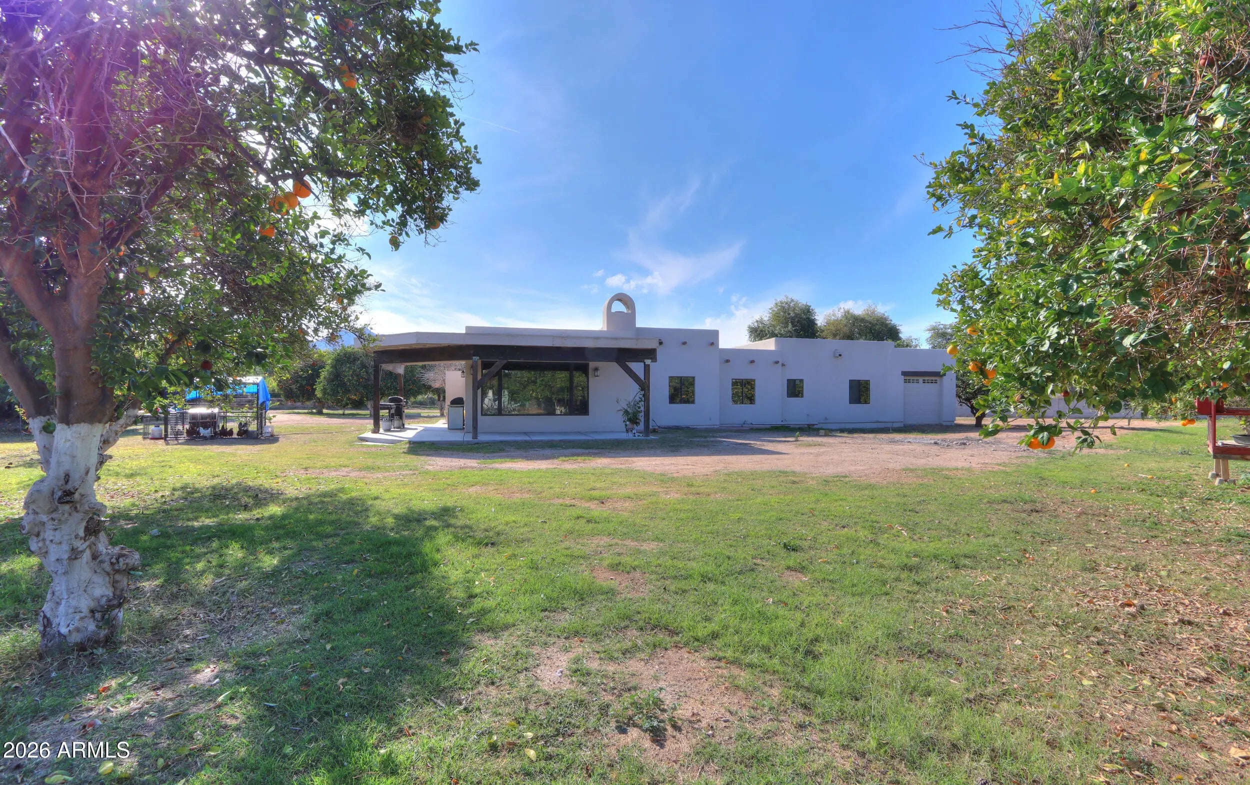 Welcome home to this charming single-level Santa Fe-style custom home set on 1.11 fully fenced acres with gated entry in the heart of Queen Creek with Chandler school district & bussing to Benjamin Franklin & ALA Charter Schools! Enjoy the beauty of flood irrigation, mature landscaping, 25+ mature navel orange trees as well as lemon, key lime, peach, plum, apricot & blood orange trees & chicken coop- all with no HOA & easy access to Chandler & Gilbert! This 2031 sq ft bungalow offers 3 spacious bedrooms, 2 bathrooms & an oversized great room with wood-burning fireplace! The inviting kitchen features ceiling-height Cherry cabinetry, Quartz countertops, large island with farmhouse sink, slate appliances & a cozy dining nook overlooking the tranquil yard! Relax in the gated courtyard with fountain, entertain under expansive covered patios & enjoy the convenience of a four-car pull-through garage and RV hookup with water & electric services & 24x30 slab! A rare property that truly feels like home- offering space, comfort, and timeless charm!