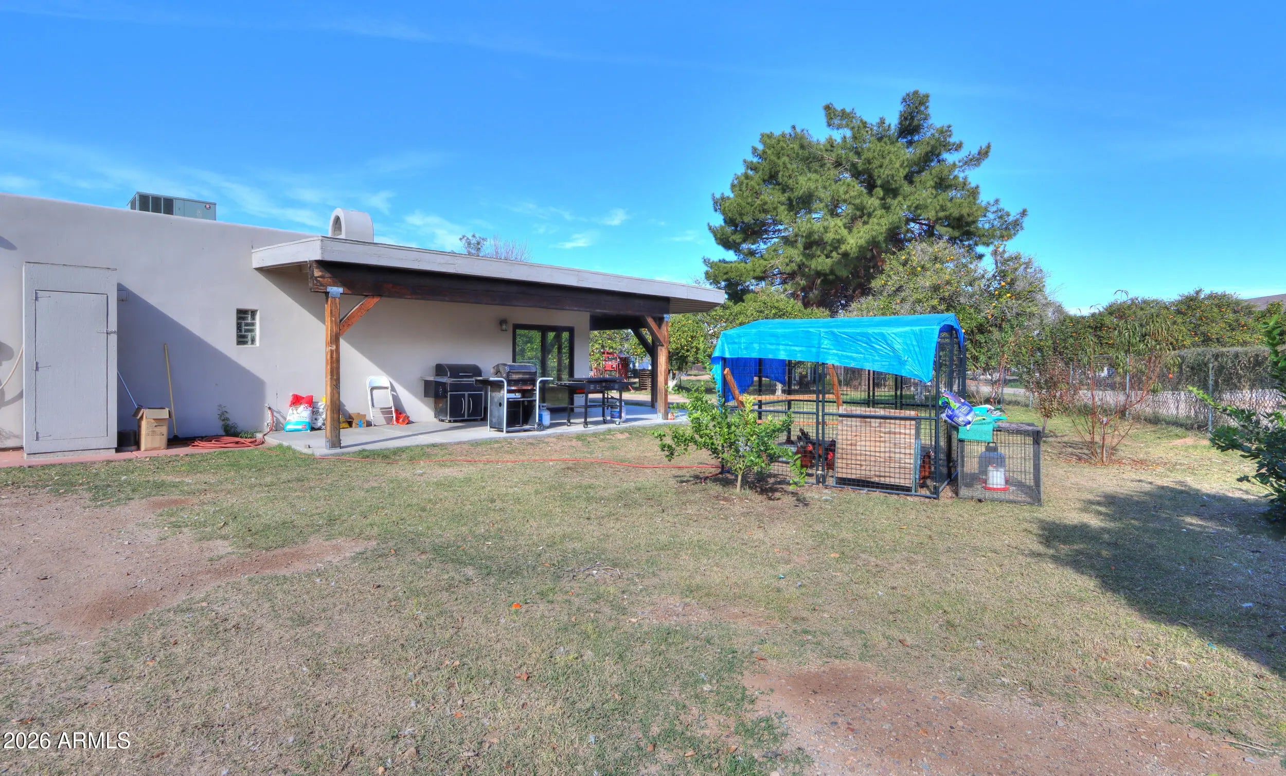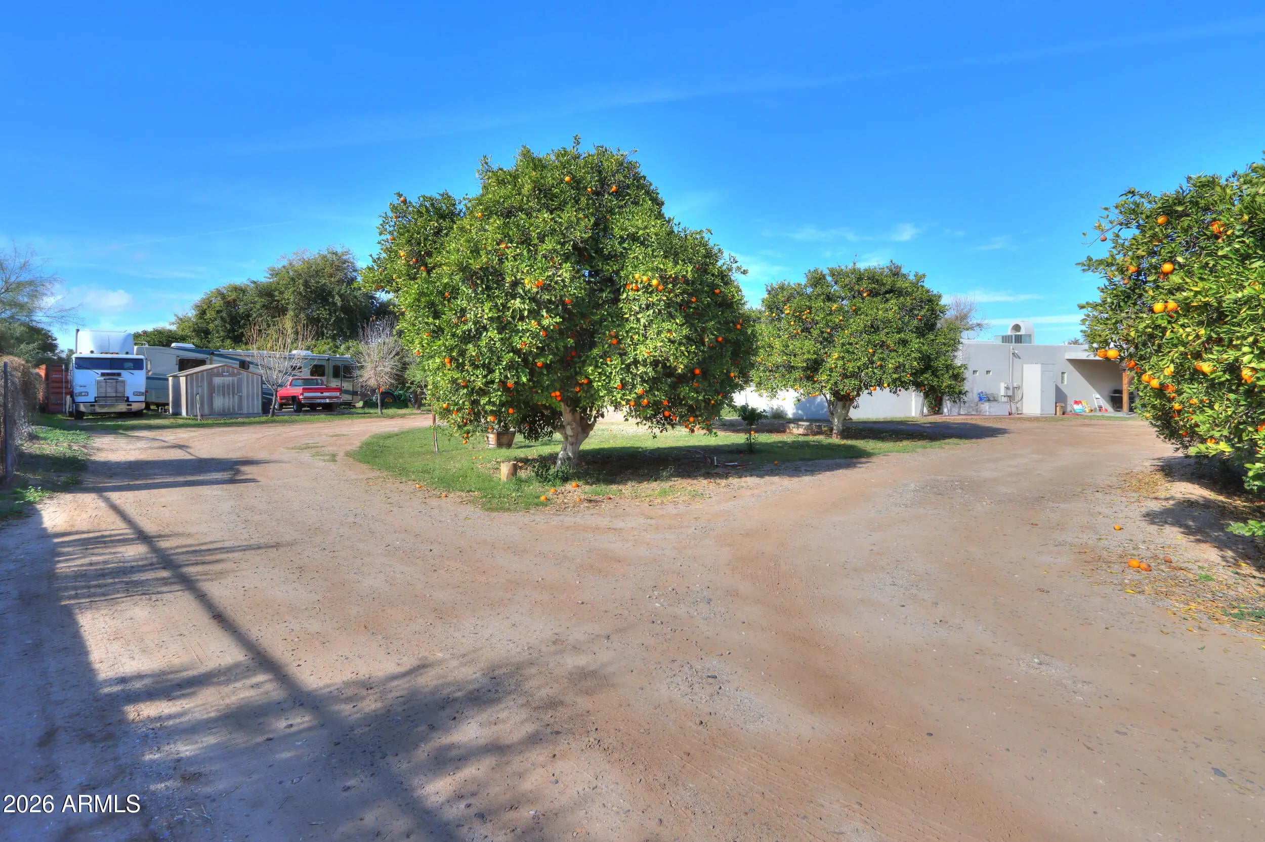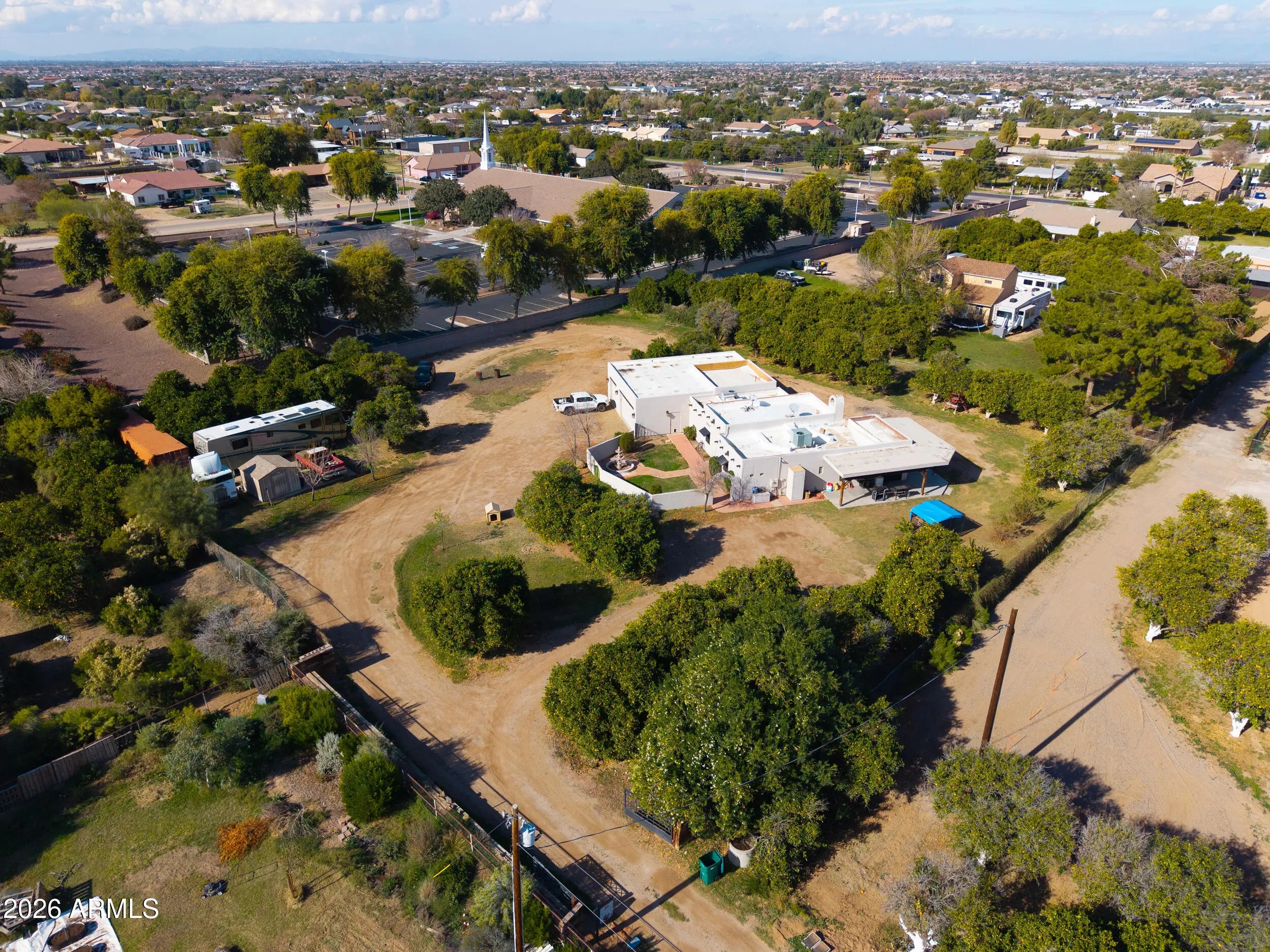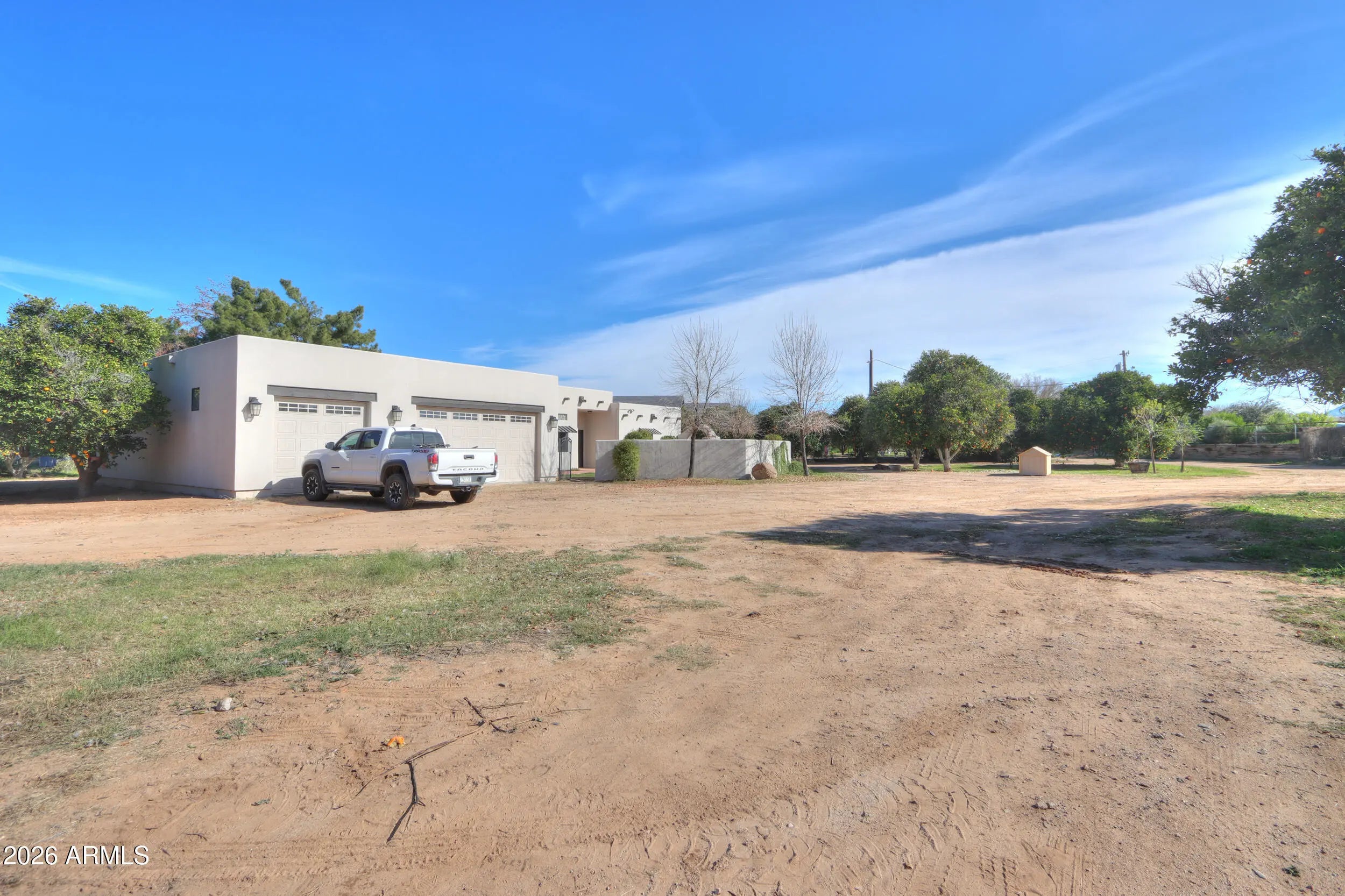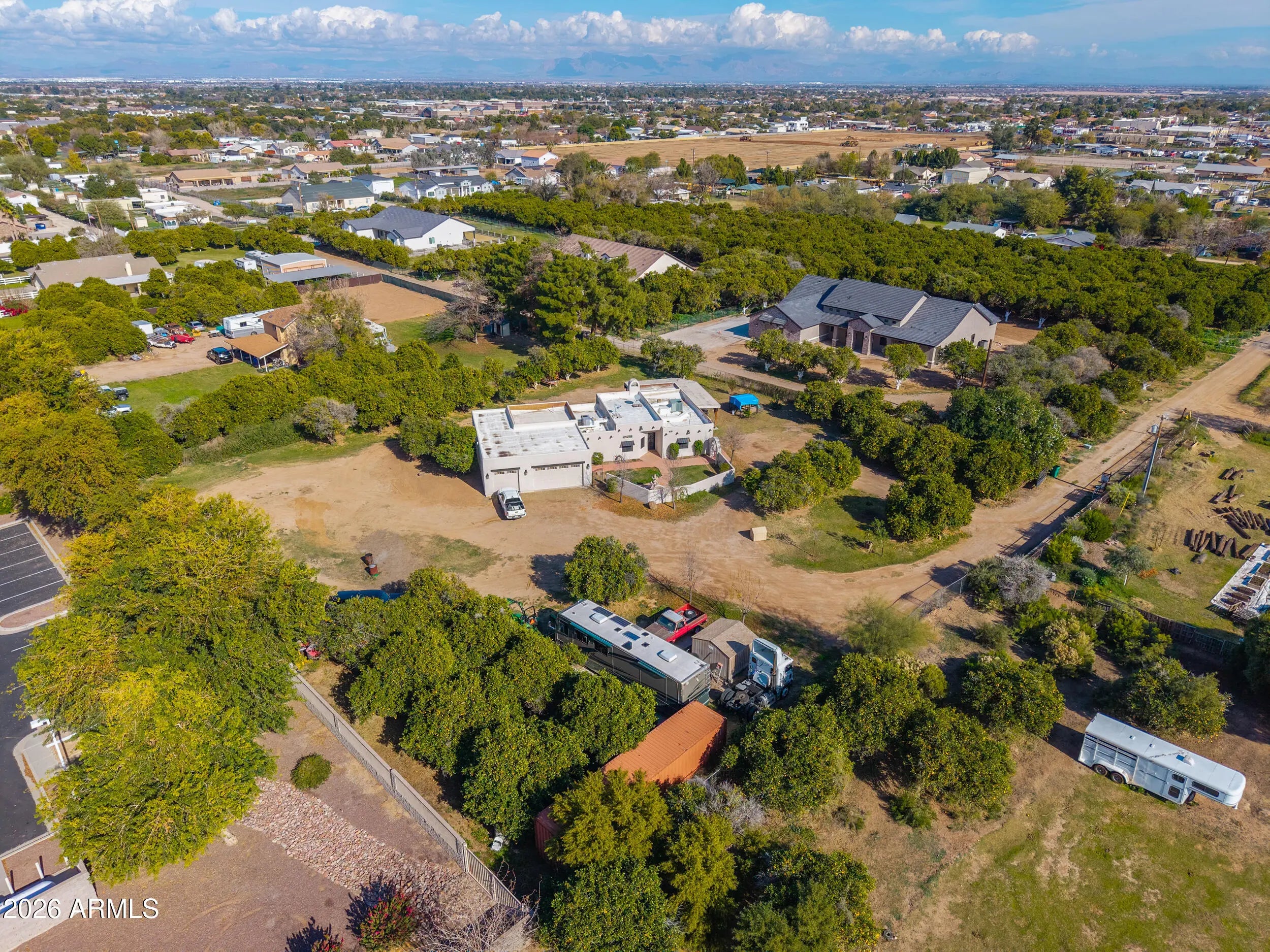 Welcome home to this charming single-level Santa Fe-style custom home set on 1.11 fully fenced acres with gated entry in the heart of Queen Creek with Chandler school district & bussing to Benjamin Franklin & ALA Charter Schools! Enjoy the beauty of flood irrigation, mature landscaping, 25+ mature navel orange trees as well as lemon, key lime, peach, plum, apricot & blood orange trees & chicken coop- all with no HOA & easy access to Chandler & Gilbert! This 2031 sq ft bungalow offers 3 spacious bedrooms, 2 bathrooms & an oversized great room with wood-burning fireplace! The inviting kitchen features ceiling-height Cherry cabinetry, Quartz countertops, large island with farmhouse sink, slate appliances & a cozy dining nook overlooking the tranquil yard! Relax in the gated courtyard with fountain, entertain under expansive covered patios & enjoy the convenience of a four-car pull-through garage and RV hookup with water & electric services & 24x30 slab! A rare property that truly feels like home- offering space, comfort, and timeless charm!