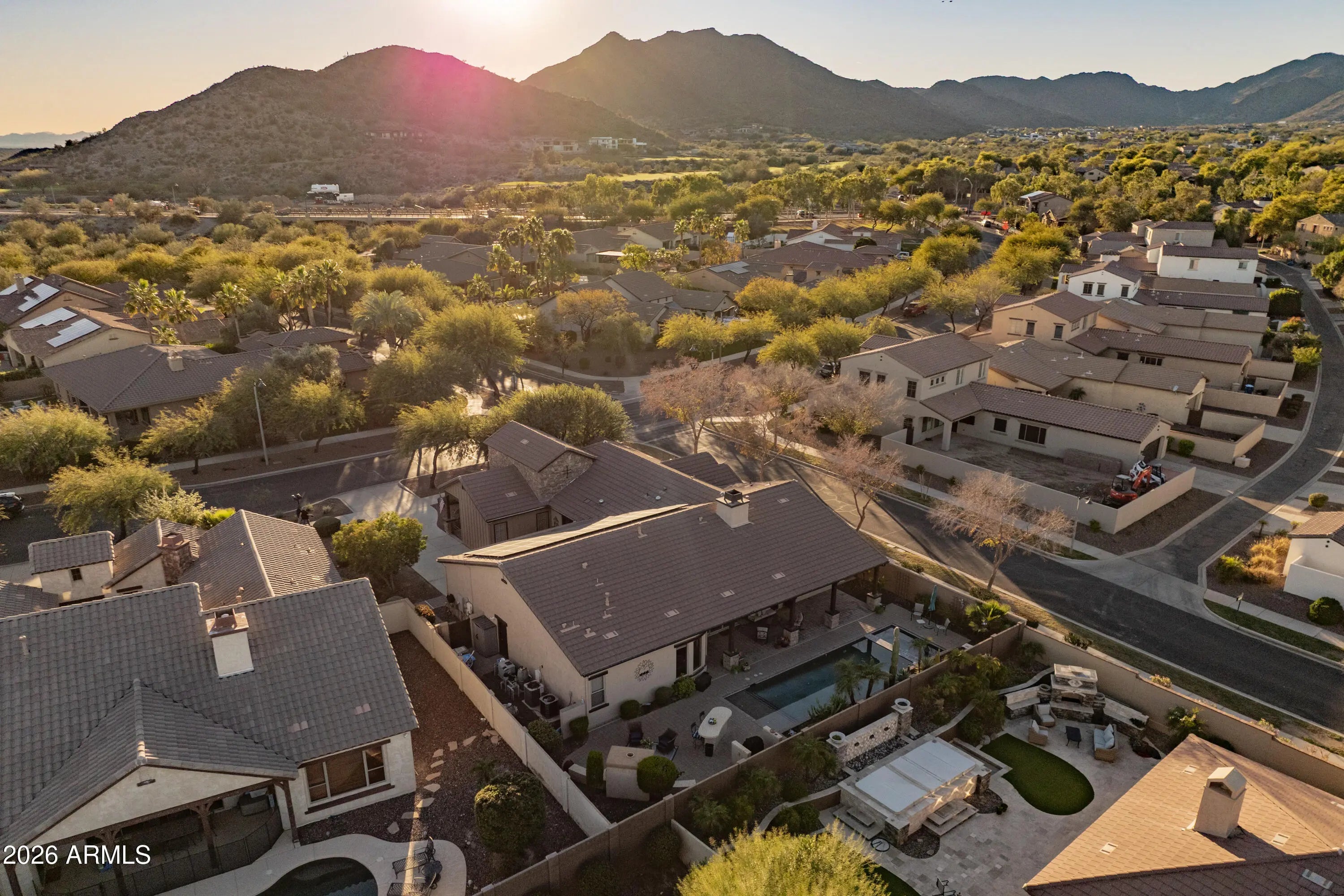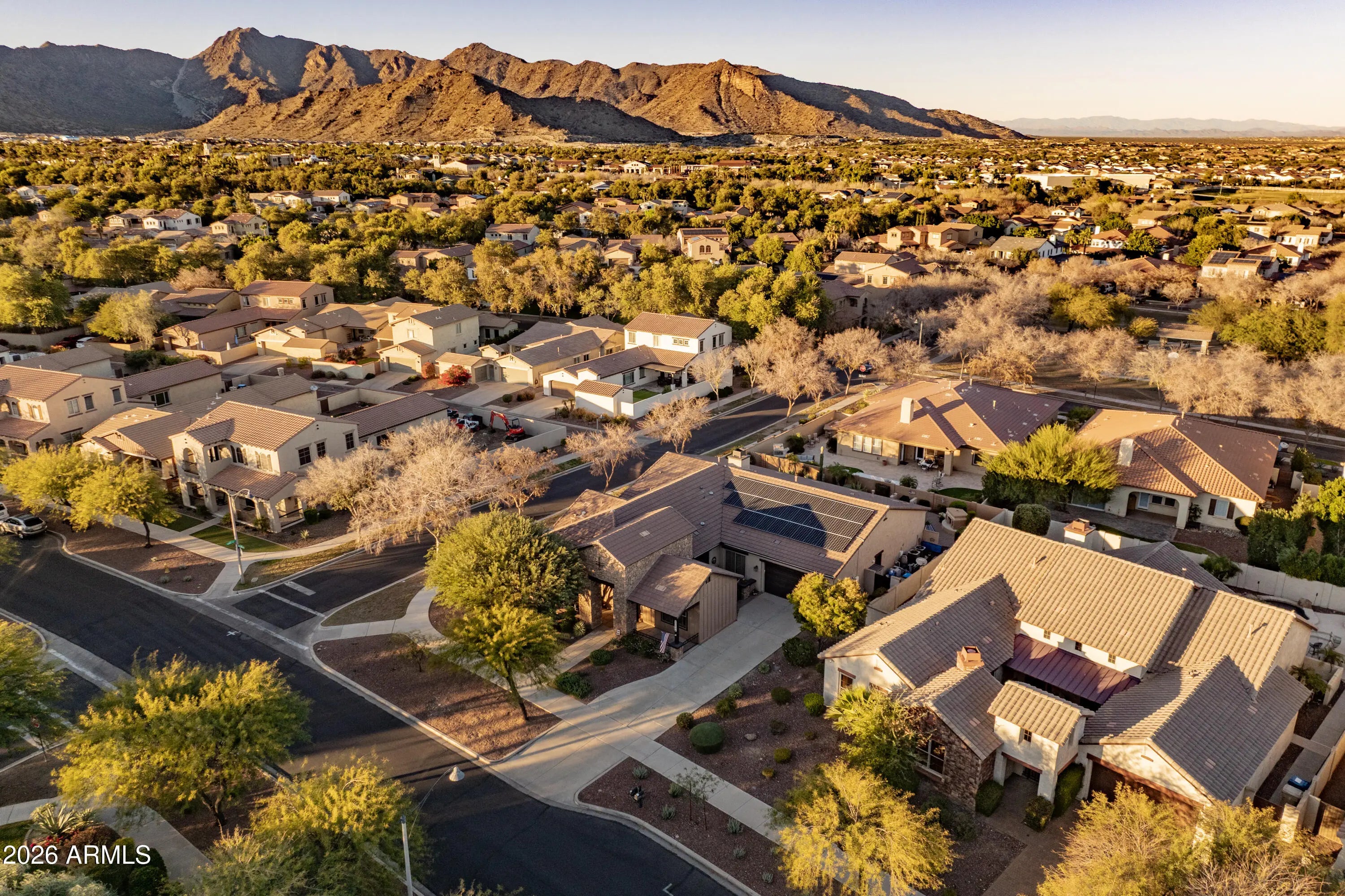 Experience tranquil living in desirable Verrado, where serene mountain views surround you! This charming 4-bed, 2.5-bath corner lot home offers SOLAR with no monthly payments and comforting touches throughout the home. Plantation shutters, crown molding, gated courtyard, exterior gas fireplace, stained glass art upon front entry, flex room, plenty of natural lighting, and formal dining. An elegantly paved backyard and extended covered patio overlooking the sparkling heated pebble tec pool with baja step and built in spa. The gourmet kitchen features granite countertops, staggered oak cabinets, gas cooktop and stainless-steel appliances. A spacious owner suite offering a customized walk-in closet, private bathroom, all-tile walk-in shower, split vanities, and separate exit to the backyard. The 3-car tandem garage is topped with epoxy flooring and custom cabinets equipped for additional storage.