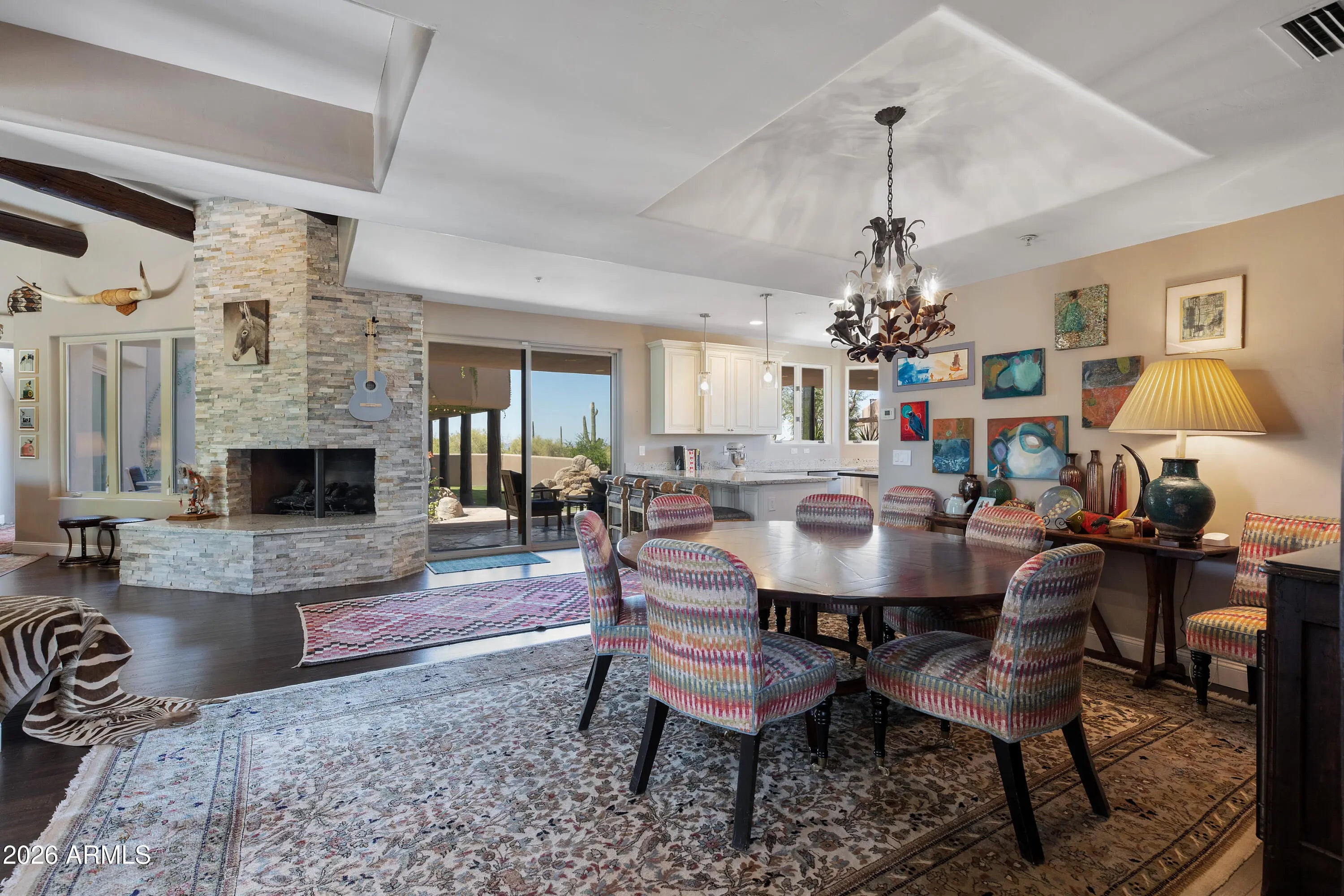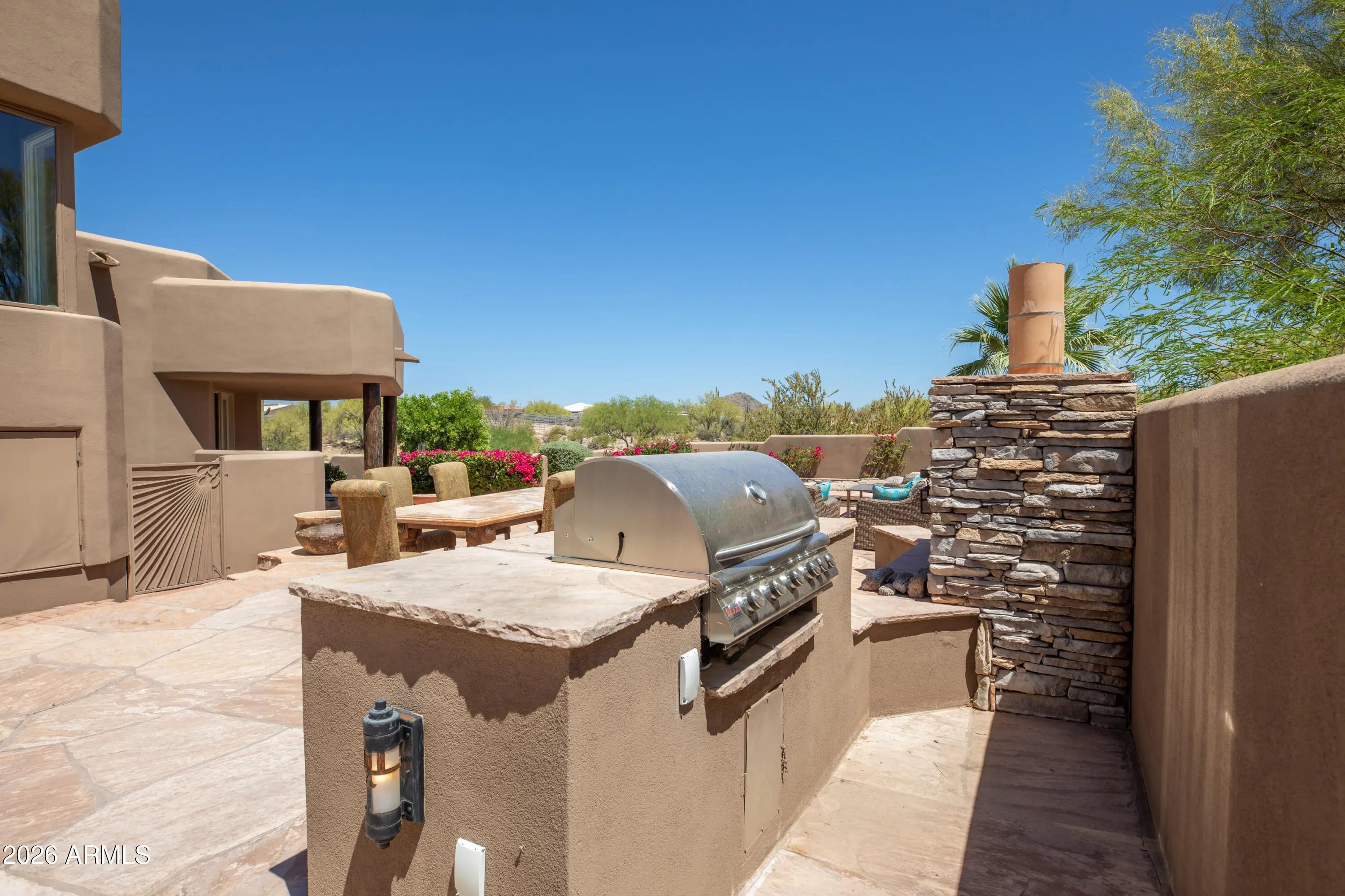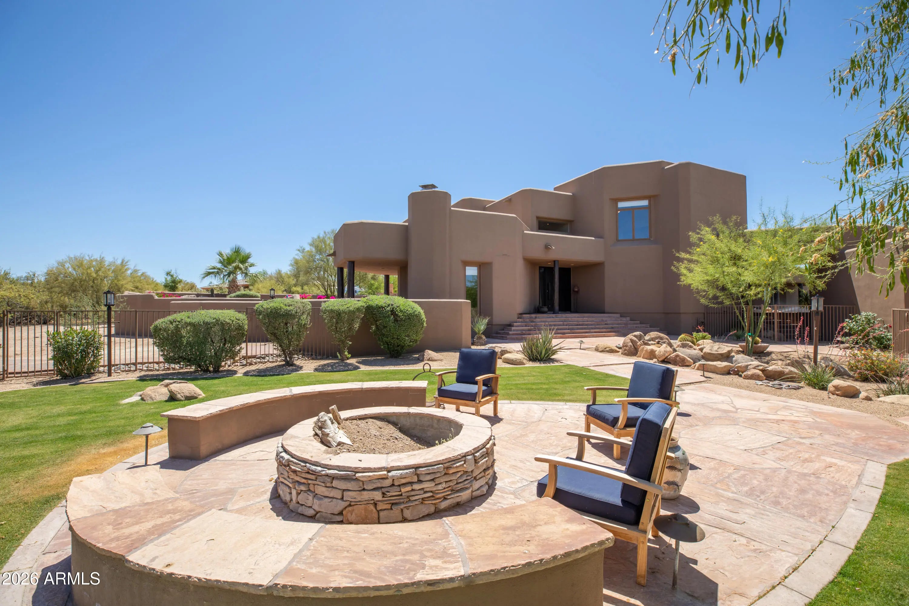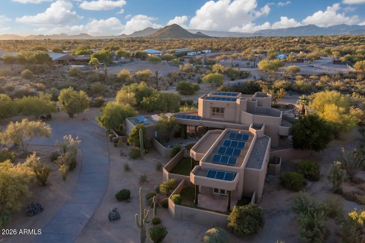 Set on 4.6 acres in a prime North Scottsdale location, this exceptional property captures sweeping desert and mountain views with easy access to shopping, fine dining, world-class golf, off-road recreation, Bartlett Lake, and nearby hiking and riding trails. The thoughtfully designed home offers 4 bedrooms, 3.5 baths, a formal dining room, and a spacious great room with fireplaces, ideal for both everyday living and entertaining. Kitchen features high end stainless steel appliances and a generous prep space. A private upstairs primary suite includes a spa style bath and peaceful views. Resort inspired grounds showcase a heated pool and spa, water features, lush lawns, fire pit, outdoor fireplace, and built-in BBQ. Gated entry and full RV hookups complete this impressive property.