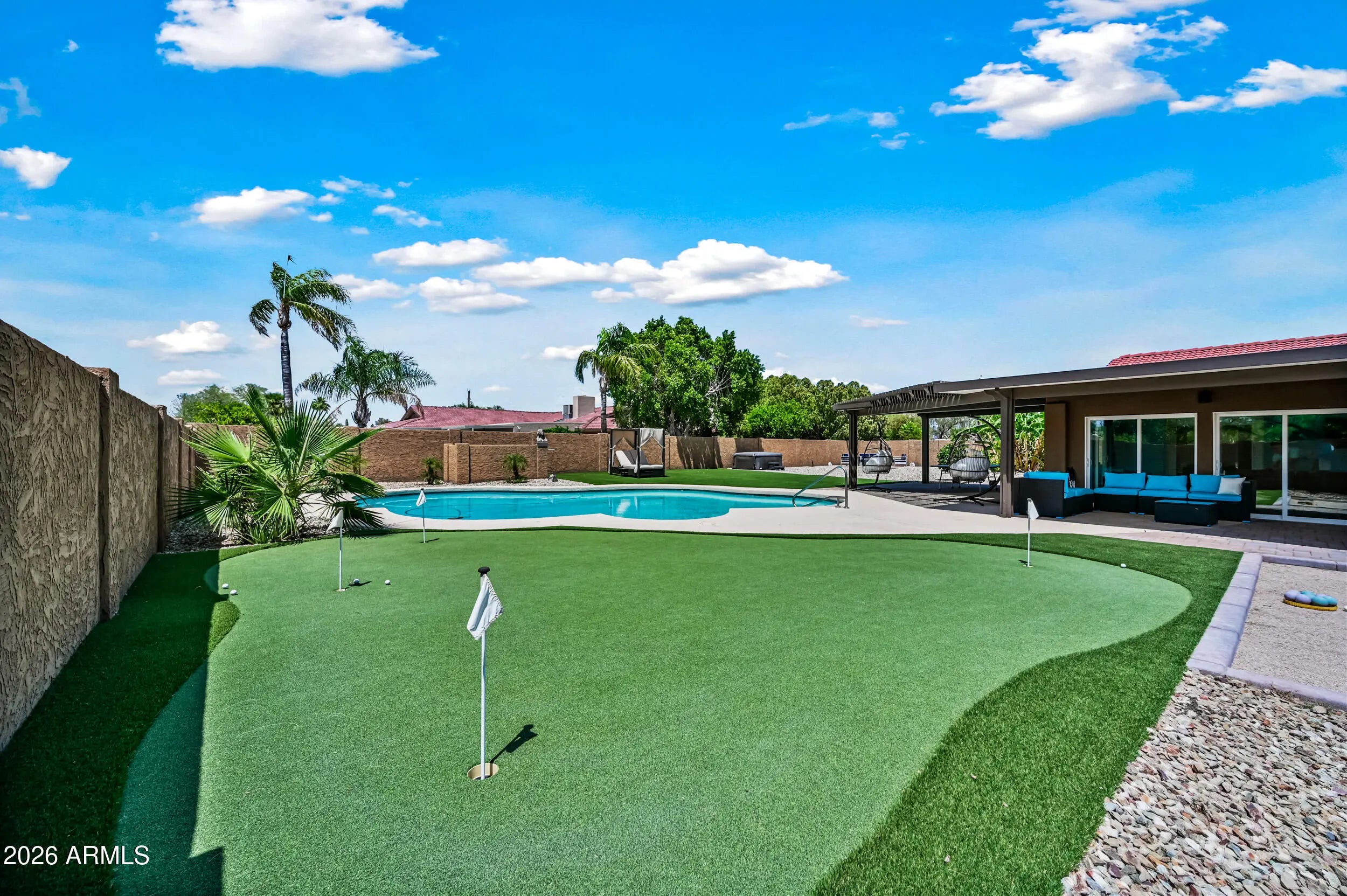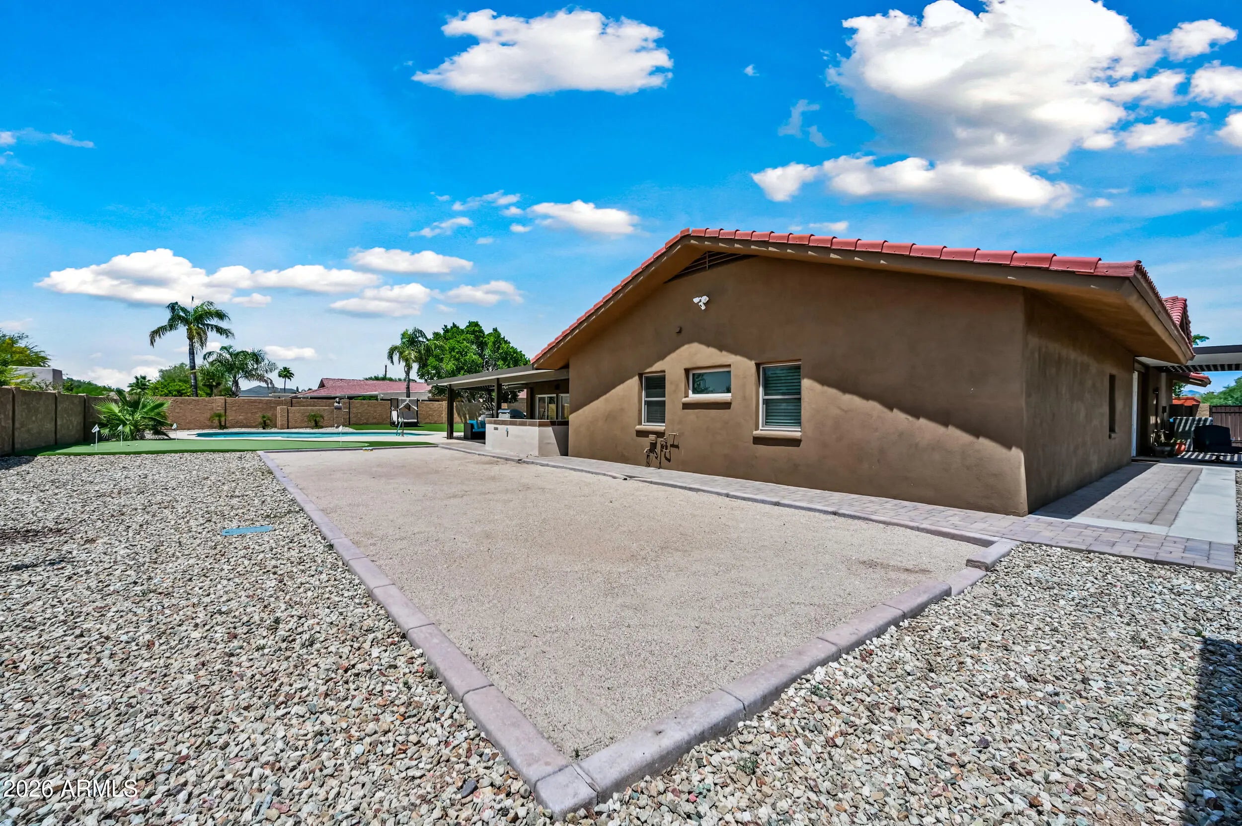 Entertainer's Delight! Located in a well-established neighborhood, this artist residence is perfect for entertaining & family. An open floorplan makes the bright kitchen, center island, dining room with stone fireplace, wine bar & spacious living room the heart of the home. Relax in the sitting/library area or hang out in the large bonus room that could be a studio, exercise room, kids' playroom or additional family room. The expansive backyard includes a RV gate, detached garage, built-in BBQ, covered patio, inviting pool, fun putting green & a sand bocce ball court for friends & family to enjoy! The low maintenance artificial turf stays green all year. Close to the elementary school. Plenty of shopping & restaurants at Kierland & The Scottsdale Quarter makes this a prime location.