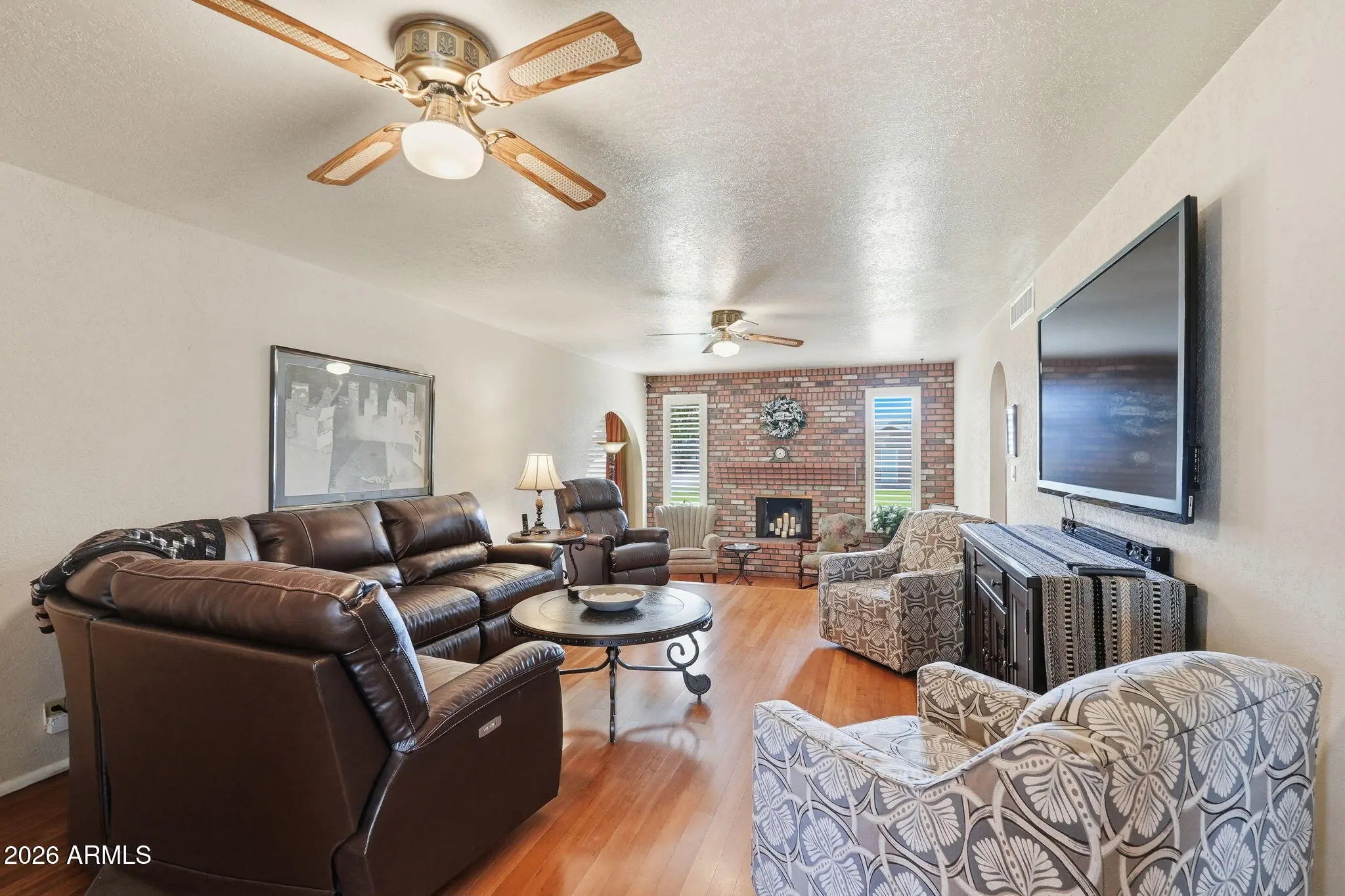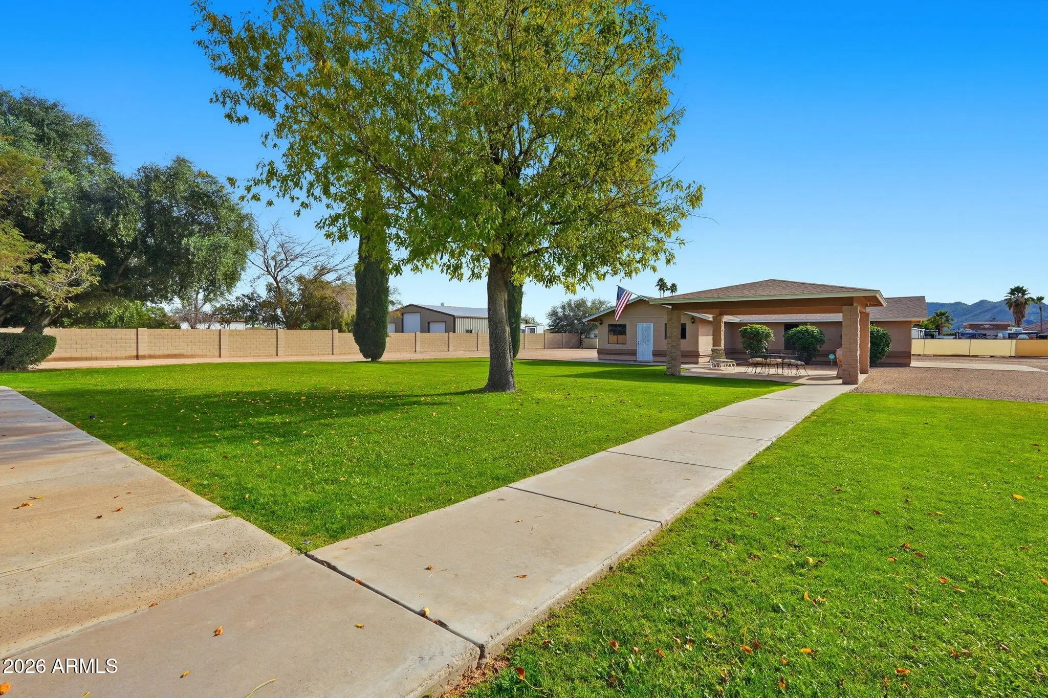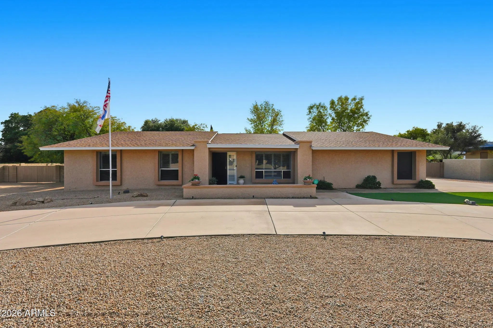 Spacious single-level custom home in the desirable Glendale community of Saddleback Meadows - situated on a rare 1.1+ acre horse property lot with no HOA, mountain views & North/South exposure. Thoughtfully designed & meticulously maintained by the original owner, this residence features 6 bedrooms, 4 bathrooms, & 3,571 sq. ft. of total livable space with 5,168 sq. ft. under roof, delivering an impressive blend of scale, comfort, & functionality. The main residence showcases a new roof (2022), granite countertops, newer fixtures, & a thoughtful mix of carpet, tile, & wood flooring. The inviting family room & bar area are anchored by a wood burning masonry fireplace, creating an ideal space for gathering & entertaining. Additional highlights include plantation shutters, solar screens, a security screen door, and a central security system with cameras. The spacious primary suite offers a private sitting area, walk-in closet, & walk-in shower, while a notably large secondary bedroom (22.5' x 12') provides exceptional flexibility. Laundry room cabinetry is included, along with washer, dryer, & refrigerator. Enhancing the property is a fully separate guest house designed for privacy & comfort, complete with new HVAC (2025), roof (2025), & water heater (2025), fresh interior & exterior paint, travertine stone & carpet flooring, a full kitchen, living area, washer, refrigerator, security screen door, & a dedicated 2-car garage. Comfort is ensured year-round with three electric heat pumps (east unit 2011, west unit 2021, guest house 2025), central air with three new thermostats, & ceiling fans throughout. Parking & storage are abundant with a 2-car garage on the main home featuring epoxy floors, built-in cabinetry, & automatic garage doors, plus a full concrete 16' circular driveway, eight slab parking spaces, & two 12' RV gates with iron & wood construction. Outdoor living is equally impressive, offering a 592 sq. ft. covered patio, a 20' x 20' gazebo, iron fire pit, rear grass yard, & front desert landscaping with turf. Automatic irrigation systems serve both front & rear yards, with front trees on timer irrigation. The property is partially enclosed with block & chain-link fencing, providing privacy while maintaining openness. Constructed with block and concrete foundation, masonry/stucco & wood framing, & blown cellulose insulation, this well-appointed estate presents a rare opportunity for single-level living with exceptional versatility, quality construction, & enduring appeal. Come check this home out today!