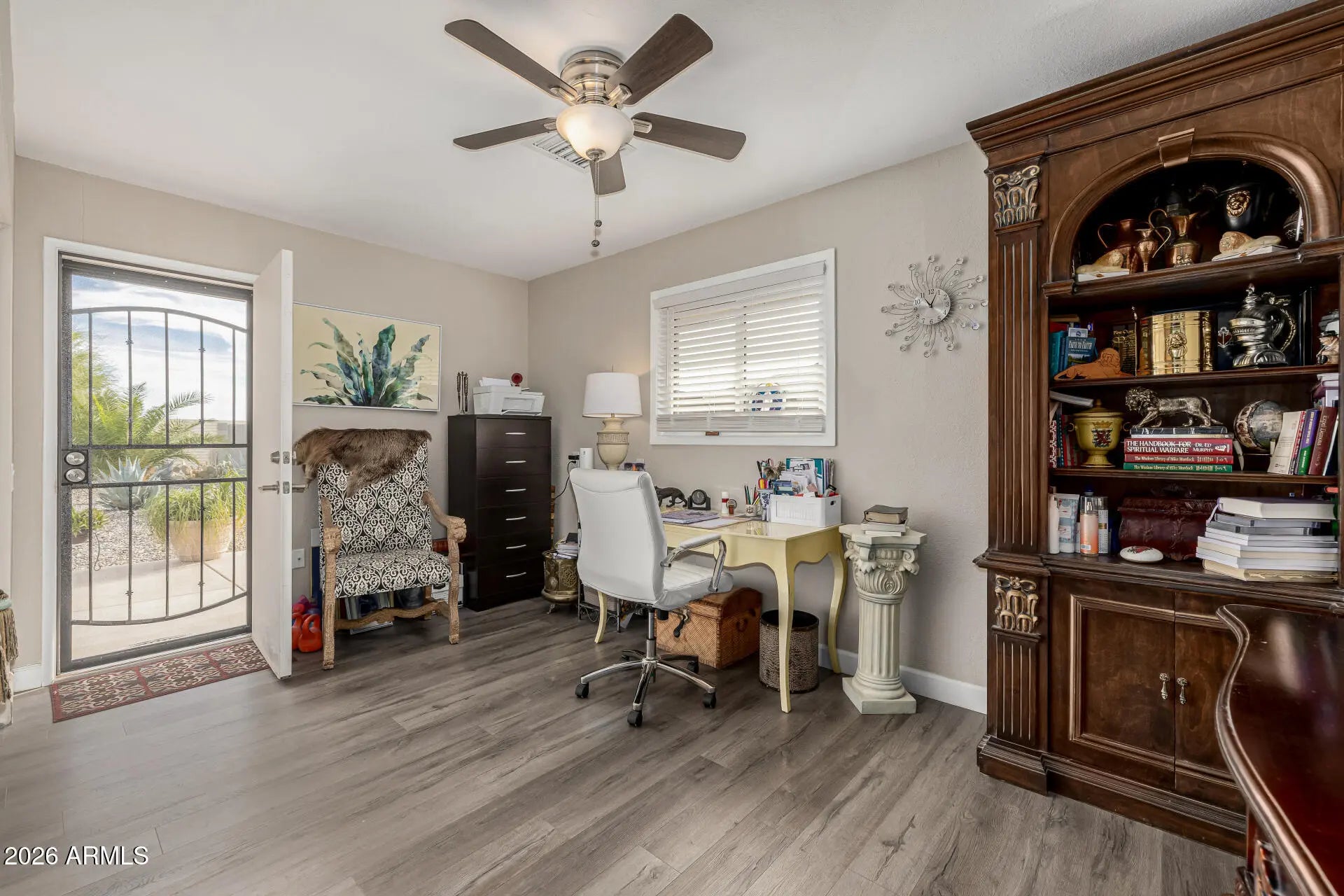 Prepare to fall in love with this well-maintained home with a 2.5-car garage! Inside, discover an inviting living room along with a desirable great room filled with tons of natural light. Neutral palette creates a warm, welcoming atmosphere, enhanced by wood-look flooring, ceiling fans, and recessed lighting that brightens every corner. Spotless kitchen is a cook's delight! Stainless steel appliances, a pantry, tile backsplash, ample cabinetry, quartz counters, and a prep island with a breakfast bar complete the picture. In the main bedroom, you'll have a walk-in closet and an ensuite with dual sinks. PLUS! Flexible bonus room can be used as an extra bedroom, office,, or media space. Spacious backyard has a covered patio, where you can relax with your favorite drink in peace. Don't miss!