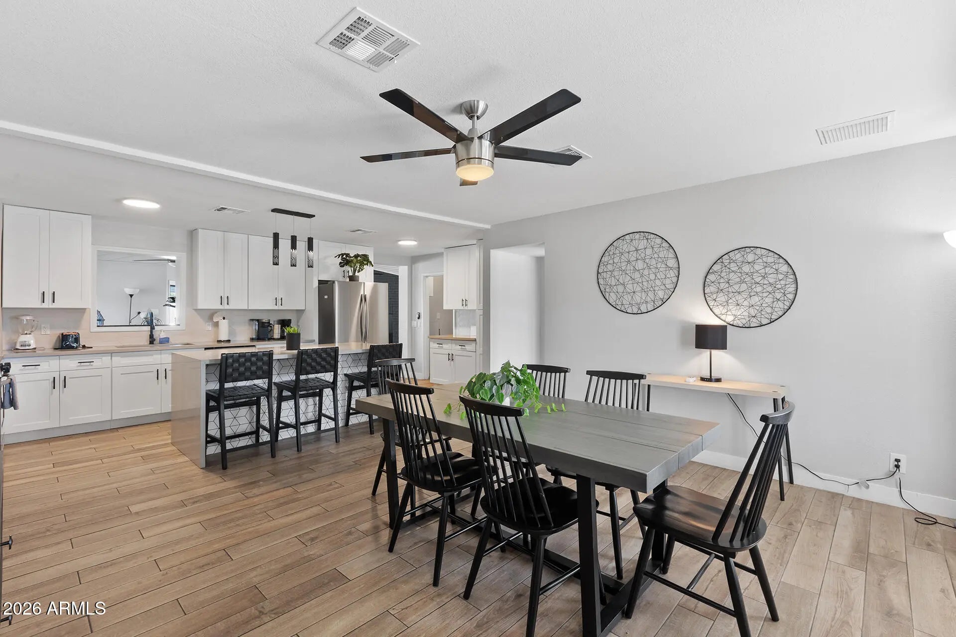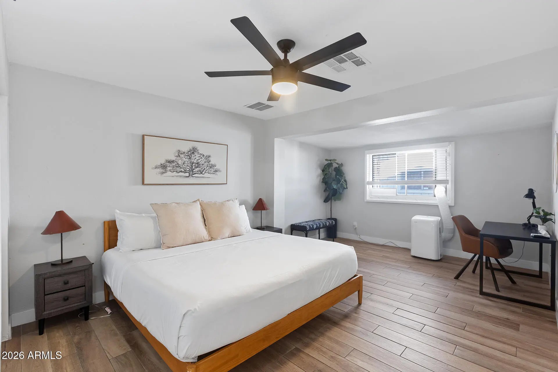 A rare investment gem, this updated 4-bed, 2-bath home is already cash-flowing as a successful Airbnb, with the seller willing to include all furniture! Featuring a detached garage with a large rear-access gate, NO HOA, and recent updates throughout, this property is both a move-in-ready home or a turnkey income opportunity. Enjoy timeless charm with desert landscaping and a welcoming covered front porch. Inside, the versatile floor plan offers a bright bay window, a spacious family room with vaulted ceilings, a cozy fireplace, and a stylish dry bar; ideal for entertaining. The beautifully updated kitchen features white Shaker cabinets, quartz countertops, an undermount sink, and a modern tile backsplash. Bedrooms are generously sized, including a comfortable primary suite with an en suite bath and a private sitting room. The backyard provides a perfect blend of relaxation and function with a covered patio, grassy yard, and the standout detached garage. All this in a prime location near ASU with easy freeway access - an excellent home or investment with unbeatable flexibility!