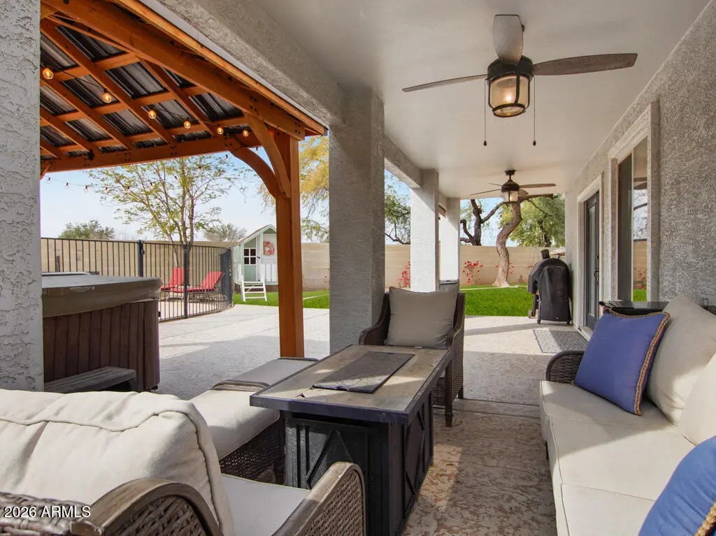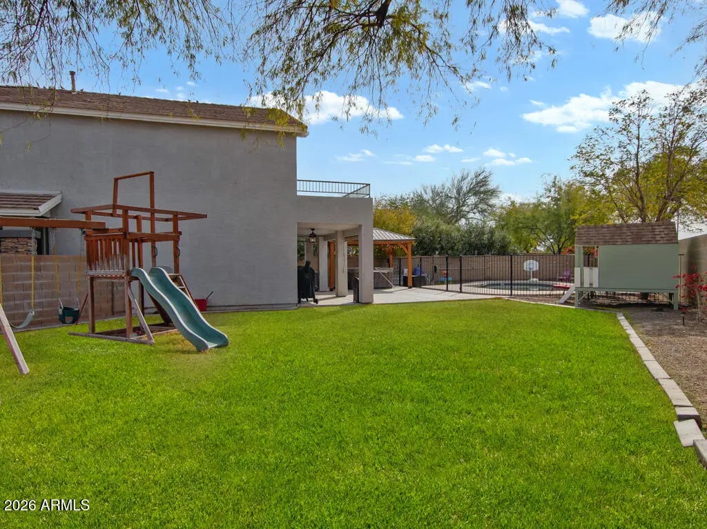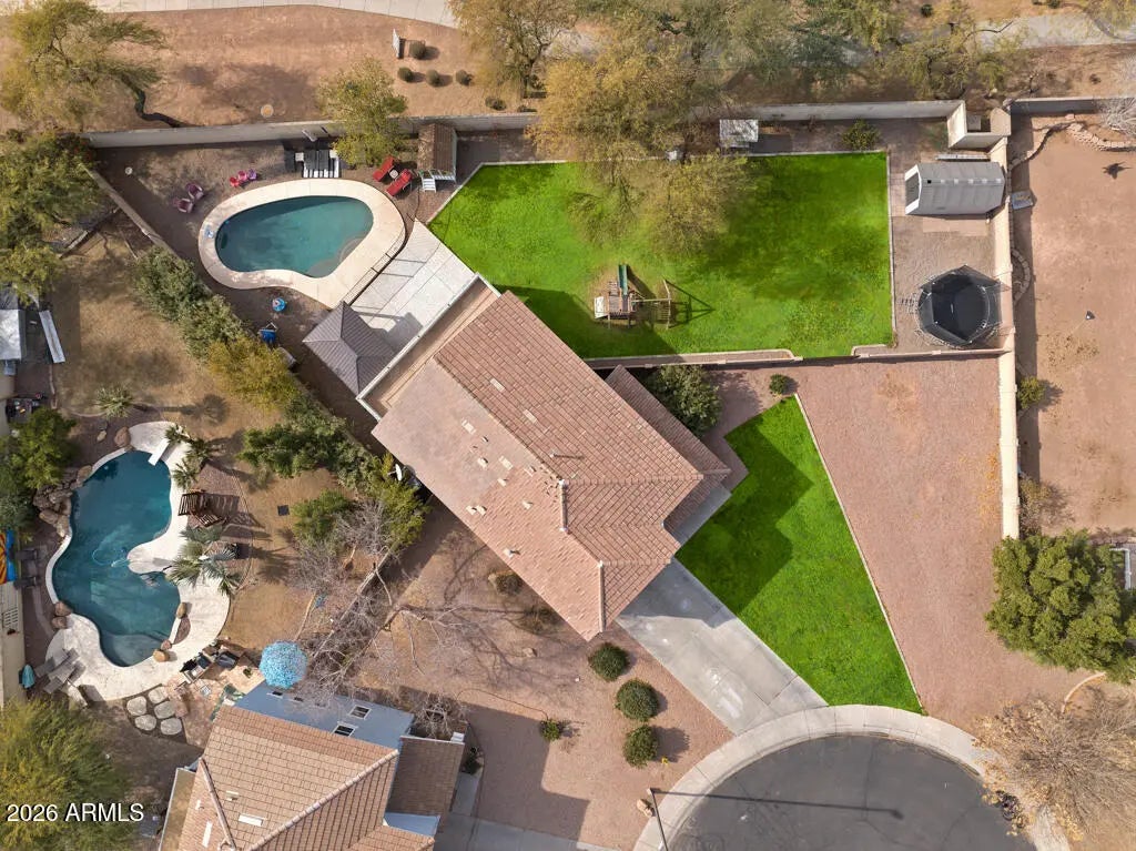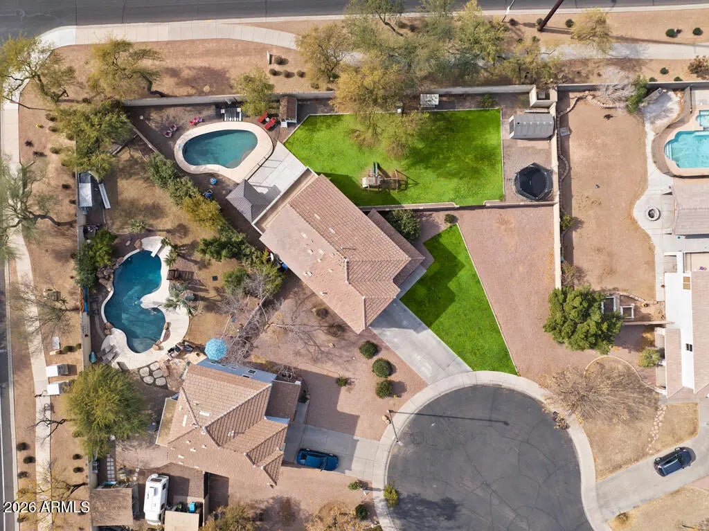 MASSIVE LOT! MAJOR UPGRADES! Beautiful home, located on an oversized, cul de sac lot with no backyard neighbors! Conveniently located near the 202 and San Tan Mall. Amazing backyard for entertaining. Includes a pebble tec pool, hot tub, gazebo, and large grass area with RV gate and shed. 4 bedrooms, 2 bathrooms, loft, and laundry room upstairs. Den and 1/2 bath downstairs. Great neighborhood with waking paths, basketball courts and playground within walking distance of home. - New indoor paint in 2022 - Complete re felt of the roof and replaced/resurfaced the balcony in 2023 - New pool pump in 2023 - New energy efficient window/sliding glass door in the upstairs, back part of the home. 2023 - Paved and stamped new patio in backyard 2023 - Wired garage for electric vehicle