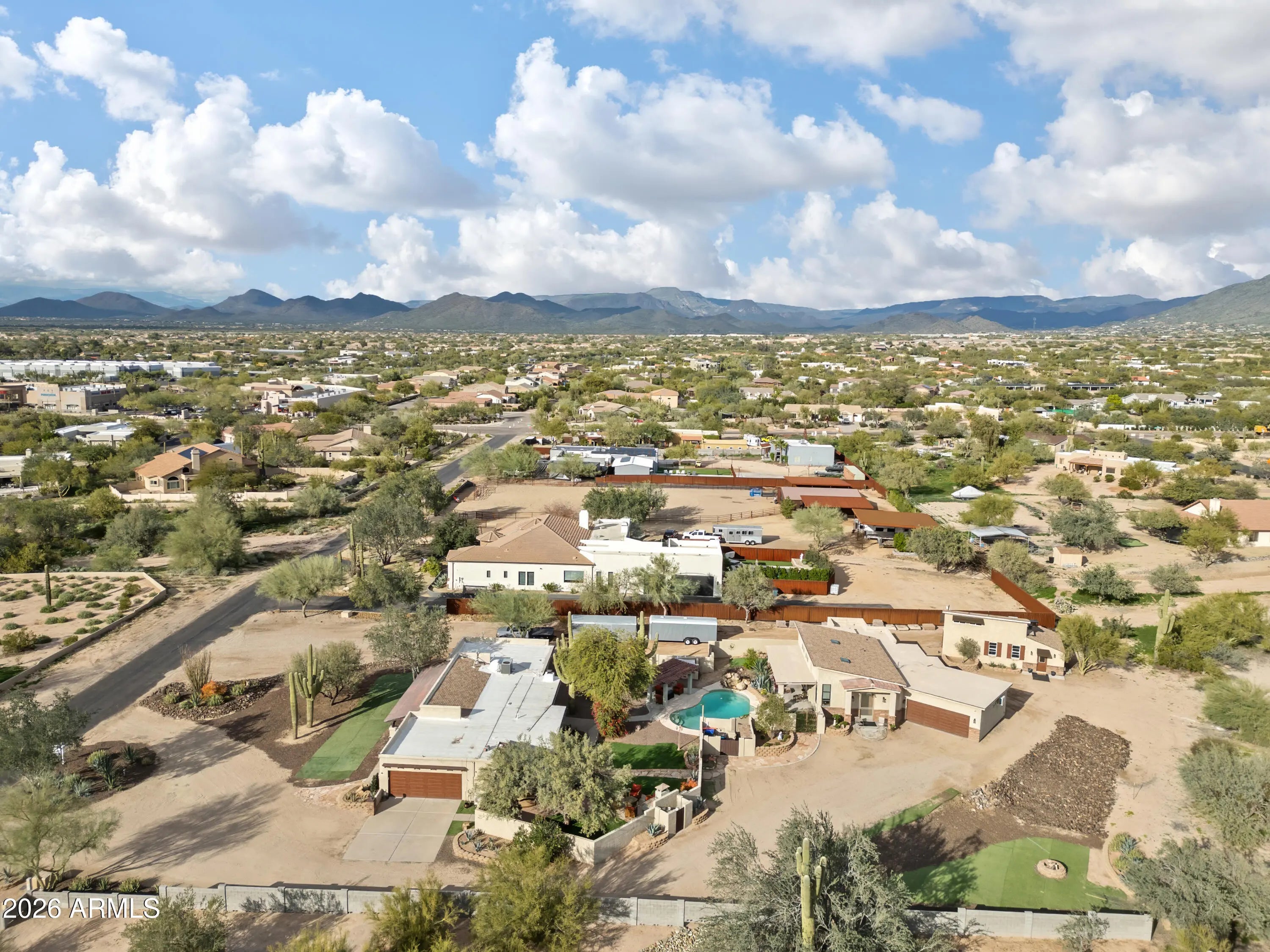 Set on over an acre along a paved road in the heart of Cave Creek, this exceptional horse property offers rare versatility with three separate livable structures, including two ADUs, making it ideal for a multi-generational compound, guest retreat, or income-producing opportunity. The main residence features 1,351 square feet with a solid footprint and classic character, offering the perfect canvas for thoughtful updates to customize to your taste. Complementing the main home are two detached guest residences—approximately 1,500 square feet and 600 square feet—both showcasing newer construction and modern finishes, providing move-in-ready accommodations for extended family, guests, or rental use. Designed for outdoor living and entertaining, the property boasts a private backyard oasis complete with a pool, fireplace, outdoor kitchen, and an abundance of low-maintenance artificial turf, creating a resort-style atmosphere with minimal upkeep. The expansive acreage provides ample space for horses, recreation, and privacy, all while maintaining convenient access via paved roads. Adding to the property's functionality are two separate septic systems, enhancing flexibility and long-term usability for multiple dwellings. This is a rare opportunity to own a highly adaptable estate in Cave Creekwhere a few interior updates to the main home can transform this property into a truly remarkable compound tailored to your vision.