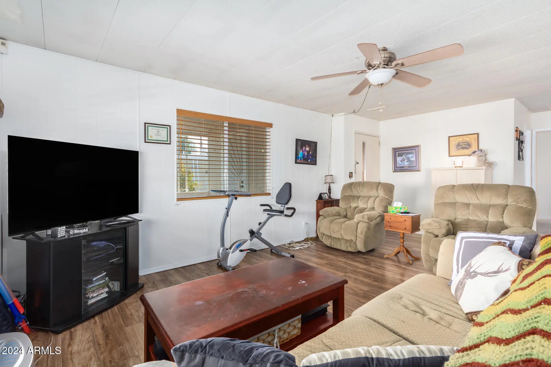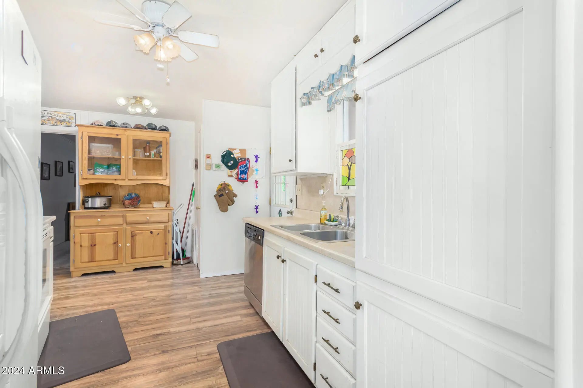Double wide mobile home nestled in the Gated 55+ Community of Friendly Village of Orangewood! New roof. AC/heating and water heater maintained by Goettl regularly and have supporting documentation. This multi-wide gem offers a great room with built-in china cabinets in the dining area. The kitchen showcases ample counters, a pantry, plenty of cabinets, and built-in appliances for all your cooking needs. Spacious main bedroom and a private bathroom for added comfort. Both bedrooms are carpeted and include their own walk-in closets. Outside, relax under the covered deck while enjoying your favorite beverage. Unit also includes attached storage housing washer and dryer which are included. Community amenities are a clubhouse, pool, spa, gym, and more. You won't be disappointed!