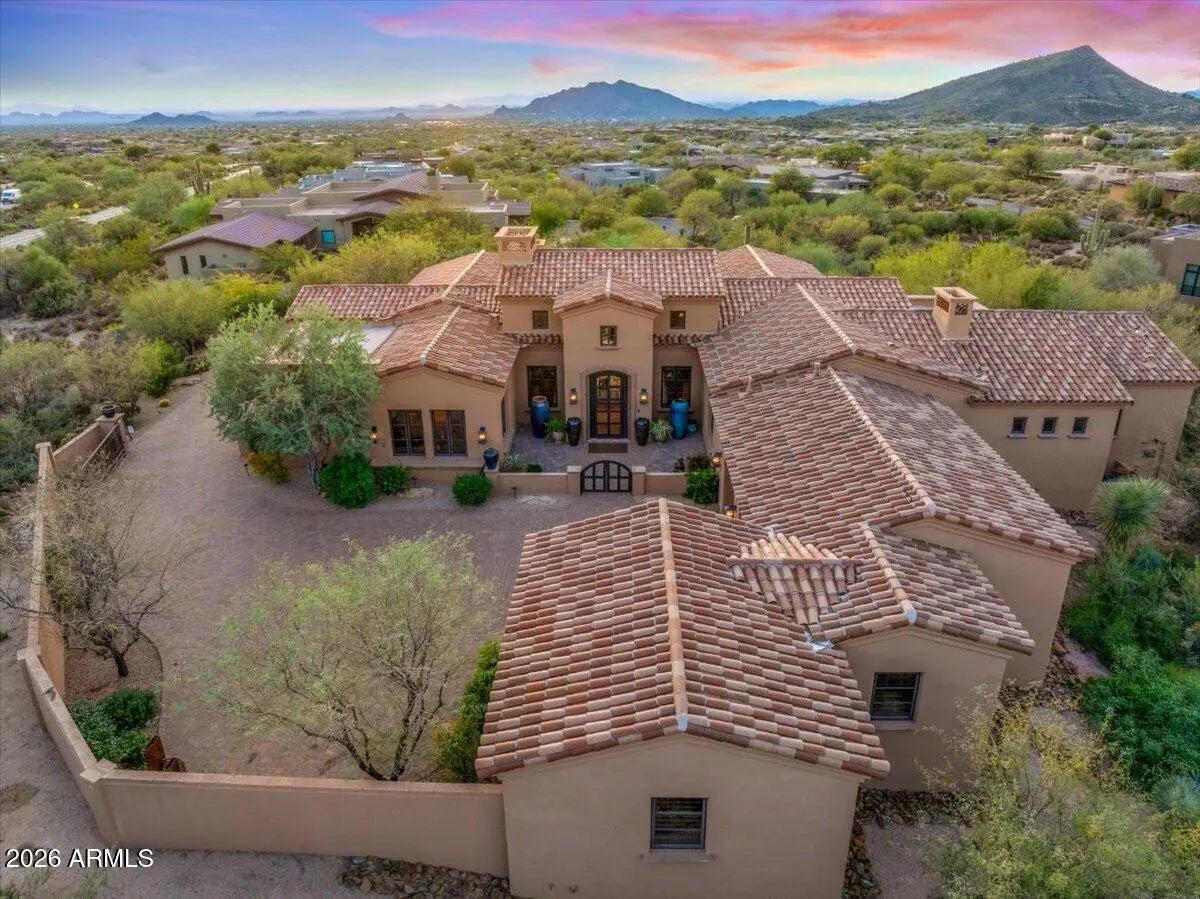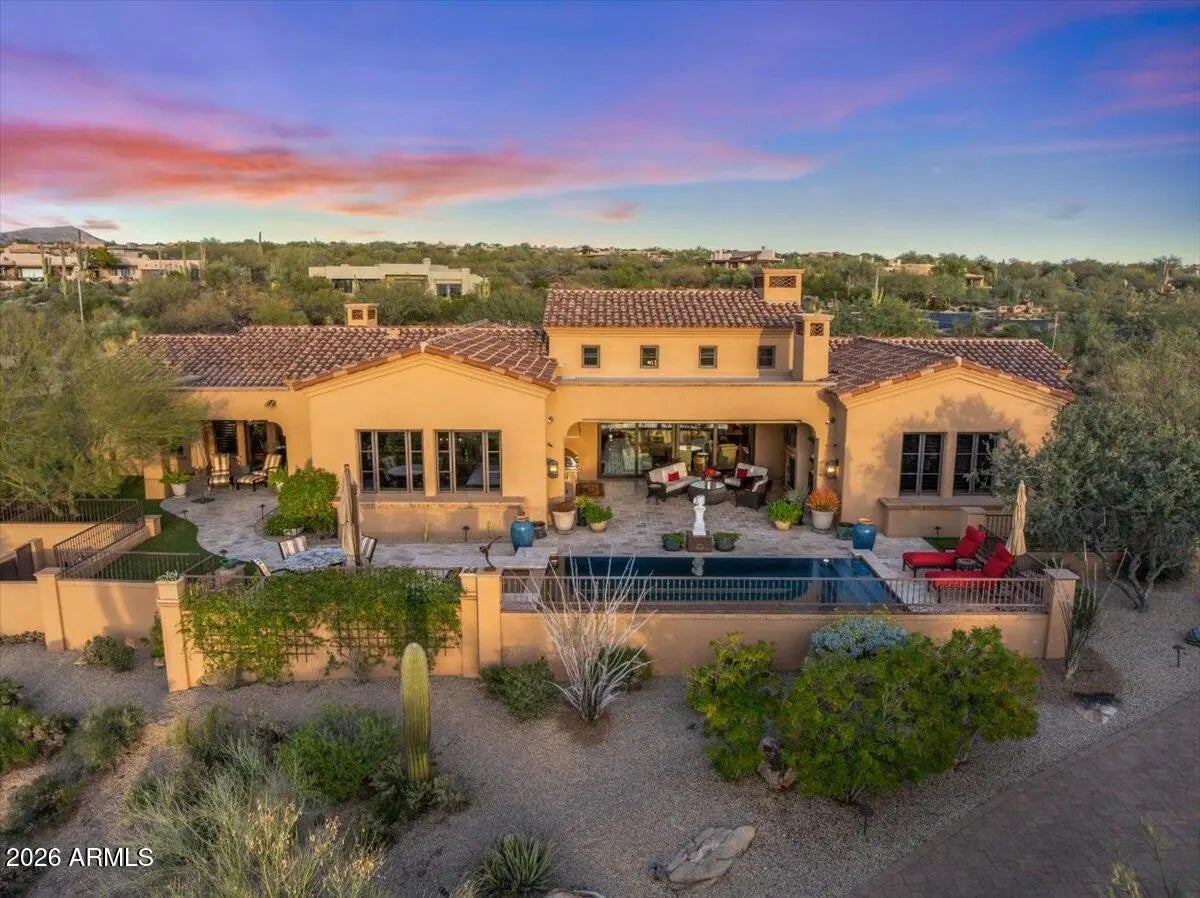 Coveted Lifestyle Membership Available! This Santa Barbara-style estate offers a functional layout with quality craftsmanship throughout, creating a warm and welcoming interior. Arrive through a private gated motor court. The elevated homesite offers views of sunsets, mountains and city lights. The gourmet chef's kitchen is a appointed with high-end Wolf, Sub-Zero, and Bosch appliances, custom cabinetry, dual Taj Mahal quartz-topped islands, a walk-in pantry, and a 250-bottle temperature-controlled wine wall.The residence encompasses four ensuite bedrooms, a spacious dedicated office, and four bathrooms. The desirable split, open great room floor plan showcases an expansive primary suite, featuring a customized walk-in closet Classy Closets. The spa-like primary bathroom elevates luxury with separate his and her water closets and a extra large steam shower. A separate junior primary suite enjoys direct access to the back patio. The sophisticated outdoor living space features a custom built-in barbecue station and overlooks the spectacular heated negative-edge pool and spa. Completing the property is an oversized three-car garage with epoxy flooring and tons of storage. The third bay is currently configured as a climate-controlled flex space, ideal for a private gym but can easily be turned back to garage space as no permanent modifications were made that would affect its original use.