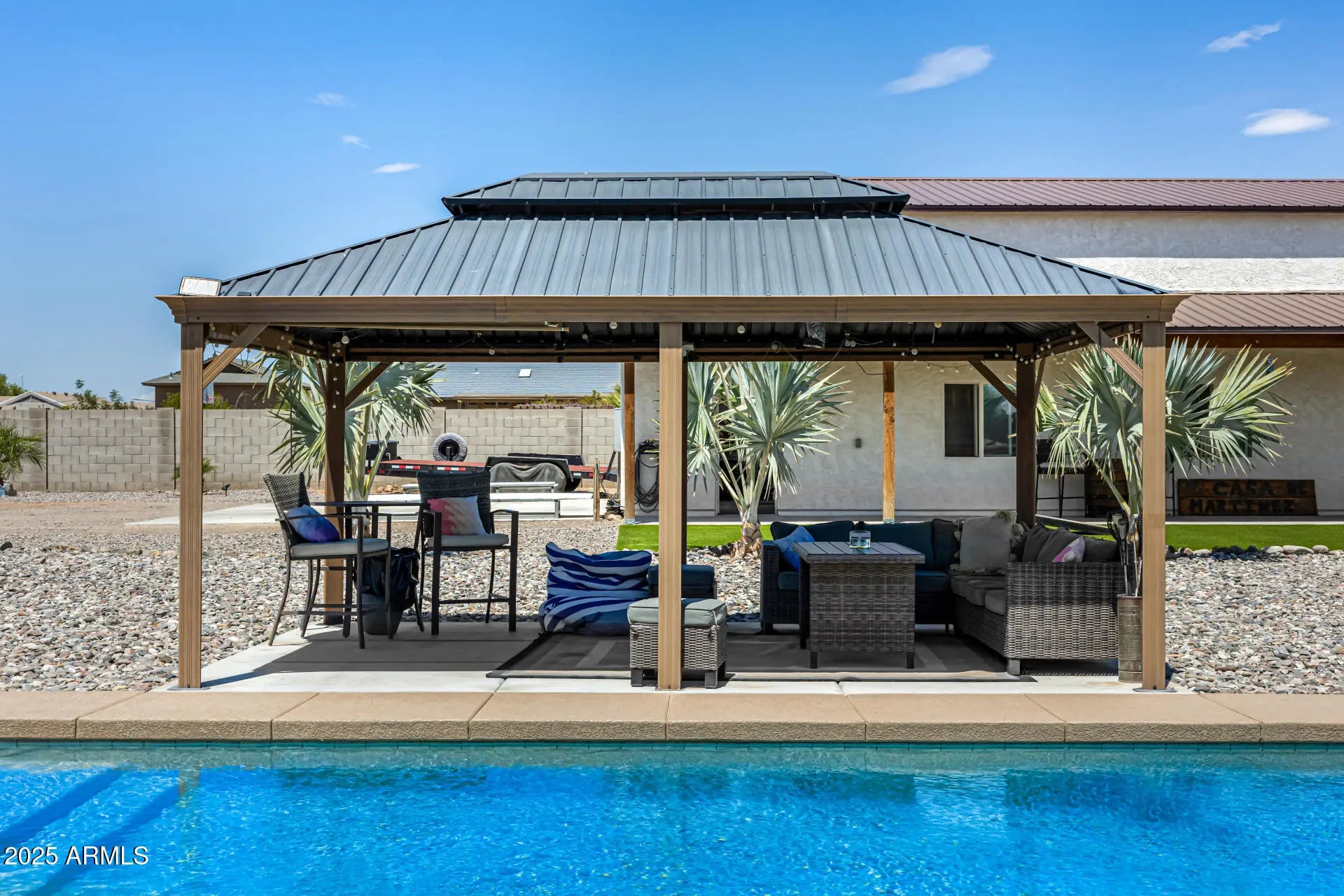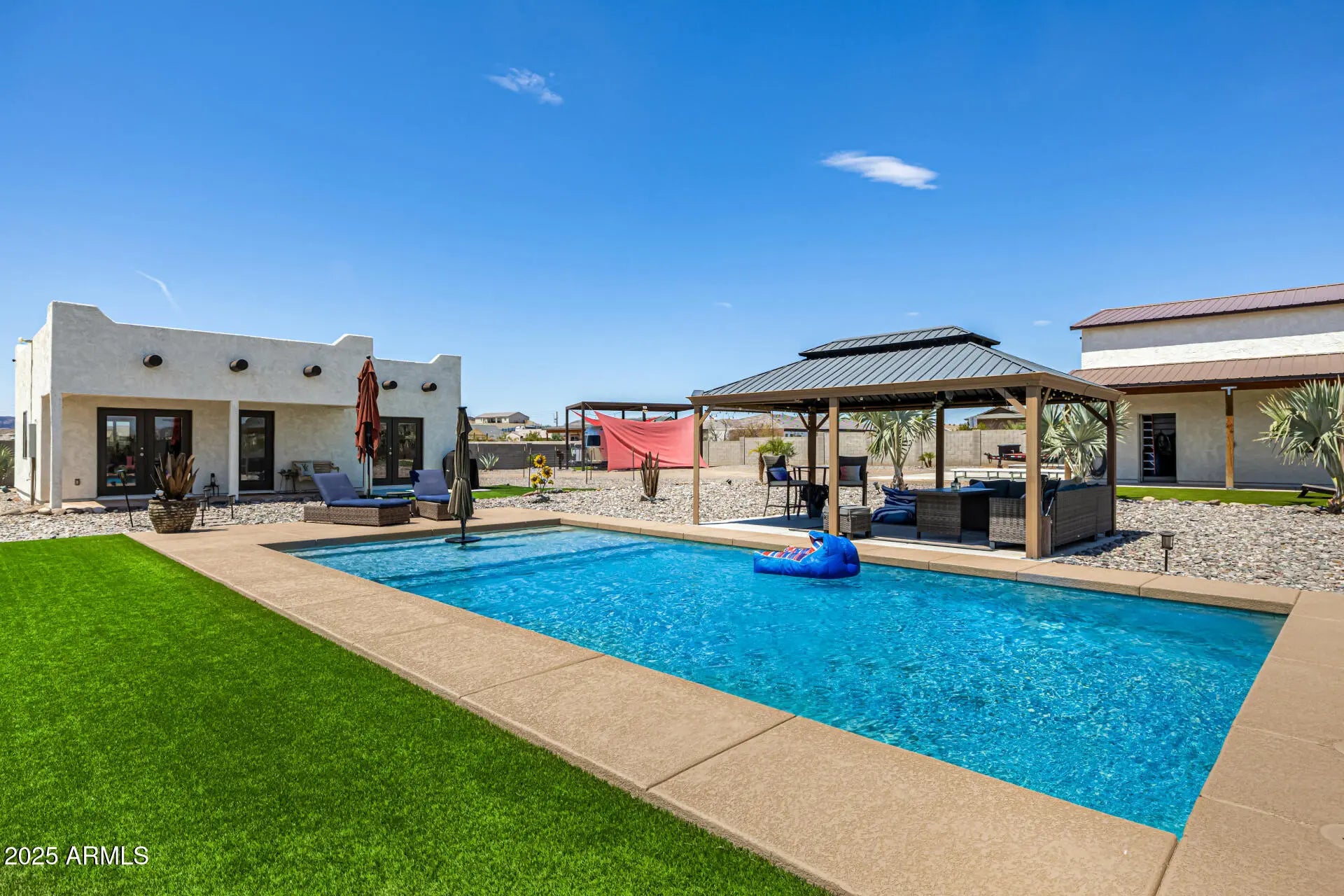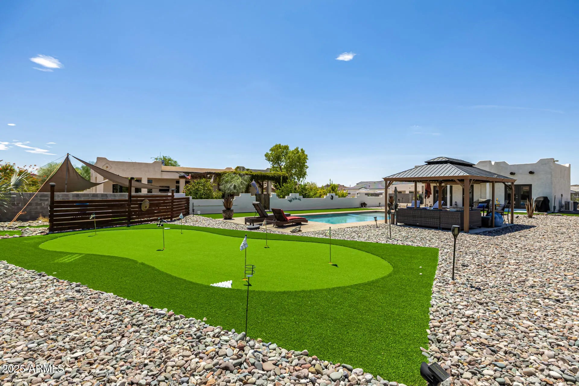 This is a one of a kind RESORT like property in the San Tan Valley Foothills. This beautiful listing sits on 1.27 acres, no HOA. The Santa Fe Style main home welcomes you with a KIVA fireplace, and boasts 3 bedrooms with 2.5 bathrooms. Detached designer casita with Saltillo tile (2023). Casita Airbnb book of business included. Walking out into the backyard, a beautiful OASIS awaits! BBQ under a large pergola with gas grill/wok. Also a lap pool and jacuzzi. Further back on the property, cool off in the saltwater pool (2023) or practice your swing on the putting green! Store your RV or other vehicles in the HUGE RV garage/shop, with a 4 post lift & loft (2023). Additional RV hook up with electric, sewer & water. Extensive landscaping.