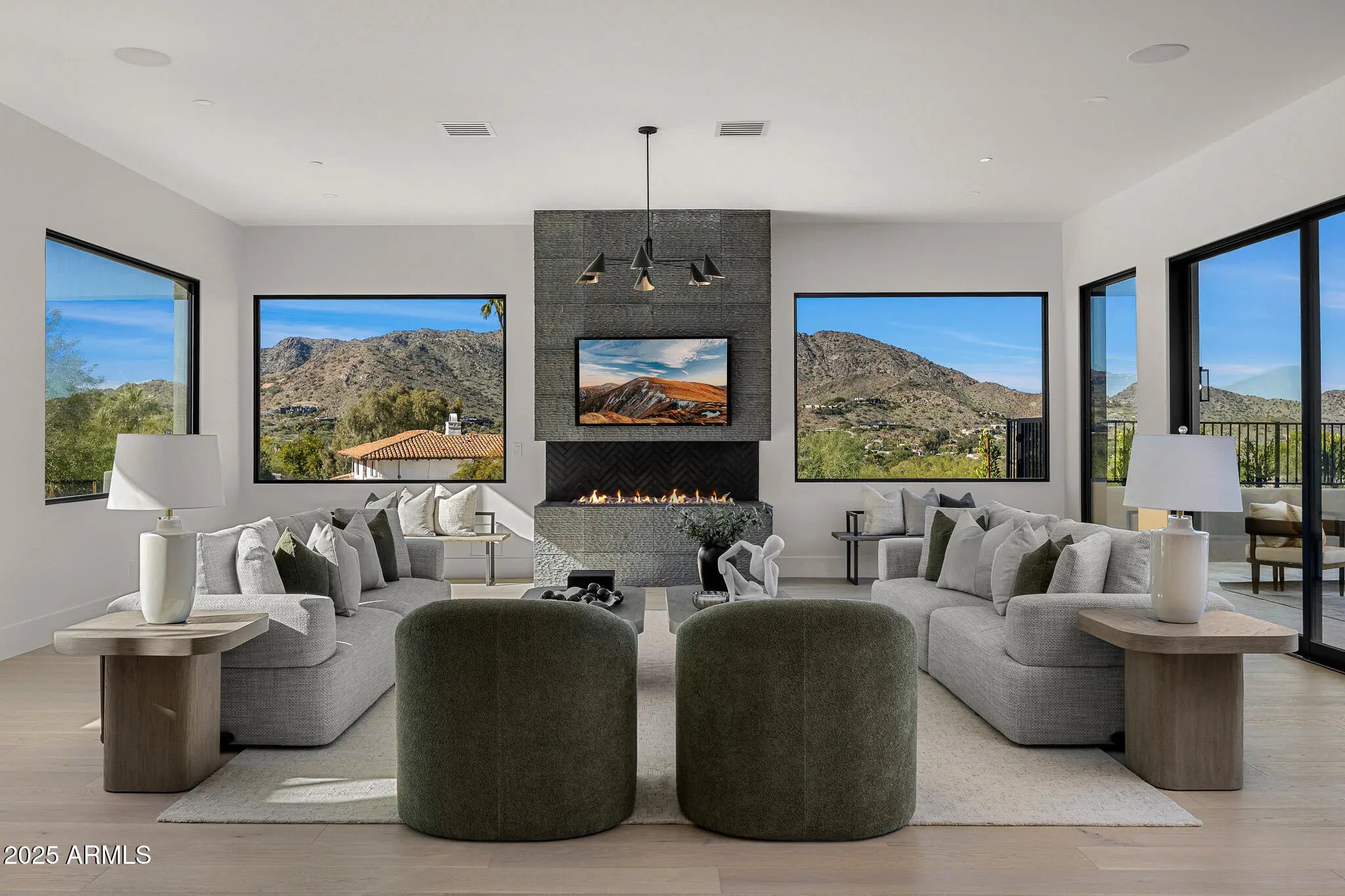 Perched gracefully on a coveted Paradise Valley hillside, this newly constructed modern residence captures sweeping valley views and unforgettable Arizona sunsets. Clean architectural lines, designer finishes, and a refined sense of style define every space, creating a home that feels both dramatic and effortlessly livable. A striking entry welcomes you into a spacious formal living room anchored by a sleek fireplace, flowing seamlessly into an elegant dining area and a temperature-controlled wine room—ideal for intimate dinners or sophisticated entertaining. The statement kitchen features sleek cabinetry, a stunning quartz island, and a contemporary aesthetic that opens to a cozy family room, all while overlooking both the front and rear grounds for an abundance of natural light and connection to the outdoors. The main-level primary suite is a true retreat, offering multiple sitting areas and an oversized spa-inspired bathroom designed for total relaxation. Upstairs, three generously sized guest suites provide comfort and privacy, while an oversized game room adds versatility for entertaining, lounging, or play. Outdoors, the beautifully designed backyard showcases a resort-style pool and an elevated setting perfect for soaking in iconic Arizona sunsets and city-light views. This is modern Paradise Valley living at its finestelevated, polished, and ready to impress.