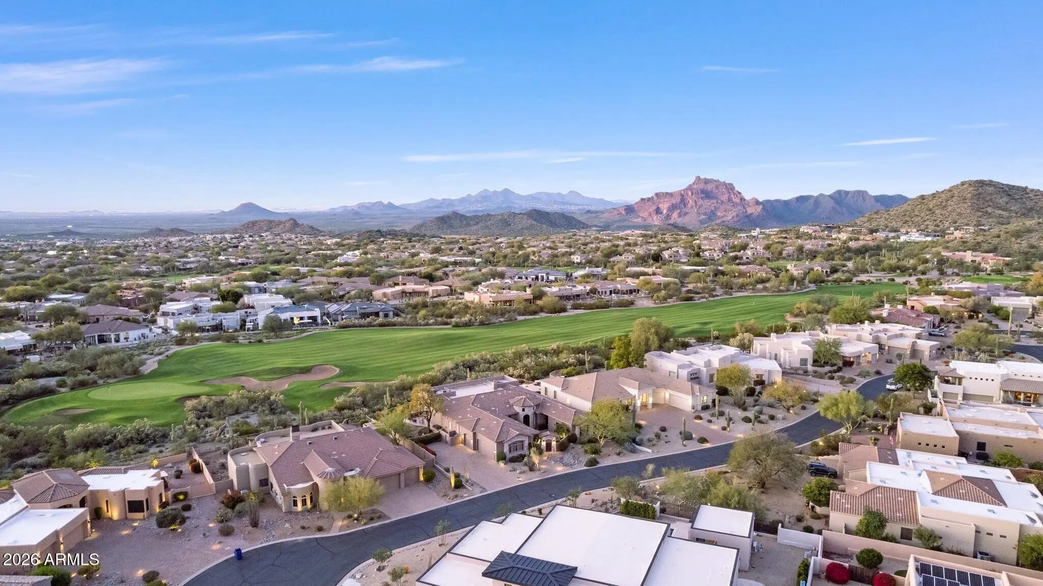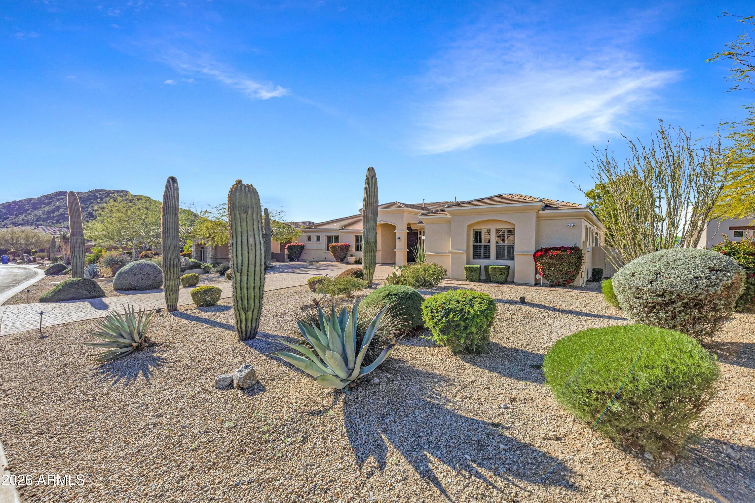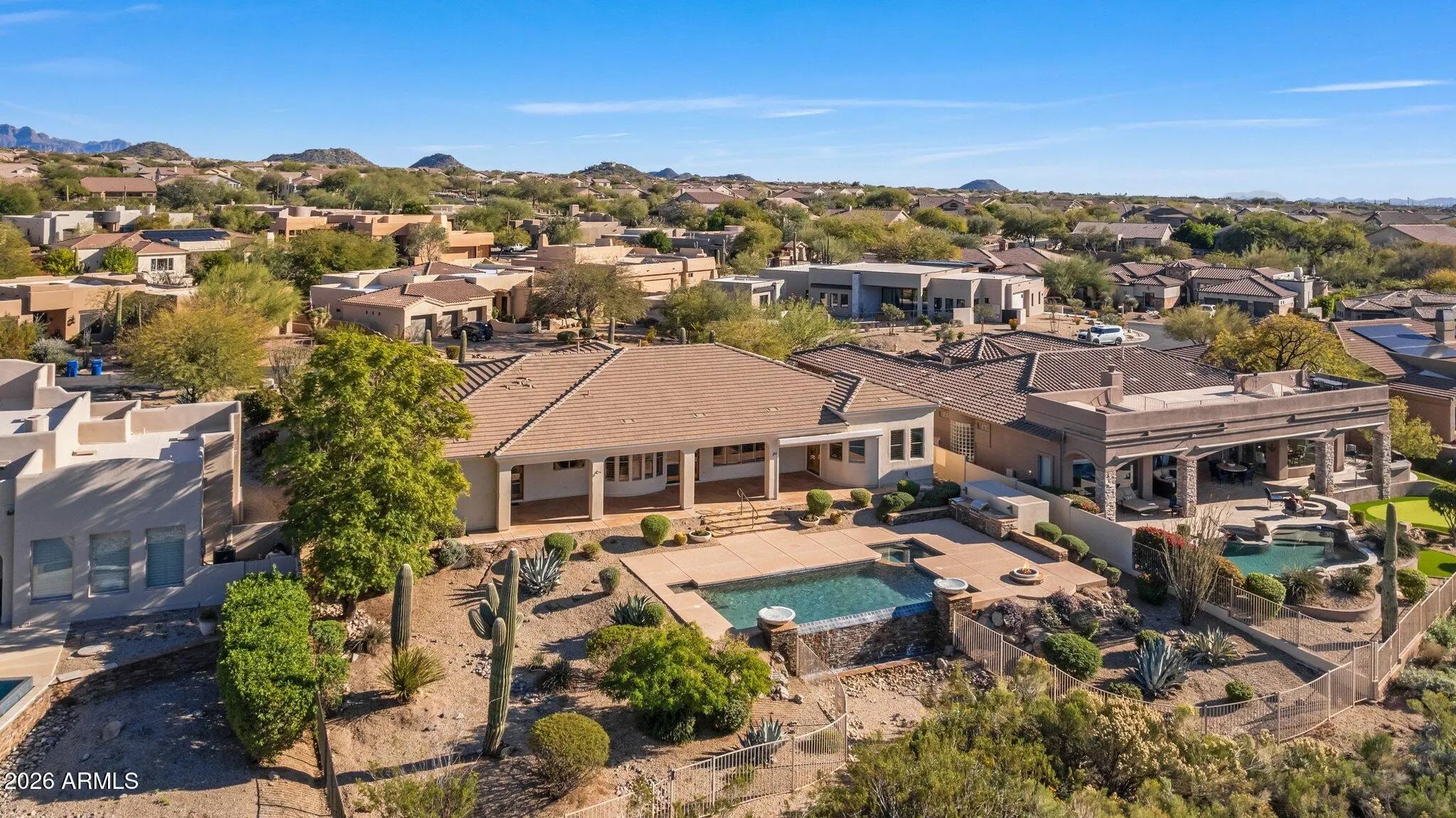 UNOBSTRUCTED PANORAMIC GOLF, MOUNTAIN & CITY LIGHT VIEWS! Commanding one of the most coveted and visually striking positions within the gated Preserve at Las Sendas, this custom residence is set on an elevated 19,400-square-foot lot, overlooking the 10th green of the Las Sendas Golf Course and the lush Sonoran Desert. The setting is both dramatic and serene, offering remarkable privacy, elevation, and a quiet sense of desert stillness. From sunrise to sunset, the home captures ever-changing vistas of mountains and shimmering city lights, creating a dynamic backdrop that enhances everyday living while underscoring the home's premier positioning within the community. Designed entirely on one level with no interior steps, the residence delivers an effortless sense of livability, roof underlayment provides peace of mind for years to come. Fresh neutral paint, travertine stone floors flow gracefully from room to room, lending warmth and continuity to the light-filled interiors. Plantation shutters and a palette of soft, neutral finishes provide an elegant backdrop, allowing the home's natural light and sweeping views to take center stage. A formal dining room sets a refined tone for entertaining, while a thoughtfully designed den with custom built-in bookshelves offers versatility as a private office, library, or quiet retreat. At the heart of the home, the gourmet kitchen is designed for both function and entertaining, featuring custom cabinetry, a generous center island, double sinks, appliance garage,and a professional-grade Thermador 48-inch gas range. A nearby wet bar with bar-height seating, ice maker, and beverage refrigerators creates a natural gathering spaceperfect for hosting while enjoying glowing sunsets and sweeping golf course vistas. The split floor plan offers exceptional privacy and flexibility, with two guest bedrooms sharing a bath, along with an additional guest suite featuring its own ensuite bathideal for visitors or multigenerational living. The primary owner's suite is a secluded retreat, offering space for a sitting area and captivating mountain views. The spa-inspired primary bath features a jetted soaking tub, walk-in shower, dual vanities, and a spacious walk-in closet. Outdoor living is a true showpiece, thoughtfully designed to take full advantage of the home's elevated setting. The resort-style backyard features a negative-edge pool, spa, fire pit, and built-in barbecue. An oversized covered patio with automated security shades provides year-round comfort, creating an ideal environment for both intimate evenings and lively gatherings. Completing the property is an oversized 3.5-car garage with extensive built-in cabinetry, offering exceptional storage and flexibility, including space for a golf cart or recreational toys. Las Sendas is celebrated for its active outdoor lifestyle, offering golf, pickleball and tennis courts, a private clubhouse, fitness center, multiple community pools, and miles of scenic trails and parks woven throughout the community. The Las Sendas Golf Course is recognized as one of the East Valley's premier desert courses, known for dramatic elevation changes, pristine fairways, and unforgettable Red Mountain views. Golf memberships are available. Las Sendas of Northeast Mesa is adjacent to the Tonto National Forest, featuring dramatic vistas and recreational activities like mountain and road biking, hiking, paddling/kayaking, boating, birding and more... yet it is an easy drive to downtown Scottsdale, Phoenix or Sky Harbor Airport.