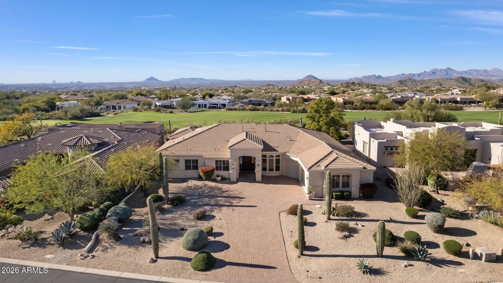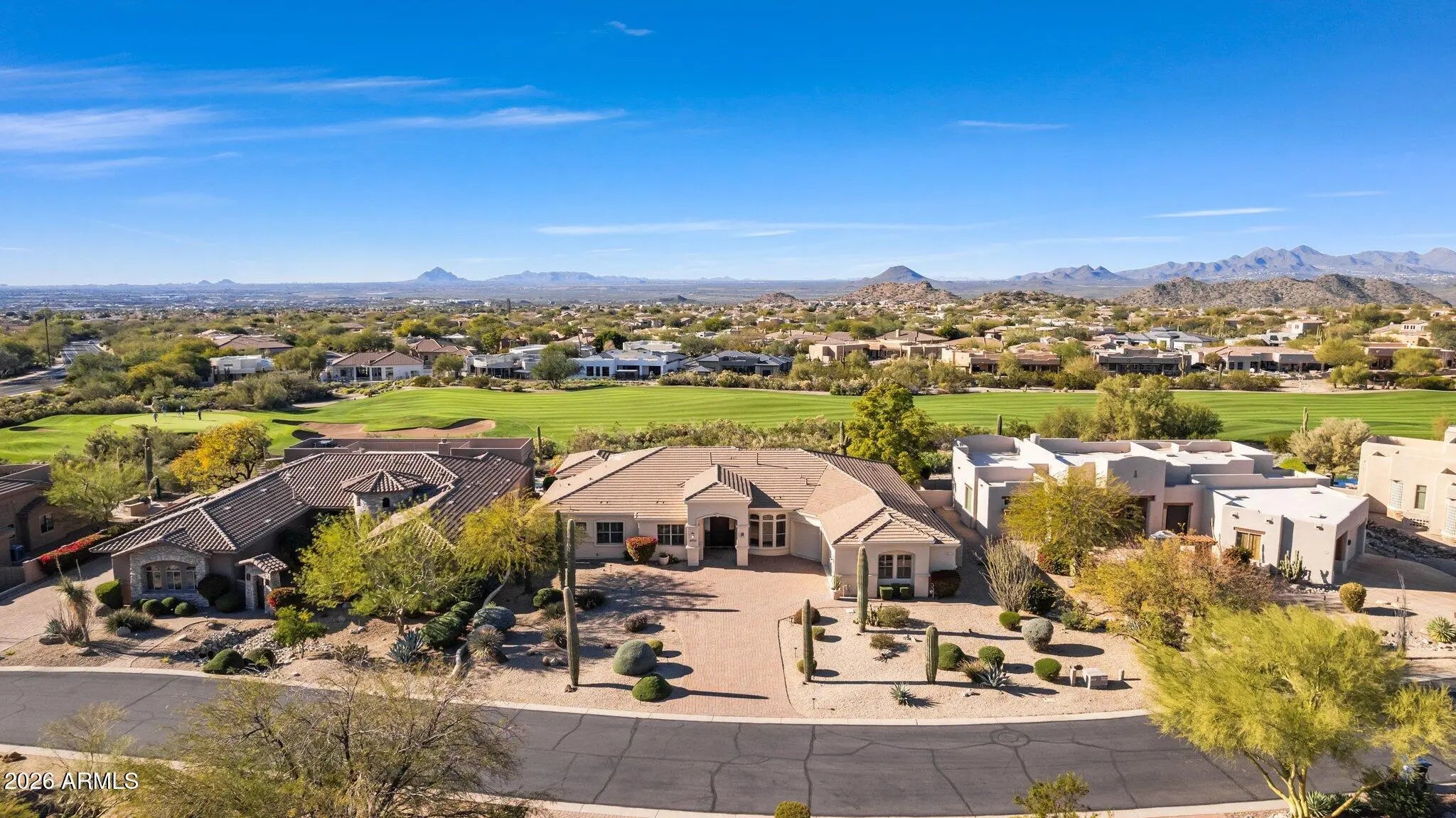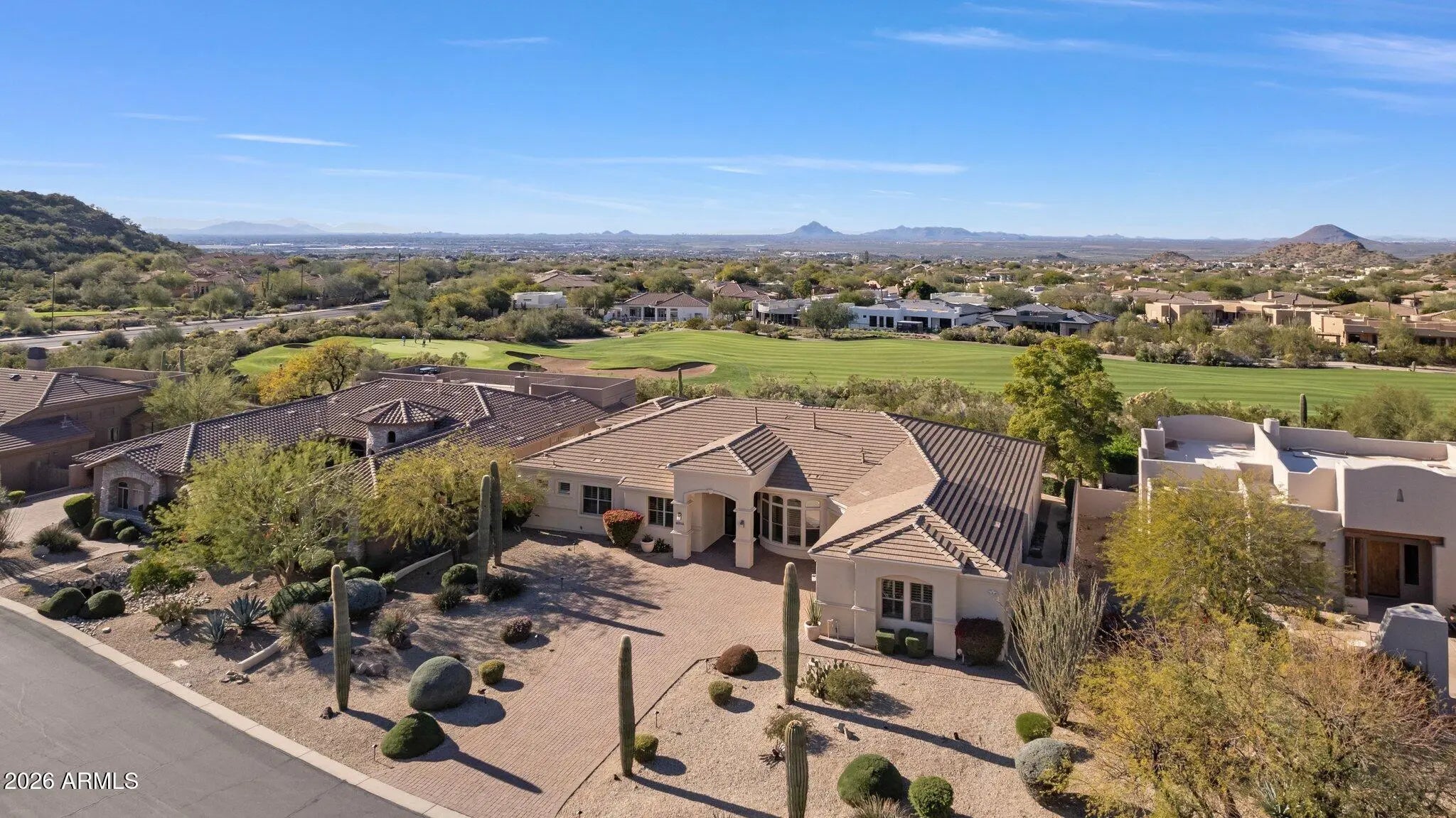 UNOBSTRUCTED PANORAMIC GOLF, MOUNTAIN & CITY LIGHT VIEWS! Commanding one of the most coveted and visually striking positions within the gated Preserve at Las Sendas, this custom residence is set on an elevated 19,400-square-foot lot, overlooking the 10th green of the Las Sendas Golf Course and the lush Sonoran Desert. The setting is both dramatic and serene, offering remarkable privacy, elevation, and a quiet sense of desert stillness. From sunrise to sunset, the home captures ever-changing vistas of mountains and shimmering city lights, creating a dynamic backdrop that enhances everyday living while underscoring the home's premier positioning within the community. Designed entirely on one level with no interior steps, the residence delivers an effortless sense of livability, roof underlayment provides peace of mind for years to come. Fresh neutral paint, travertine stone floors flow gracefully from room to room, lending warmth and continuity to the light-filled interiors. Plantation shutters and a palette of soft, neutral finishes provide an elegant backdrop, allowing the home's natural light and sweeping views to take center stage. A formal dining room sets a refined tone for entertaining, while a thoughtfully designed den with custom built-in bookshelves offers versatility as a private office, library, or quiet retreat. At the heart of the home, the gourmet kitchen is designed for both function and entertaining, featuring custom cabinetry, a generous center island, double sinks, appliance garage,and a professional-grade Thermador 48-inch gas range. A nearby wet bar with bar-height seating, ice maker, and beverage refrigerators creates a natural gathering spaceperfect for hosting while enjoying glowing sunsets and sweeping golf course vistas. The split floor plan offers exceptional privacy and flexibility, with two guest bedrooms sharing a bath, along with an additional guest suite featuring its own ensuite bathideal for visitors or multigenerational living. The primary owner's suite is a secluded retreat, offering space for a sitting area and captivating mountain views. The spa-inspired primary bath features a jetted soaking tub, walk-in shower, dual vanities, and a spacious walk-in closet. Outdoor living is a true showpiece, thoughtfully designed to take full advantage of the home's elevated setting. The resort-style backyard features a negative-edge pool, spa, fire pit, and built-in barbecue. An oversized covered patio with automated security shades provides year-round comfort, creating an ideal environment for both intimate evenings and lively gatherings. Completing the property is an oversized 3.5-car garage with extensive built-in cabinetry, offering exceptional storage and flexibility, including space for a golf cart or recreational toys. Las Sendas is celebrated for its active outdoor lifestyle, offering golf, pickleball and tennis courts, a private clubhouse, fitness center, multiple community pools, and miles of scenic trails and parks woven throughout the community. The Las Sendas Golf Course is recognized as one of the East Valley's premier desert courses, known for dramatic elevation changes, pristine fairways, and unforgettable Red Mountain views. Golf memberships are available. Las Sendas of Northeast Mesa is adjacent to the Tonto National Forest, featuring dramatic vistas and recreational activities like mountain and road biking, hiking, paddling/kayaking, boating, birding and more... yet it is an easy drive to downtown Scottsdale, Phoenix or Sky Harbor Airport.