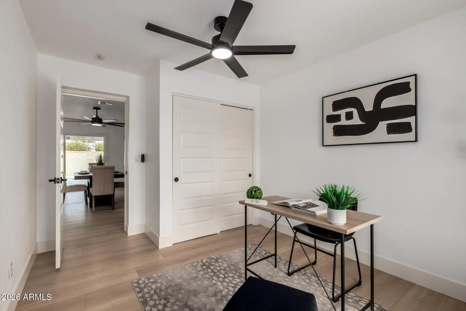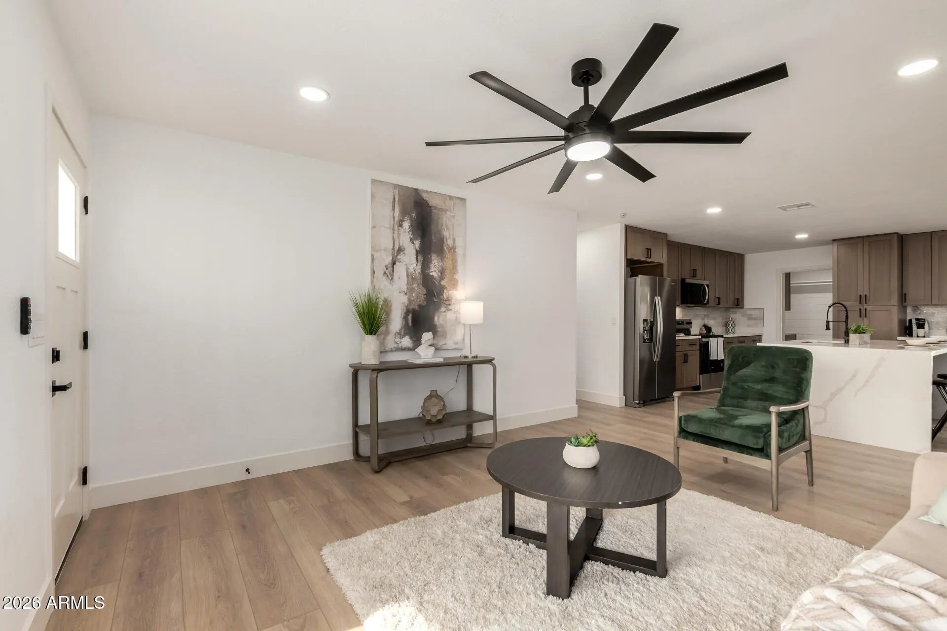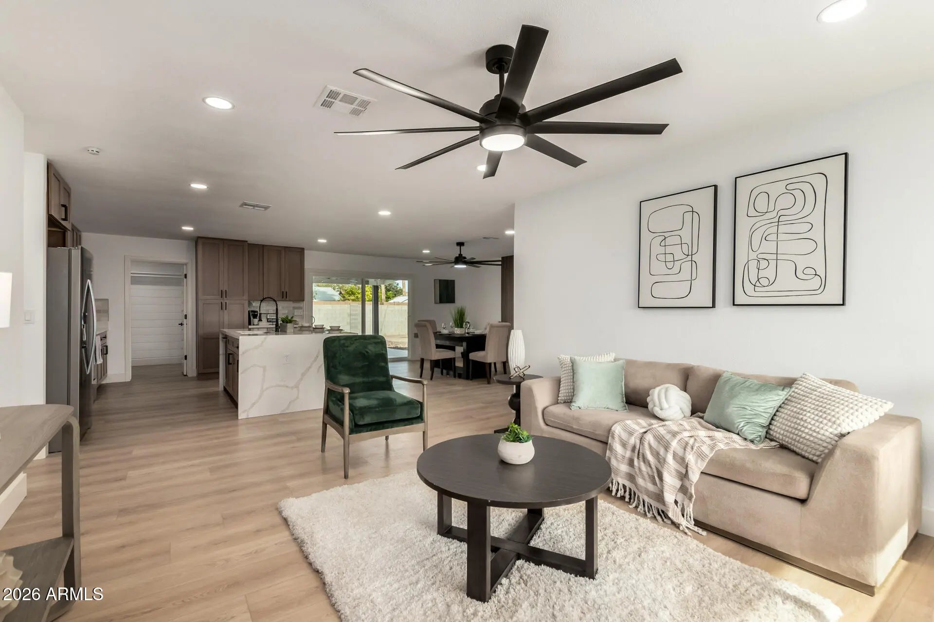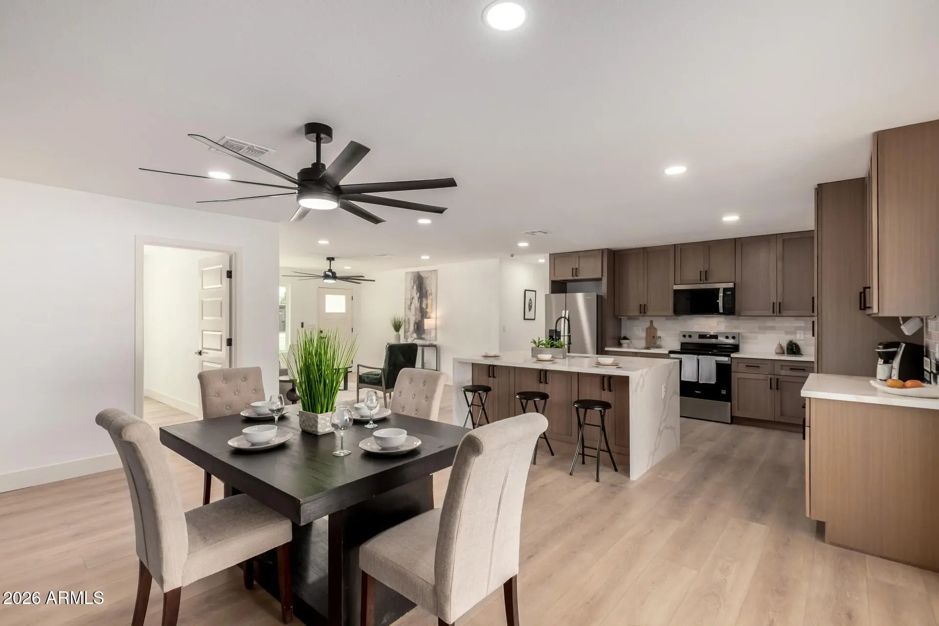 Tastefully upgraded home is on the market & ready to move in! Discover a spacious, low-maintenance front yard with ample parking. Inside, a bright & open floor plan welcomes you with fresh neutral paint, contemporary ceiling fans, recessed lighting, and wood-look flooring throughout. The fabulous kitchen showcases elegant shaker cabinets, tile backsplash, quartz counters, SS appliances, and an island with waterfall edge. The dining area has a charming wall-mounted fireplace & direct access to the backyard, creating a seamless flow for indoor-outdoor entertaining. The primary retreat offers a beautifully designed bathroom with a modern, high-end aesthetic. Additional highlights include abundant natural light & a versatile den. The backyard is a desert oasis, complete with a covered patio & a refreshing pool. Ideally located & thoughtfully upgraded, this home delivers timeless charm with modern functionality. An opportunity not to be missed!