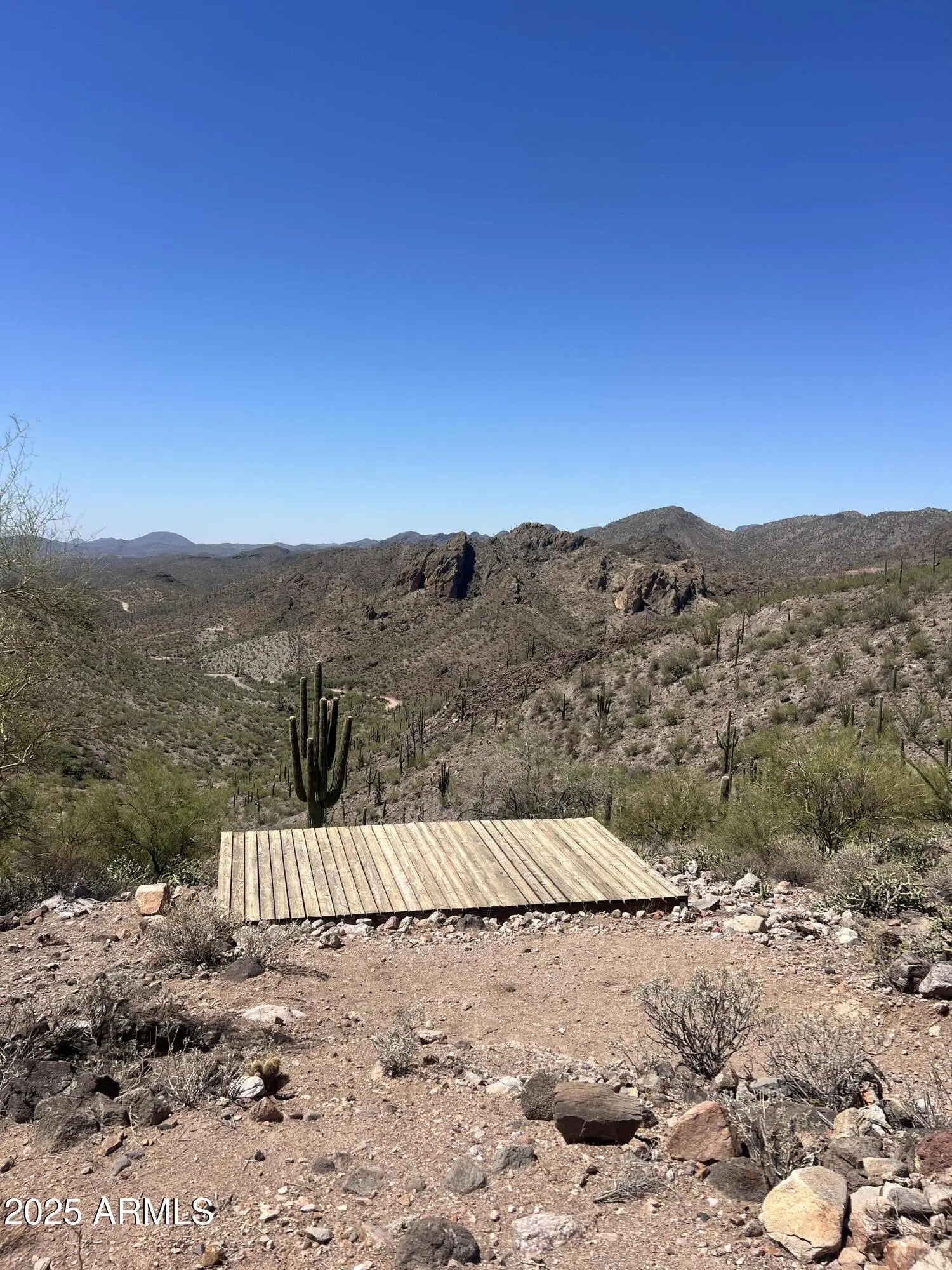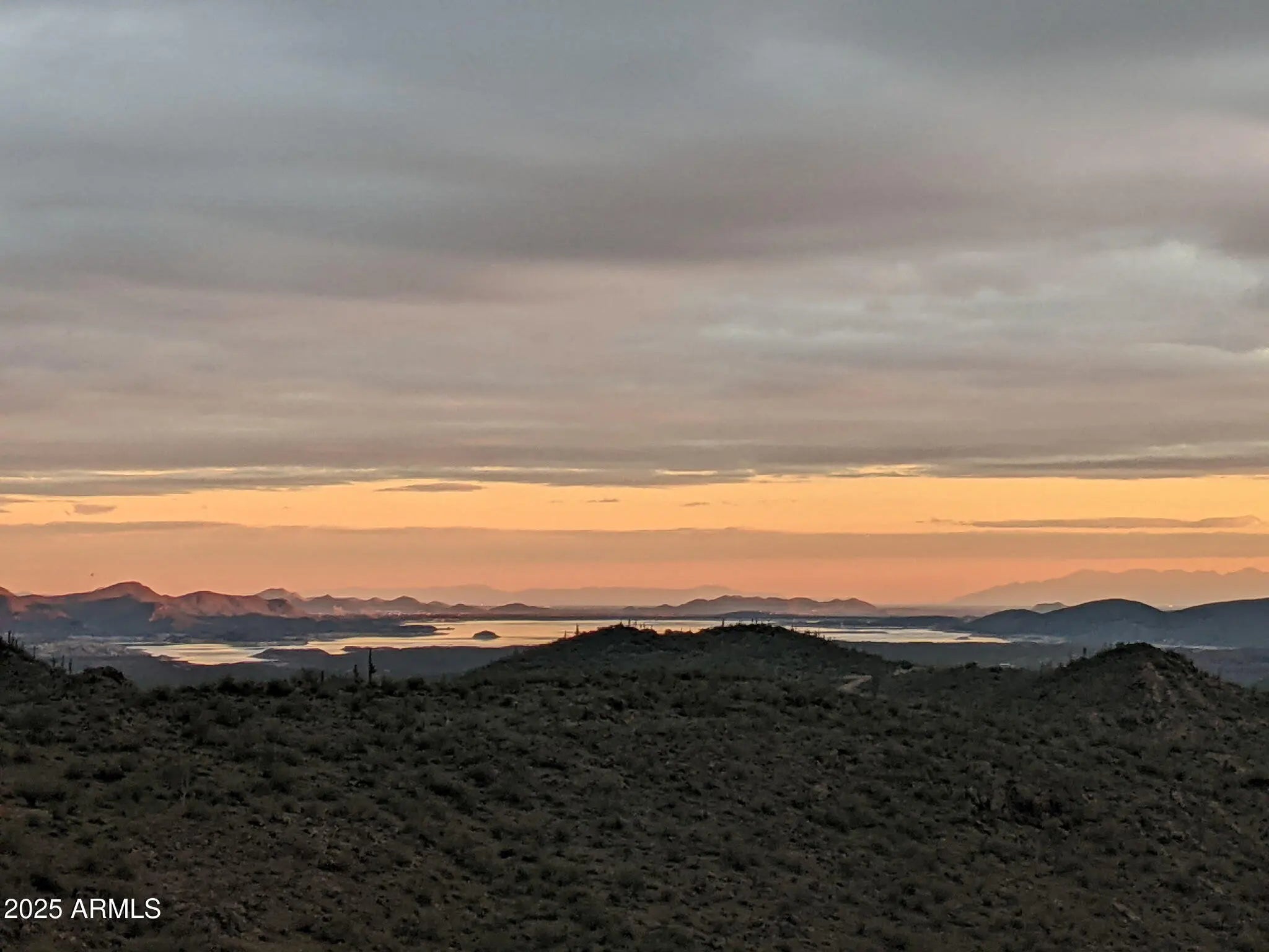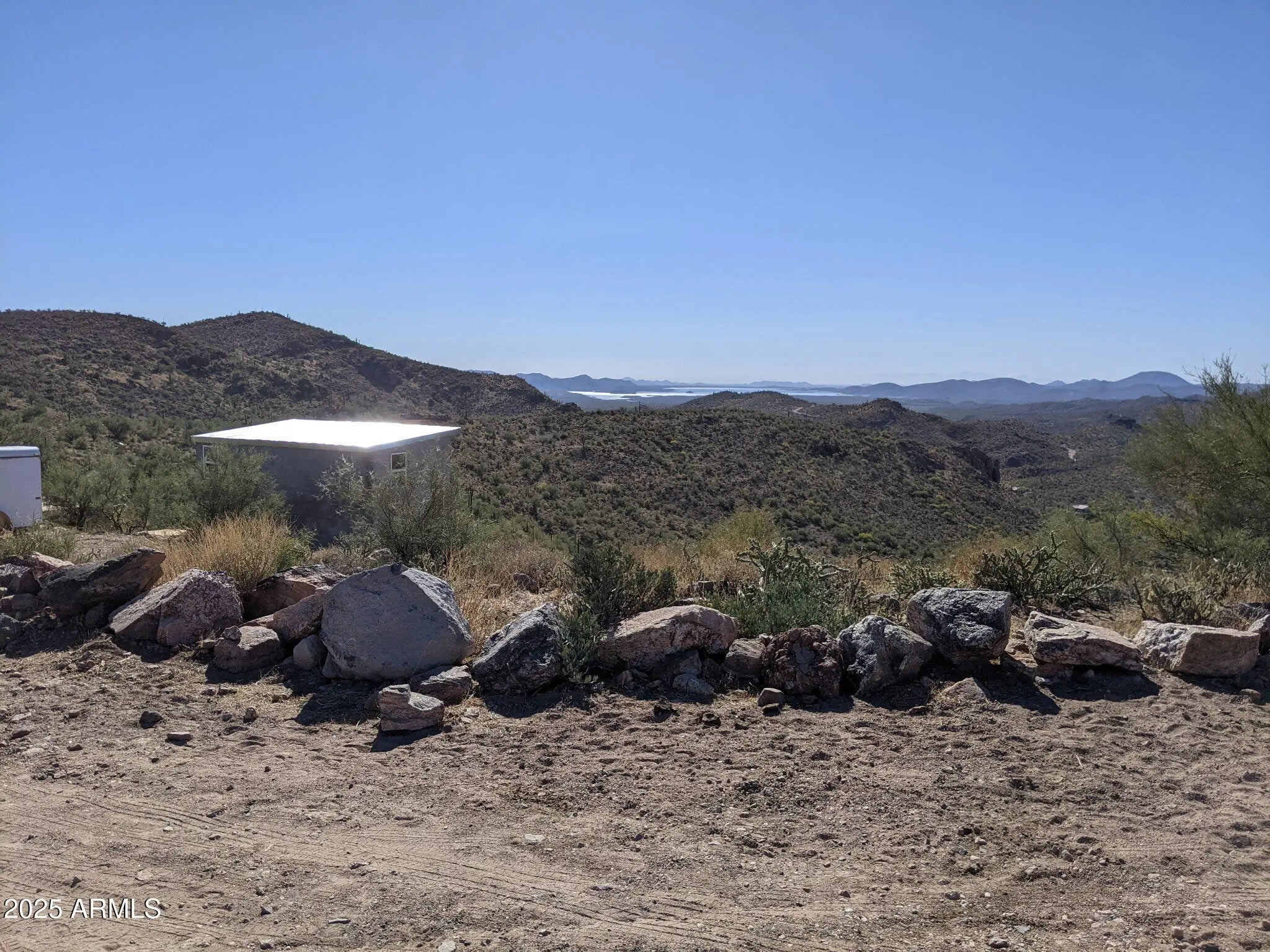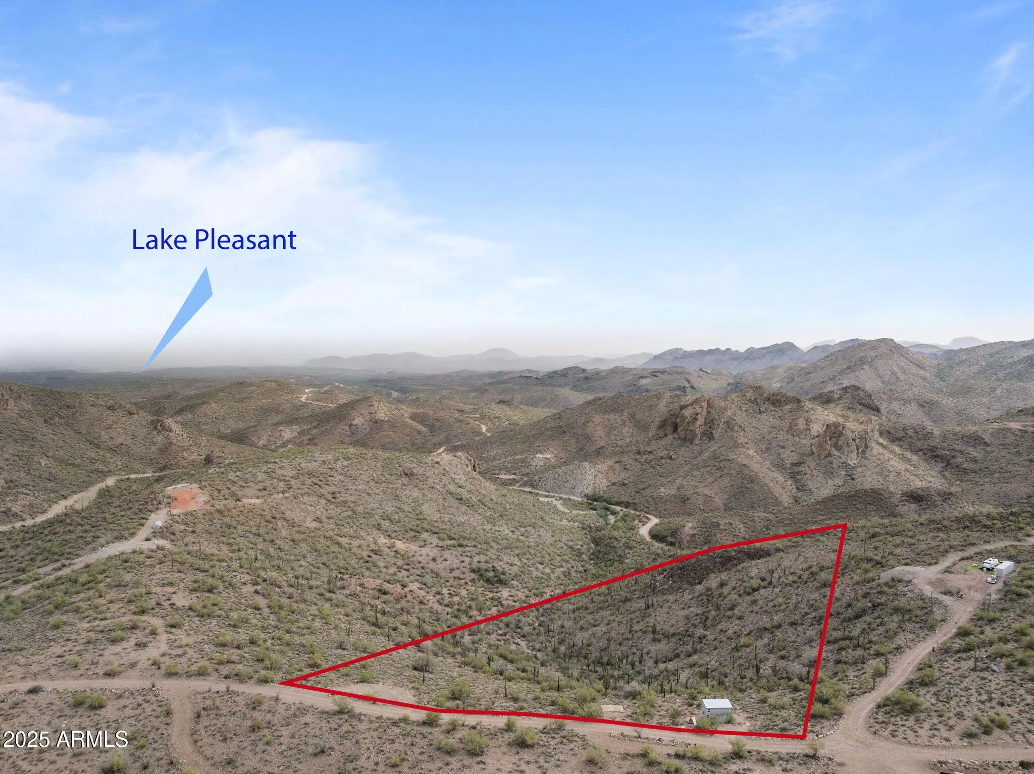 Breathtaking 10-acre parcel with panoramic views of Lake Pleasant, Crown King, 4 Peaks, Cow Creek Dam, and the Phoenix Valley. Perched at 2,700' elevation, this off-grid retreat offers privacy, tranquility, and stunning desert scenery just over 4 miles from Peoria city limits. Usable terrain includes a large, level dirt pad with two entrances, perfect for RVs or trailers, plus a campsite with a 10' x 20' deck. enclosed shed with windows captures cool breezes and lake views. Ideal for weekend escapes or building your dream getaway. Accessible by 4WD. No utilities—perfect for solar/off-grid living.