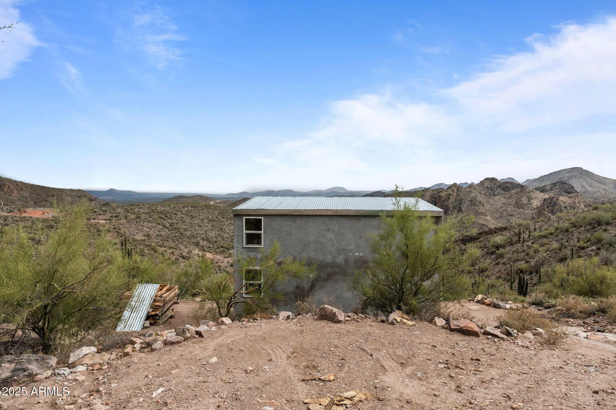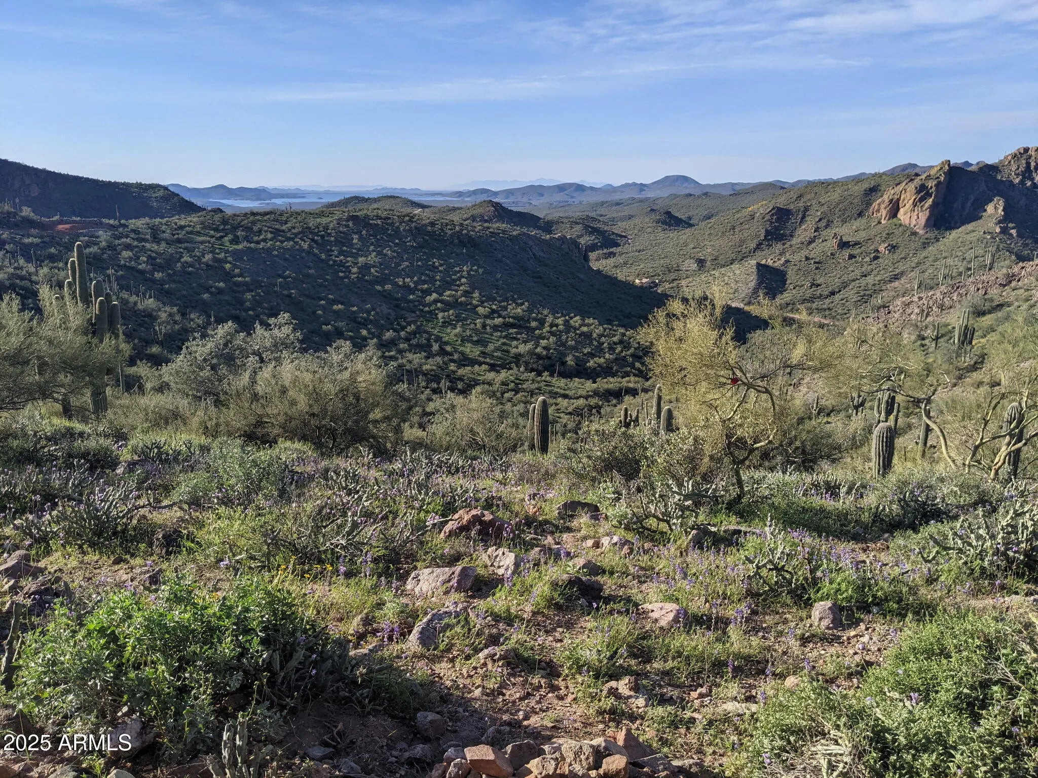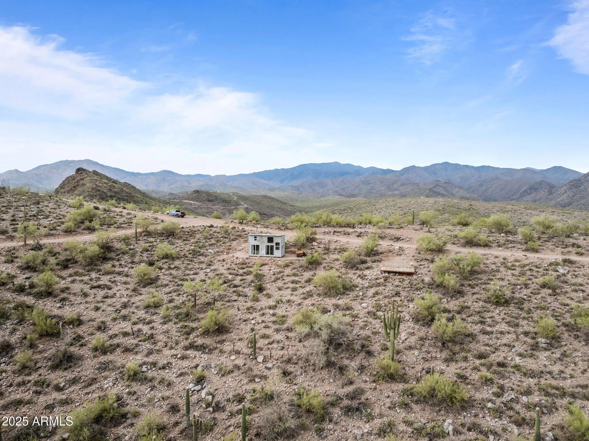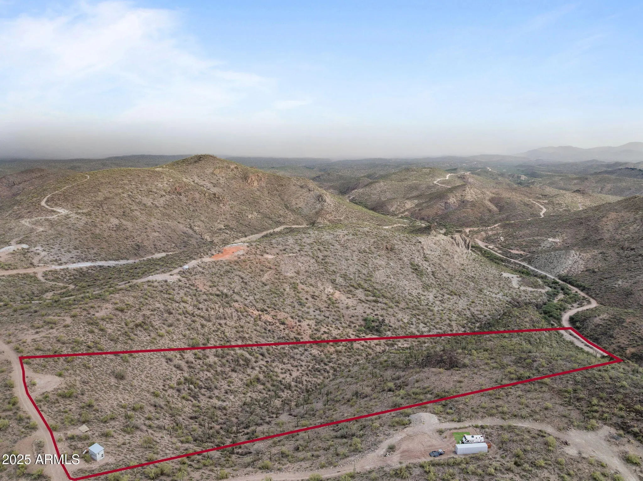 Breathtaking 10-acre parcel with panoramic views of Lake Pleasant, Crown King, 4 Peaks, Cow Creek Dam, and the Phoenix Valley. Perched at 2,700' elevation, this off-grid retreat offers privacy, tranquility, and stunning desert scenery just over 4 miles from Peoria city limits. Usable terrain includes a large, level dirt pad with two entrances, perfect for RVs or trailers, plus a campsite with a 10' x 20' deck. enclosed shed with windows captures cool breezes and lake views. Ideal for weekend escapes or building your dream getaway. Accessible by 4WD. No utilities—perfect for solar/off-grid living.