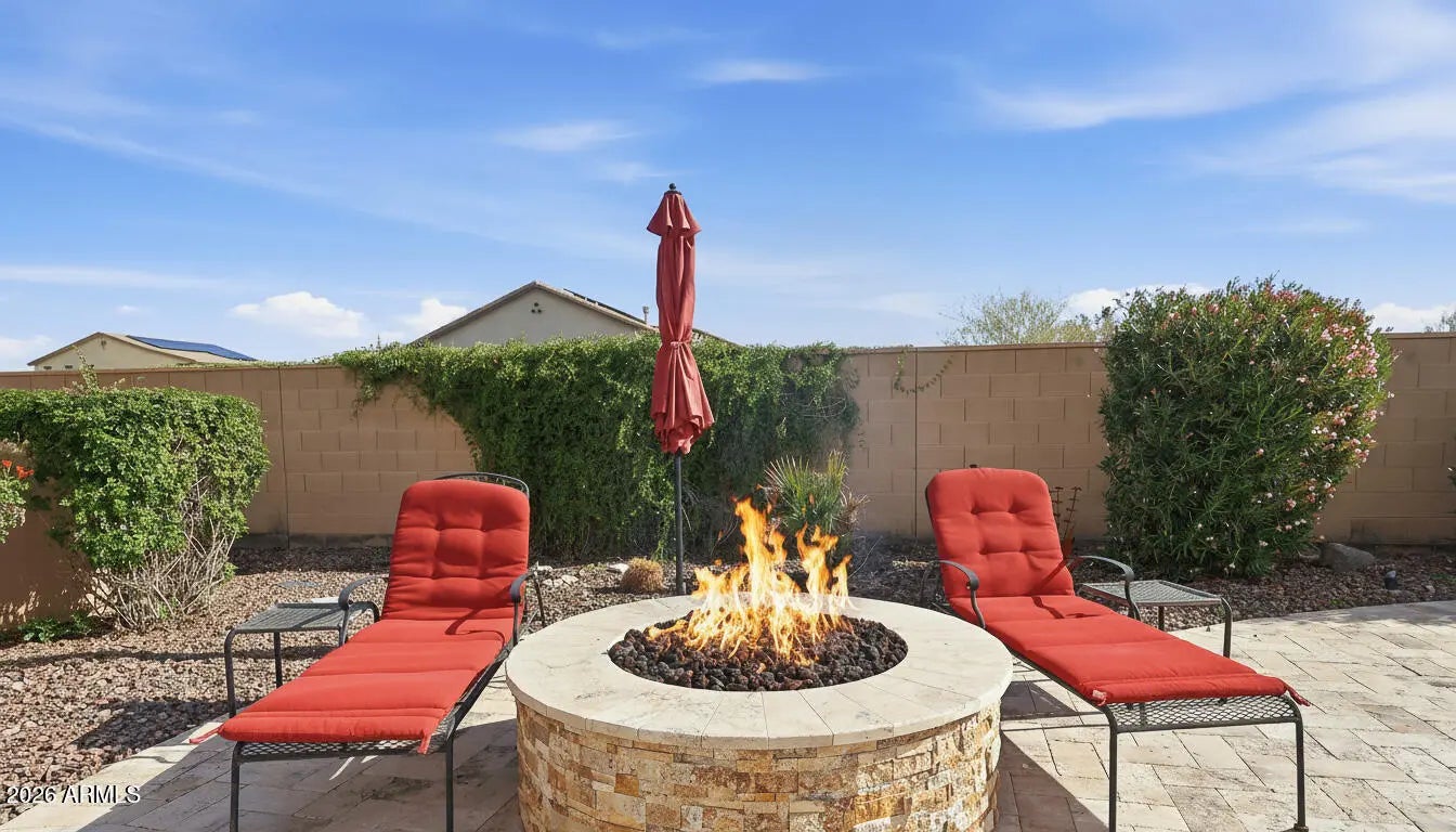 Welcome to this beautifully designed 3-bedroom, 2.5-bath home with a den, where curb appeal sets the tone from the start. A paver driveway leads you to a charming enclosed front patio and covered front porch, creating an inviting first impression. Inside, the open-concept layout is ideal for both entertaining and everyday living. The great room showcases a custom built-in entertainment wall with accent lighting and large windows that flood the space with natural light. The kitchen is equally impressive, featuring staggered cabinetry, stainless steel appliances, induction cooktop, travertine backsplash, granite countertops, and huge walk-in pantry. Enjoy energy savings throughout the year with the prepaid solar! Solar saves approximately $900 per year! Average electric bills are only $151/month for full time living! Solar System is warranted, maintained, and insured at NO cost to the buyer. Unwind in the oversized private primary suite, complete with a fully tiled shower, soaking tub, dual vanities, and two walk-in closets. Step outside to a true resort-style backyard offering a large covered patio, extended travertine paver patio, built-in BBQ, heated sparkling pool and spa, and a putting green. Situated on a corner lot, this home provides exceptional privacy and an ideal setting for Arizona living. Just minutes from the Presidio Residents Center, residents can take advantage of a heated pool, fitness facility, and the popular Cantina restaurant. The Estrella community elevates everyday living with picturesque lakes, miles of hiking and biking trails, expansive parks, two resident centers, multiple pools, a splash pad, and a water park - offering something for every lifestyle.