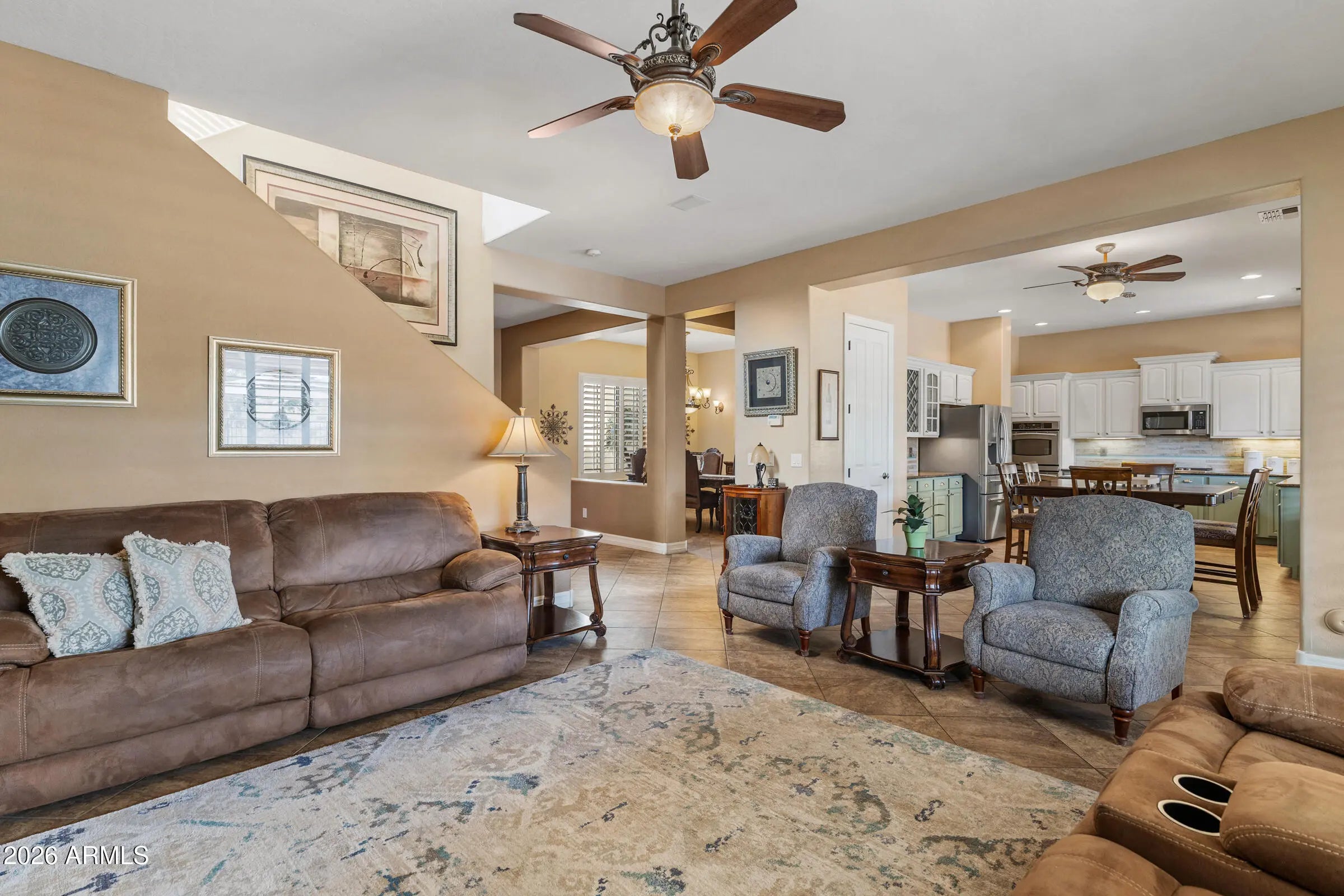 Welcome to the premier home in Gilbert located in the highly sought after Estates at the Spectrum, perfectly positioned on a massive corner lot. This impressive residence offers five bedrooms plus a separate entry attached casita, three bathrooms, and a full bedroom and bathroom conveniently located downstairs. The kitchen truly is the heart of the home, featuring a beautifully remodeled space with custom painted cabinetry, granite countertops, and stainless steel appliances, all opening seamlessly to the living room where a built in entertainment center and cozy fireplace create the perfect gathering space. The expansive primary suite is a true retreat, complete with two walk in closets, dual vanity sinks, a walk in shower, and a relaxing soaking tub. A split floor plan provides three additional bedrooms upstairs with a shared bathroom, offering both space and privacy. Step outside to a resort style backyard oasis showcasing a heated Pebble Tec pool and spa, a full outdoor kitchen, gas fire pit, artificial turf putting green, and even an RV gate with concrete slab. Completing the home is a three car garage with epoxy floors and floor to ceiling storage cabinets. This exceptional property truly has it all.