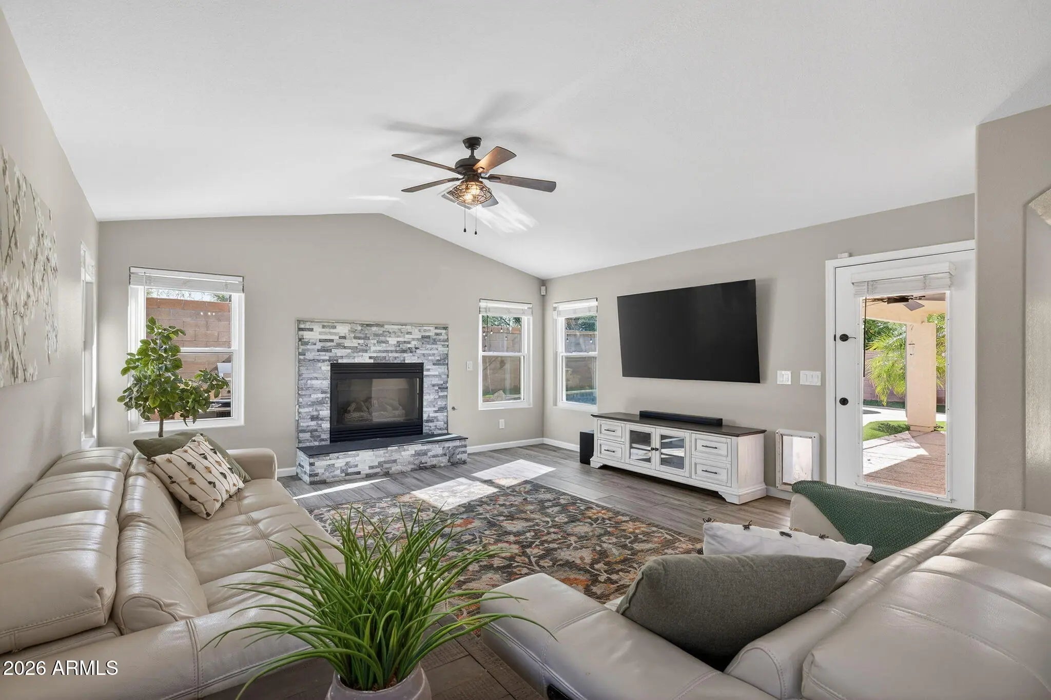 Welcome home to this beautifully updated single story stunner tucked inside the Mesquite Canyon community. From the moment you step inside, vaulted ceilings and brand new wood plank tile flooring set the tone for a bright, open feel. Fresh paint throughout the entire home gives everything a crisp, move-in-ready finish, while picture windows in the formal dining room perfectly frame views of the sparkling pool and flood the space with natural light. The kitchen is both stylish and functional with white cabinetry paired with dark countertops, a tiled backsplash, single apron sink, stainless steel appliances including a brand new dishwasher, reverse osmosis system, and a massive walk-in pantry. It opens seamlessly to the living room, where a gas fireplace with a stone accent surround creates a warm and inviting space to gather. The primary suite is spacious and private, featuring direct access to the backyard. Through the statement barn door, the upgraded ensuite bathroom offers dual vanities with an additional vanity space in between, sleek black sinks and faucets, and a beautifully tiled walk-in shower complete with a rain shower head, tile inlay accent, and built-in soap nook. Additional upgrades include all new windows, added insulation, upgraded blinds and shades throughout, extra upper cabinetry in the laundry room, and a new gas water heater. Out back, enjoy true Arizona living with a massive covered patio featuring ceiling fans, a sparkling pool with a rock waterfall feature, built-in BBQ, and low-maintenance turf. Whether entertaining or unwinding, this backyard delivers. Thoughtfully updated, beautifully finished, and designed for everyday living, this Mesquite Canyon home is one you won't want to miss.