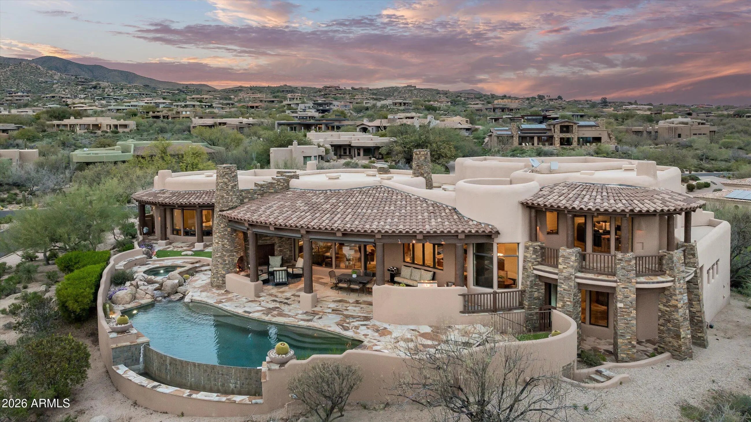 GOLF MEMBERSHIP NOW AVAILABLE! Desert Mountain Southwest estate home offers Arizona's splendor every day of the year! Enjoy spectacular Valley skies, sunsets and city lights from the elevated vistas of Apache Peak Village. Exceptional sense of arrival from circular autocourt, gated courtyard and hearth to custom entry door and stunning views beyond. Artisan quality workmanship and finishes throughout, including beautiful hardwoods, hand forged hardware, stone work and ceiling details. Ideal family and entertaining amenities with home theater, TV/media room, Wolf chef's kitchen, and expansive resort patio. Executive office and private primary retreat underscore the luxury experience. Membership info and Floor Plan under ''Documents'' tab. . Recoated Roof , new paint, new control 4 and home tech equipment, new theater equipment including cinematic screen, projector and sound. 5 flat new screen tv's. New Lutron lighting central processing unit. 34 new Pella windows, new a/c unit, Remodeled loft converted to office/tv room with new wood floors, wood floors in master bedroom, major landscape renovations. 2 new pool pumps, screen shades.