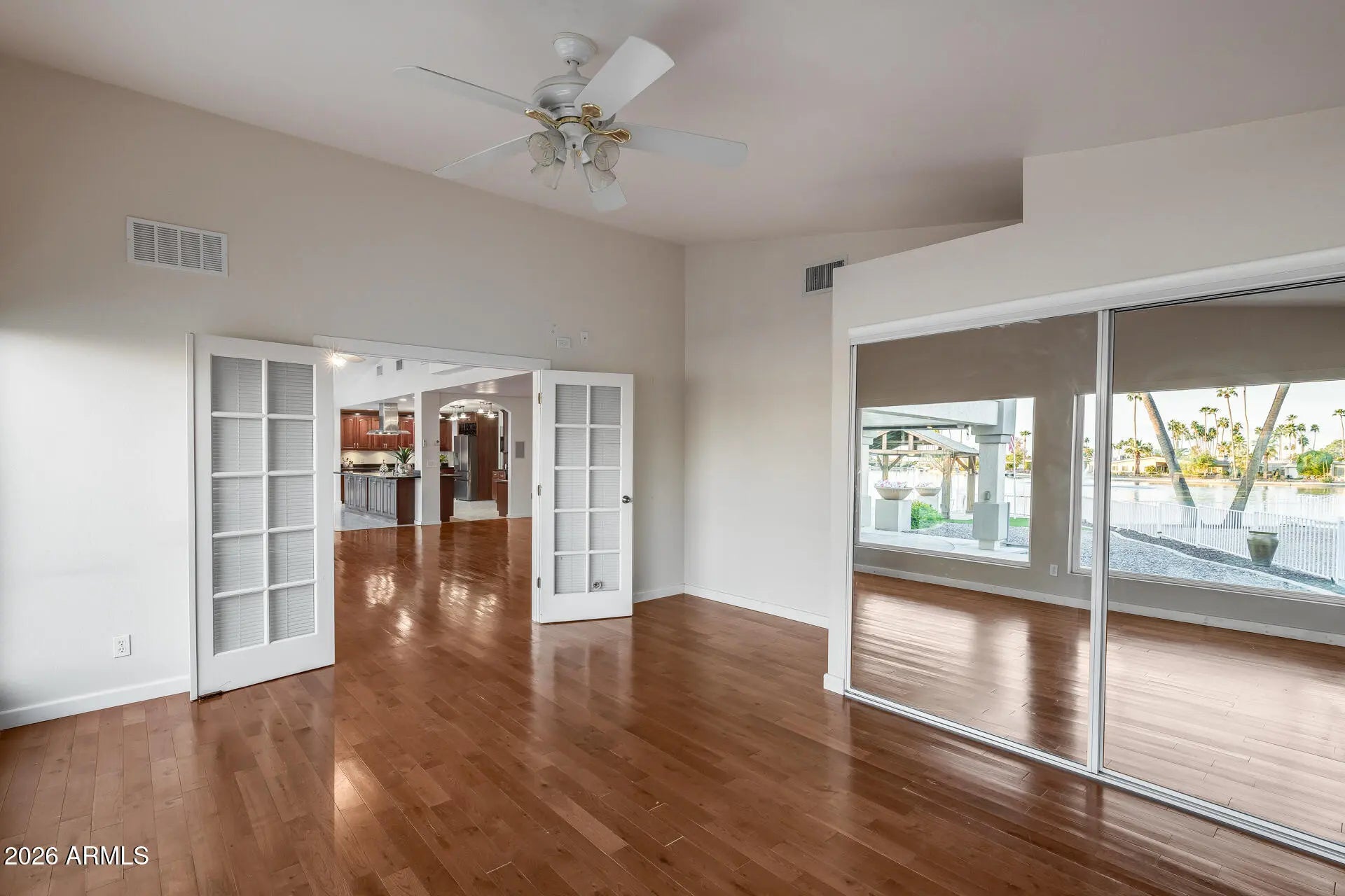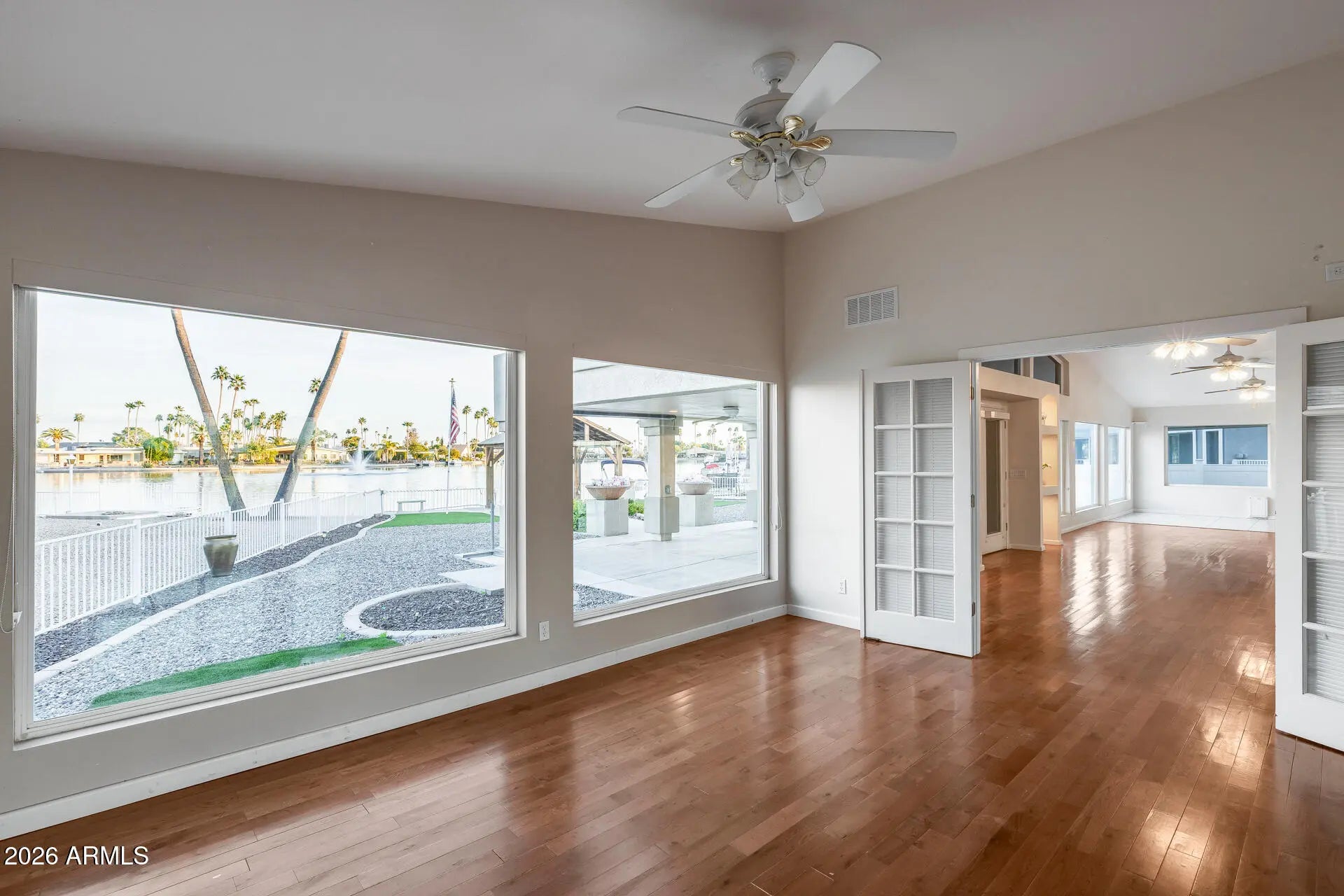 This beautifully maintained corner lot + lake front 3,373 sq/ft 3 bed / 2.5 bath home with a separate den offers refined living on a sprawling 14,793 sq/ft lot. Inside, soaring ceilings, sleek wood-look flooring, and expansive glass windows create an airy, light-filled ambiance. The spacious kitchen features abundant cabinetry and flows effortlessly into the main living areas, plus, there are TWO master suites! The beautiful backyard is low-maintenance with artificial turf and has a walkway to your own private dock (direct water access). Additionally, this home also has a 2.5 car garage. Nestled in a highly sought-after lake community, residents enjoy resort-style amenities including a clubhouse, pool, spa, fitness center, and more!