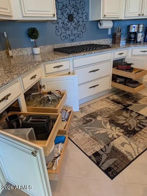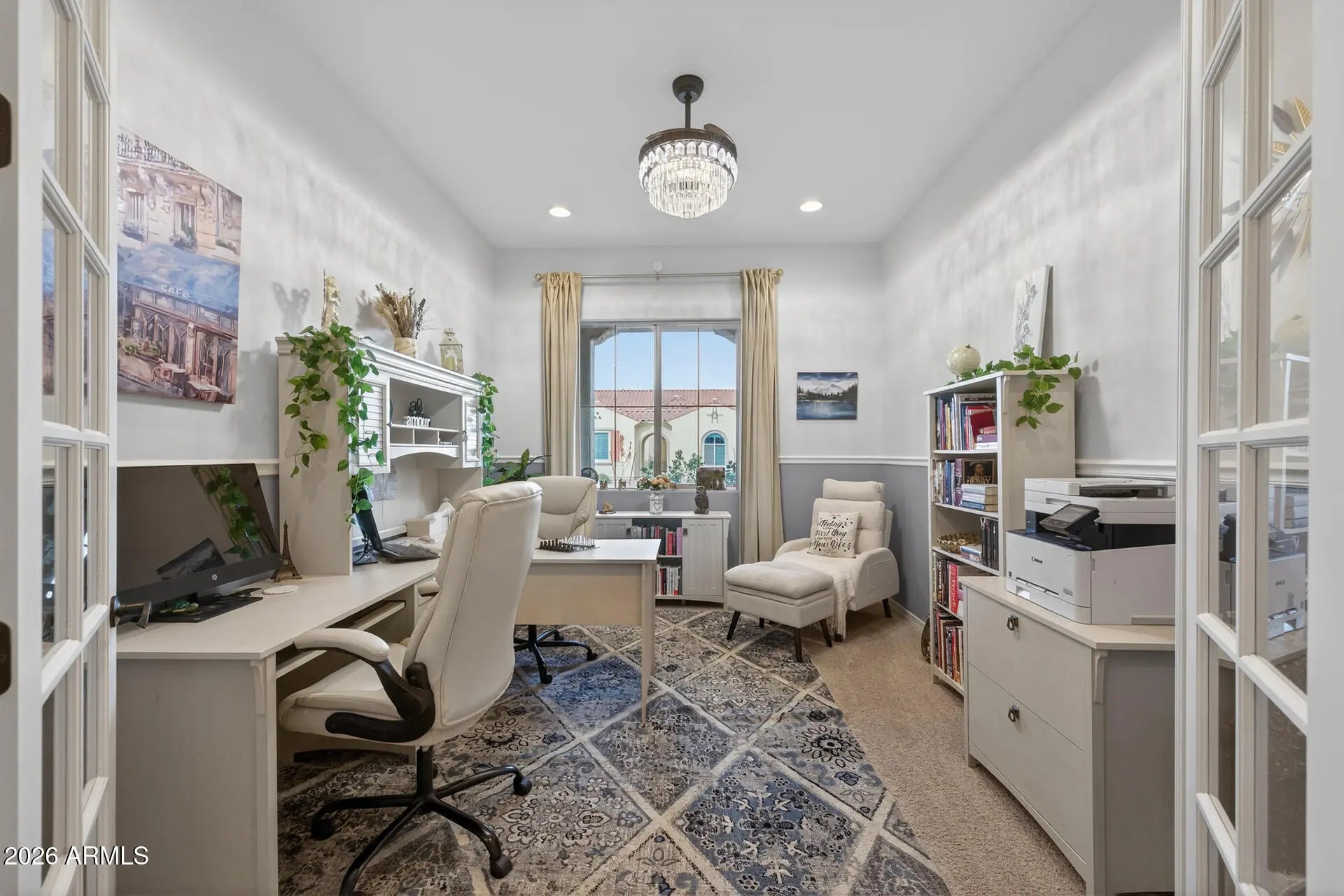Situated on a premium oversized corner lot in the sought‑after Active Adult resort community of Sun City Anthem Merrill Ranch, this beautiful, almost‑new home offers an ideal blend of comfort, style, and low‑maintenance living, featuring 2 bedrooms, a den with elegant French doors, and 2 baths across 2,156 SqFt, with a spacious great room showcasing custom built‑in cabinetry and serene views of graceful palm trees enjoyed from both the primary bedroom and inviting back porch. The gourmet kitchen includes upgraded display cabinetry, granite countertops, stainless appliances, a built‑in desk, and an island with breakfast bar and pendant lighting, while sliding glass doors open to a covered patio and park‑like backyard with no rear neighbors, easy‑car artificial turf, and desert landscaping ideal for quiet mornings or evening gatherings. The primary suite offers a peaceful retreat with a tiled shower and walk-in closet with built-ins, and the guest room features a custom wall of cabinetry and Murphy bed. Additional highlights include owned solar panels that provide long-term energy savings-allowing you to sit back and enjoy retirement without worrying about rising electric bills-along with designer lighting and wall treatments, a spacious laundry room with cabinetry and folding counter, a soft water system, and a 2-car garage. Residents enjoy world-class amenities including indoor and outdoor pools and spas, a 48,000 sq. ft. clubhouse, fitness and group exercise studios, creative and social spaces, pickleball, bocce, and shuffleboard courts, a putting green, and access to nearby golf courses for an active, resort style lifestyle every day.