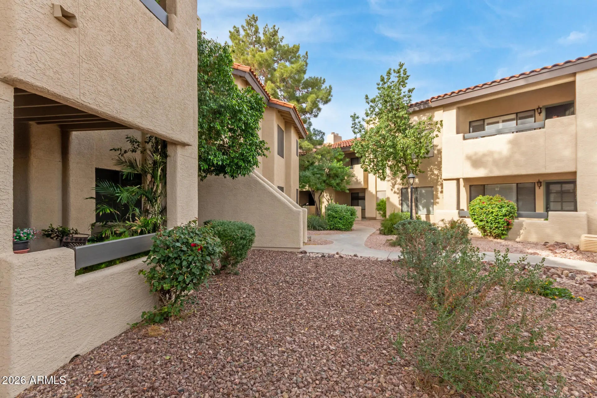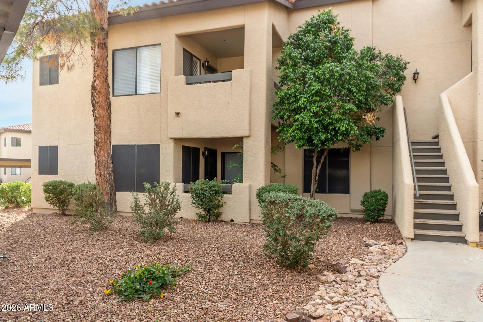 Rare find - 1st floor condo steps from 1 (of 2) resort-style pools! These rarely go up for sale in the gated, naturally landscaped Barcelona community due to it's view & location in community. Barcelona is unique because it's in the Heart of Scottsdale, but has a Paradise Valley mailing address so you can say you live in exclusive Paradise Valley next to the millionaires! Freshly painted throughout, new carpet in bedrooms, just bring your hammer and make it your own! This 2-bedroom, 2-bath home features an open floor plan, bamboo flooring in living areas, new stainless steel appliances in kitchen, newly remodeled walk-in shower in primary bedroom w/large walk in closet, & natural cabinetry in kitchen & bathrooms, while a covered private balcony and storage area complete the space. Enjoy two heated community pools, a spa, shaded ramadas, and gas BBQs, all within walking distance to shops, restaurants, and minutes from Fashion Square in Old Town, the new and improved Paradise Valley Mall, public golf courses, and top-rated Scottsdale schools. Your Home Sweet Home or Investment Property. Hurry this won't last long!