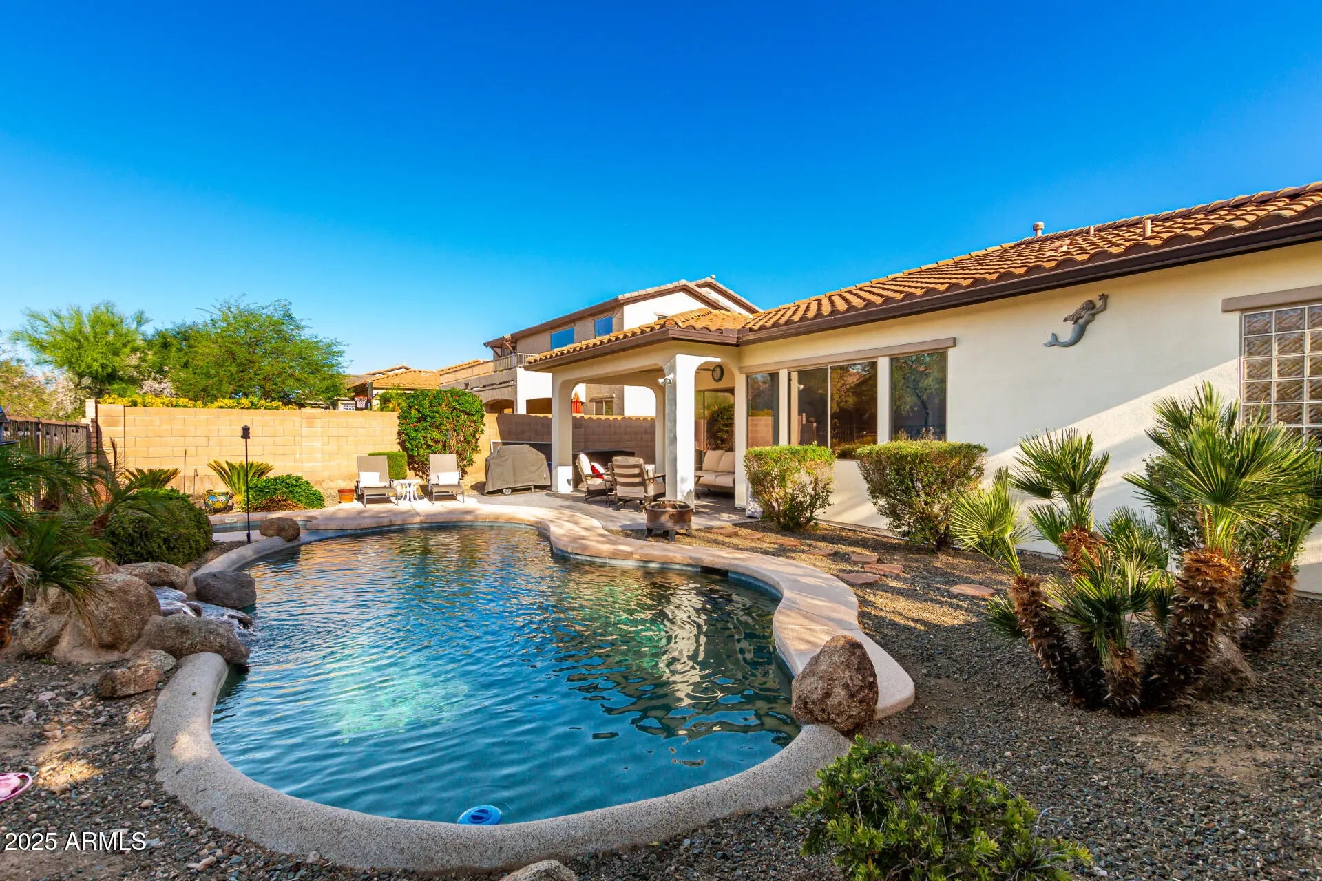 Step into effortless comfort in this spacious 4-bedroom, 2-bath single-level home designed with everyday luxury and easy living in mind. From the moment you enter, soaring ceilings and a neutral color palette set a tone of airy sophistication, while the open floorplan invites connection and flow. Wake up in your expansive primary suite, complete with a private sitting area perfect for morning coffee or quiet reading. Unwind in your spa-inspired bath, featuring a jetted tub, dual vanities, and a generous walk-in closet. Outdoors, your private backyard retreat awaits—complete with a sparkling pool, jetted spa, and tranquil waterfall, all easily managed with an indoor control system. Whether you're hosting summer gatherings or enjoying a peaceful evening under the stars, this space was made for relaxation and connection. With thoughtful updates throughout including a new R/O system, pool pump, and fresh exterior paint this home delivers a lifestyle of low-maintenance luxury and timeless comfort.