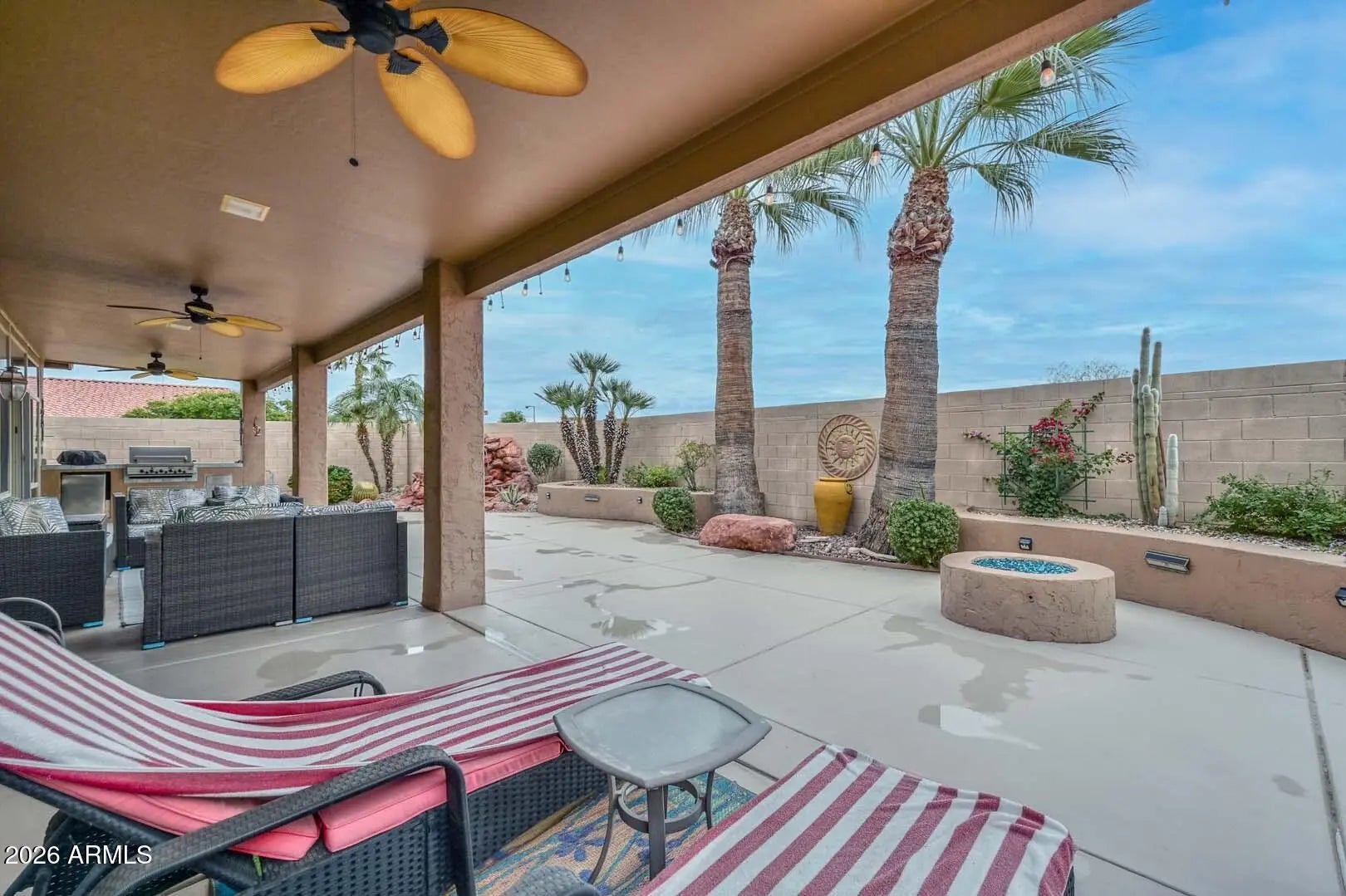 Gorgeous PHOENICIAN model in Arizona Traditions. Boasts 3 bedrooms, 2 baths, formal dining room & large living room with fireplace + added addition for family room/office or AZ room. Gourmet kitchen with island, seating breakfast bar, black appliances w/gas stove, double ovens, walk in pantry & plenty of counter space + a butler's pantry with sink. Split floorplan with large main bedroom w/fireplace & sitting area, main bathroom (gorgeous shower), walk in closet. 2 more bedrooms, & full bath on other side. You also have a ½ bath for company. Pristine backyard has lovely aesthetics & features an extended long covered patio with misting system, ceiling fans , built-in-BBQ, built-in large water feature & outdoor firepit which makes for a calming ambiance perfect for relaxing or entertaining. In the laundry room there is a countertop with sink & cabinet area for crafts or doing your hobbies plus an additional refrigerator. The home is wired for surround sound in living & family room. Roof had underlayment in December 2025, 2 HVAC 1-2022 & 2nd in 2025, Water softener owned, irrigation line replaced 2023, New smoke decters 2024 + partially covered front patio to enjoy evening sunsets. Much Much More!!!! AZ Traditions is an active adult community with pools, clubhouse, bar, ballroom, library, softball field, Golf courses and craft studios. There is so much to do!!