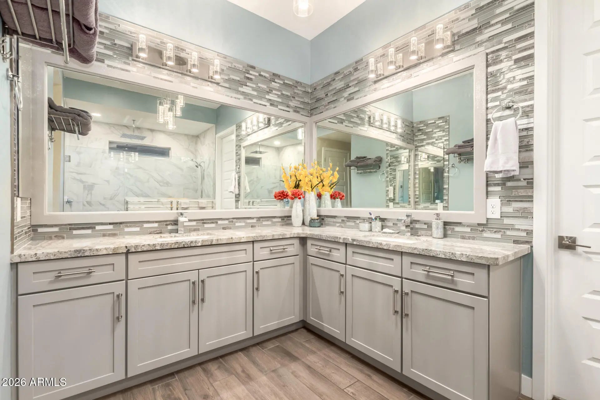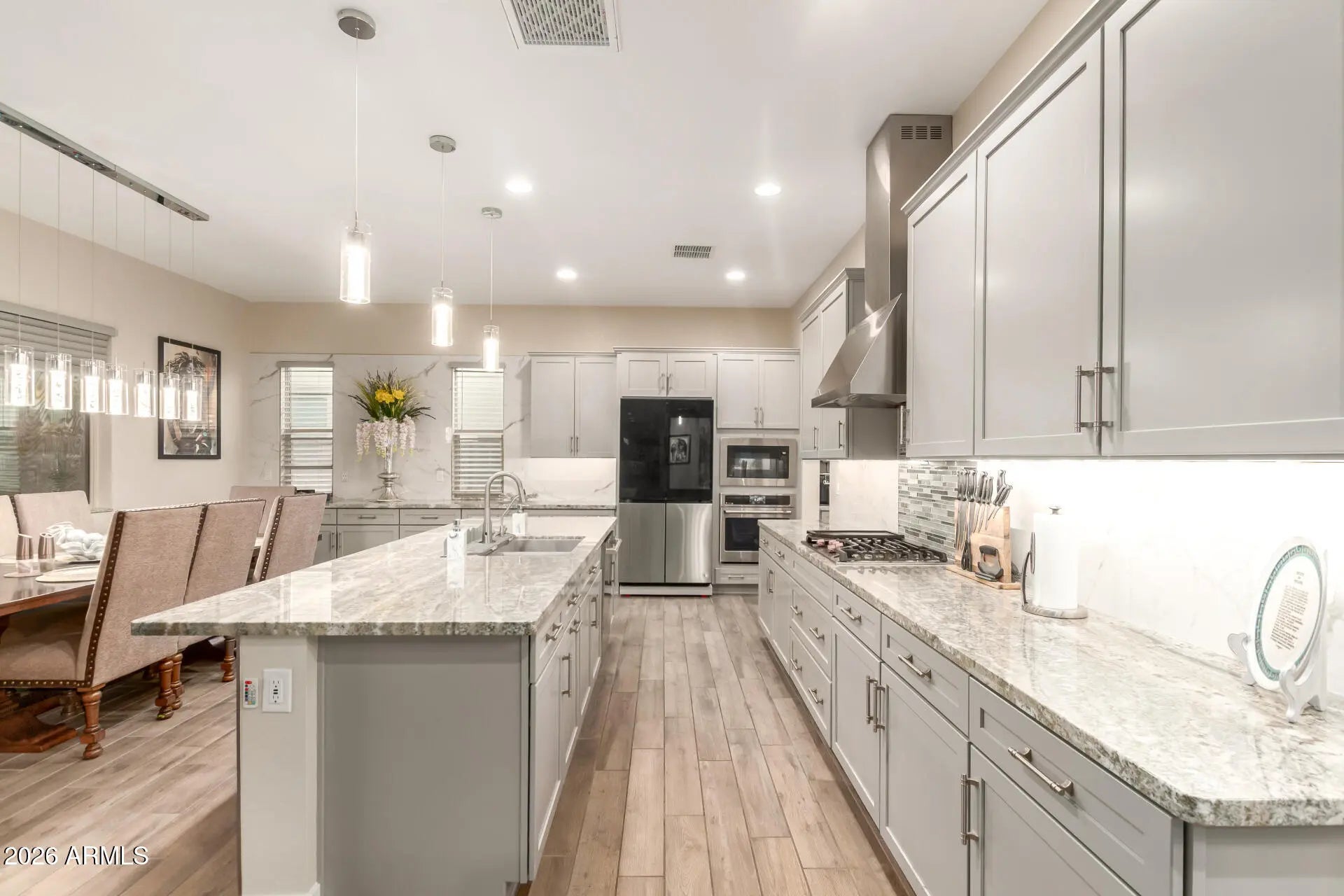Impeccably upgraded and truly move-in ready, this exceptional home features over $100k + in thoughtfully curated, high-end enhancements, with every detail intentionally designed and flawlessly executed. Striking designer landscaping creates unforgettable curb appeal and sets the tone from the moment you arrive. The heart of the home is a chef-inspired kitchen with premium Café appliances, custom finishes, and a layout that blends beauty and function ideal for both everyday living and entertaining. The primary retreat offers a serene escape, highlighted by a spa-like ensuite with an indulgent shower and refined finishes throughout. Outdoors, a resort-style backyard invites year-round enjoyment with an outdoor kitchen, multiple pergolas, and spaces designed for both relaxation & gathering. The garage is a standout feature, offering epoxy flooring, a dedicated work area, and custom built-in storage, perfectly designed for organization, hobbies, and functionality. Added bonus, a whole-home water filtration and softening system, adding comfort and long-term value. Located in one of Goodyear's most desirable 55+ active adult communities. Community amenities include 29,000. sqft Village Center, Cafe & Bar, 2,000 sqft Fitness Room, Aerobic & Yoga Room, Locker Rooms, Tech Wing, Event Room, Art Studio, Dog Park, Pickleball Courts, Bocce Ball Courts, Tennis Courts, Hiking /Biking Trails. Don't miss the opportunity to make this exquisite residence your own and experience luxury living at its finest!