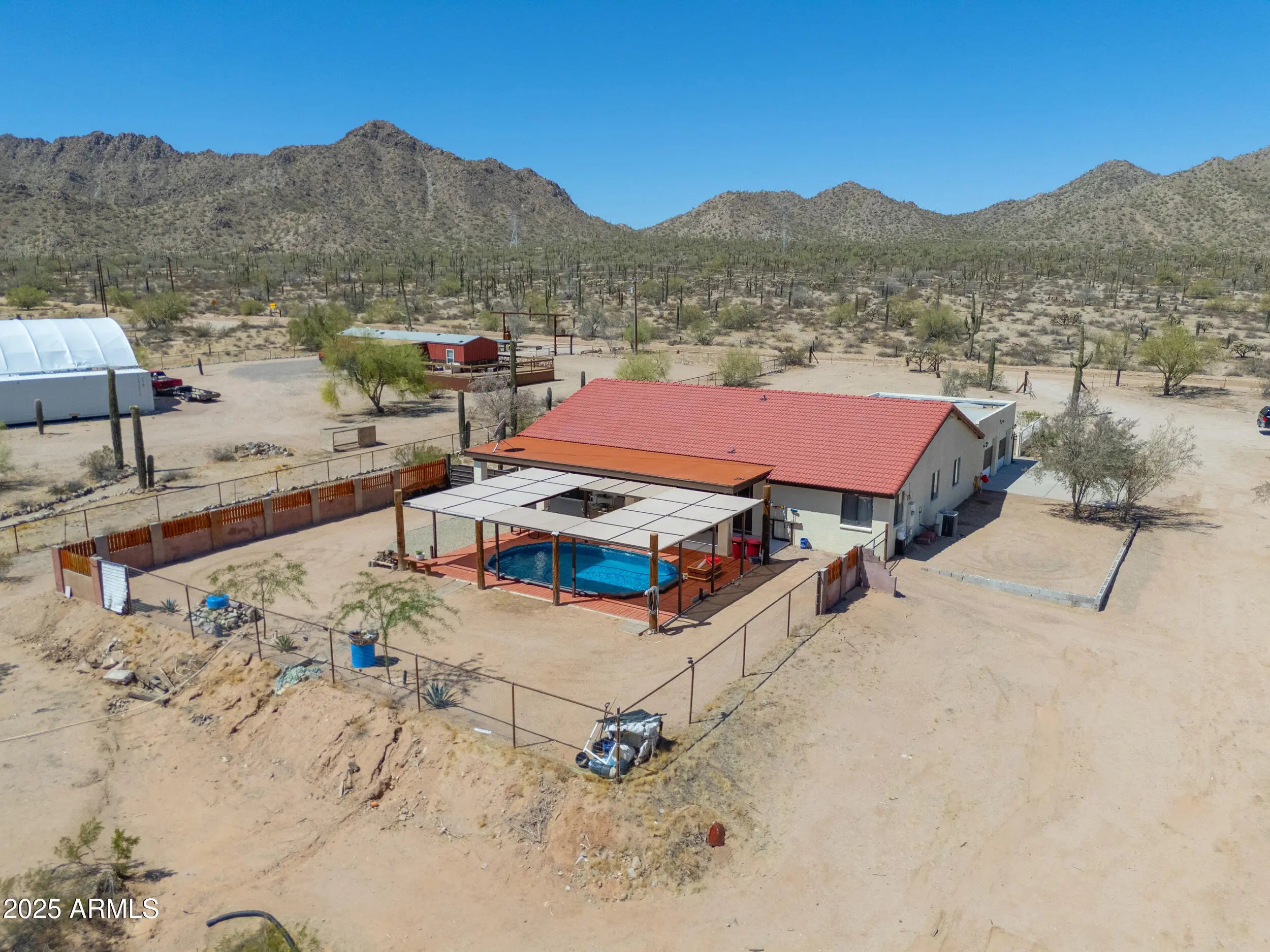 Welcome to your private desert retreat! Nestled on 3 acres of pristine desert, this steel framed home offers unmatched tranquility and stunning mountain views. Enjoy wide open skies and serene surroundings with BLM land directly across the street, perfect for exploring nature right from your doorstep. Step outside to a shaded front patio, perfect for sipping morning coffee while soaking in panoramic vistas. Out back, unwind in the liner pool, artfully set into the ground and covered by a shade structure, an ideal spot for entertainment or relaxation. Whether you're looking for a peaceful full-time residence or a winter escape, this home provides comfort, space and beauty of desert living!