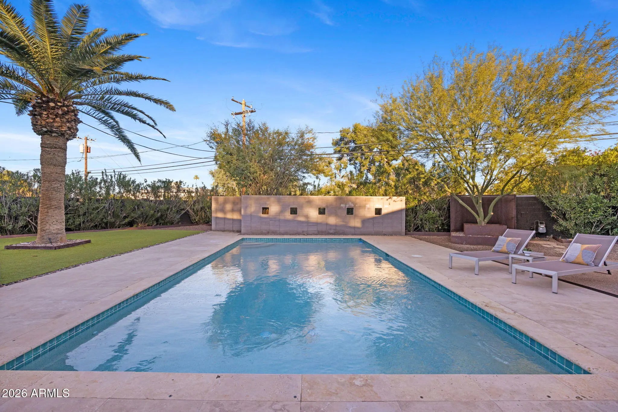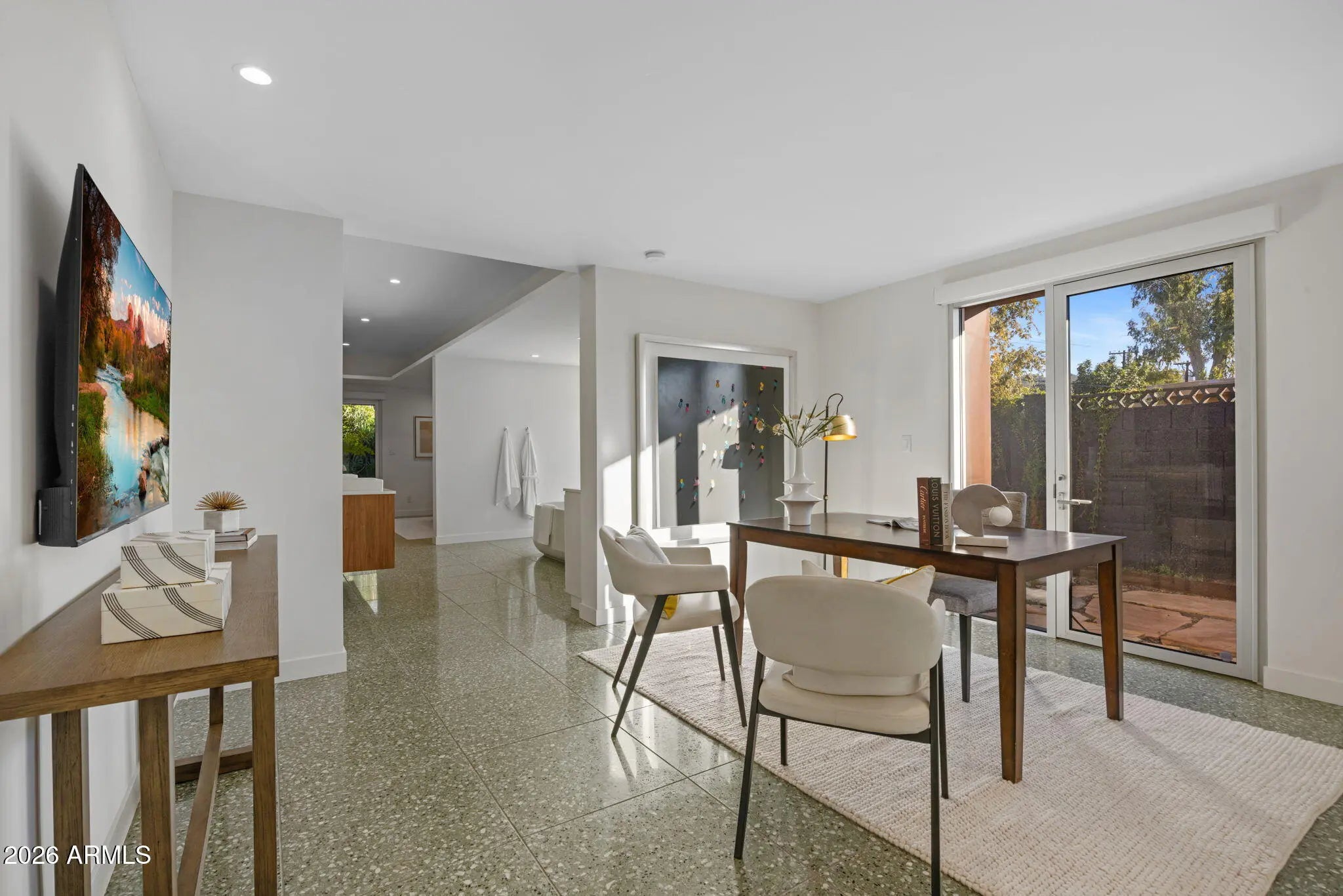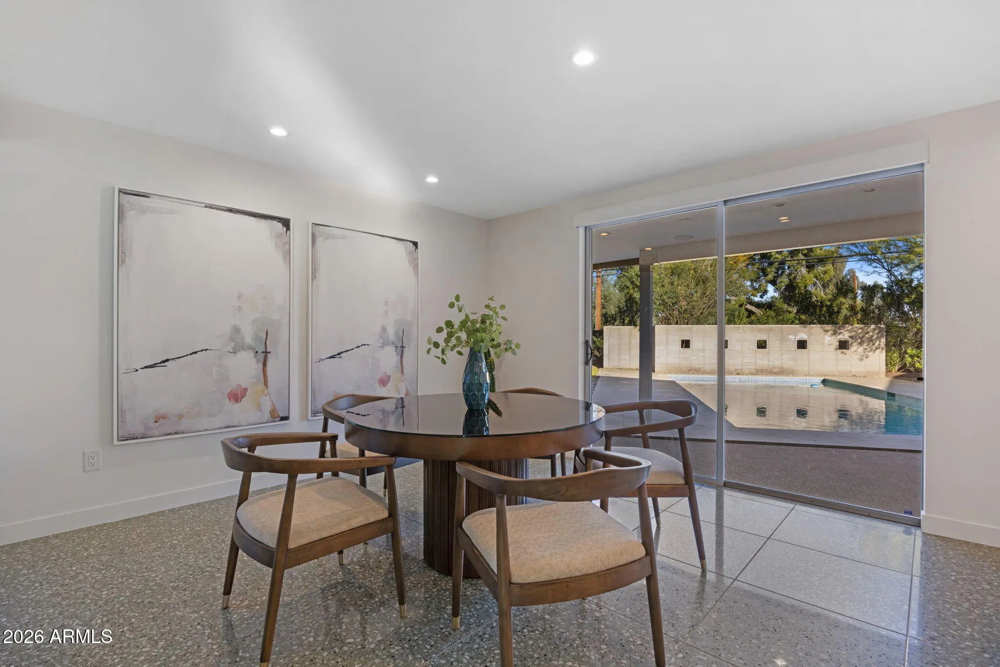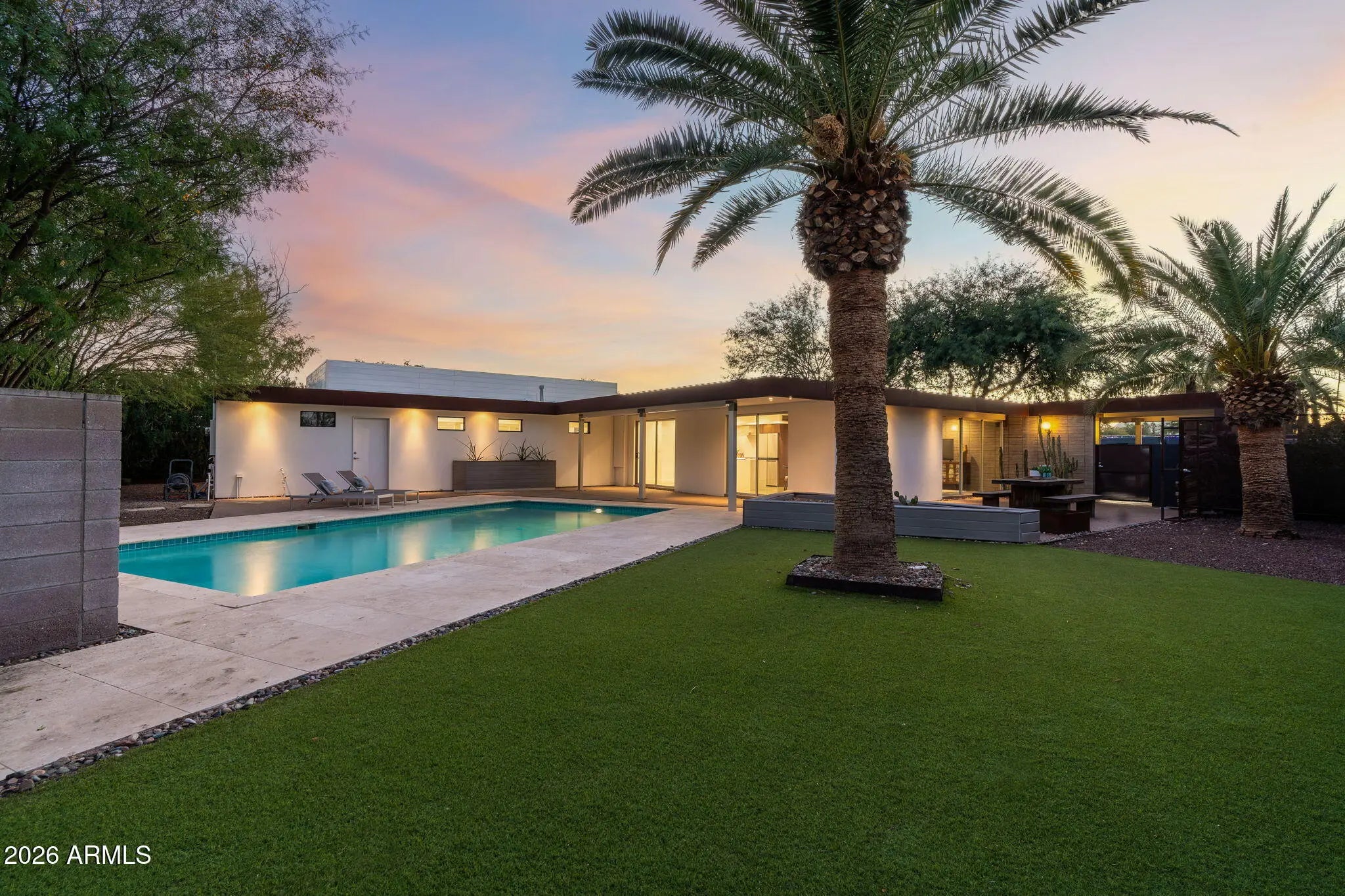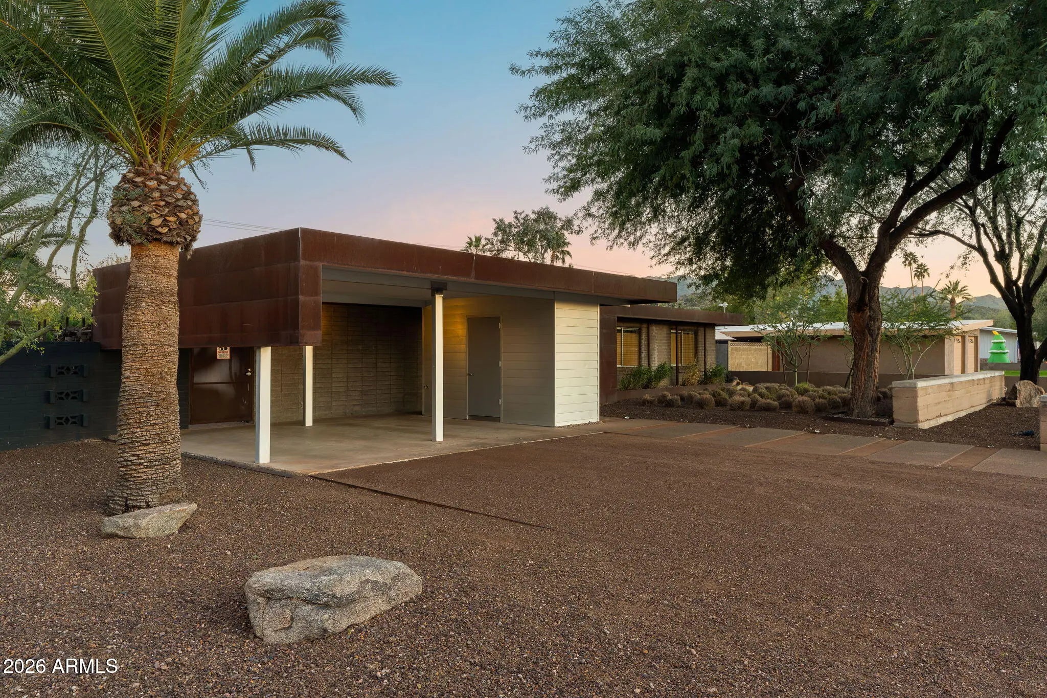 Located in Paradise Gardens, one of the only Phoenix neighborhoods designed by renowned architect Al Beadle, this fully renovated Cholla Model represents a rare opportunity to own an authentic example of mid-century desert modernism. Built in 1959, the home preserves Beadle's original architectural vision while integrating thoughtful modern updates. The residence offers 2,328 square feet with 3 bedrooms, 2 bathrooms, a dedicated office, and a private swimming pool. Original design elements include terrazzo flooring, rammed earth construction, breeze block walls, stacked glass, and steel fascia detailing. The home has been fully renovated with careful attention to maintaining its architectural integrity. The Euro-style kitchen features a waterfall island, modern cabinetry, and clean-lined finishes that align with the home's minimalist design language. Bathrooms have been updated with spa-inspired materials and fixtures. Lutron automated shades provide seamless light control throughout the living spaces. Interior and exterior finishes have been refreshed, and the pool has been resurfaced. The property includes a carport and sits approximately 0.5 miles from Shea Boulevard, about 1 mile from SR-51 access, and near the new Paradise Valley Mall redevelopment featuring Whole Foods, Sephora, Trevor's Liquor, and Flower Child. Central Phoenix, Paradise Valley, and Scottsdale destinations are easily accessible. Homes in Paradise Gardens are infrequently available, particularly those that retain original Al Beadle design elements alongside modern renovations. This property offers a rare opportunity to own a historically significant mid-century residence in a neighborhood recognized for its architectural pedigree.